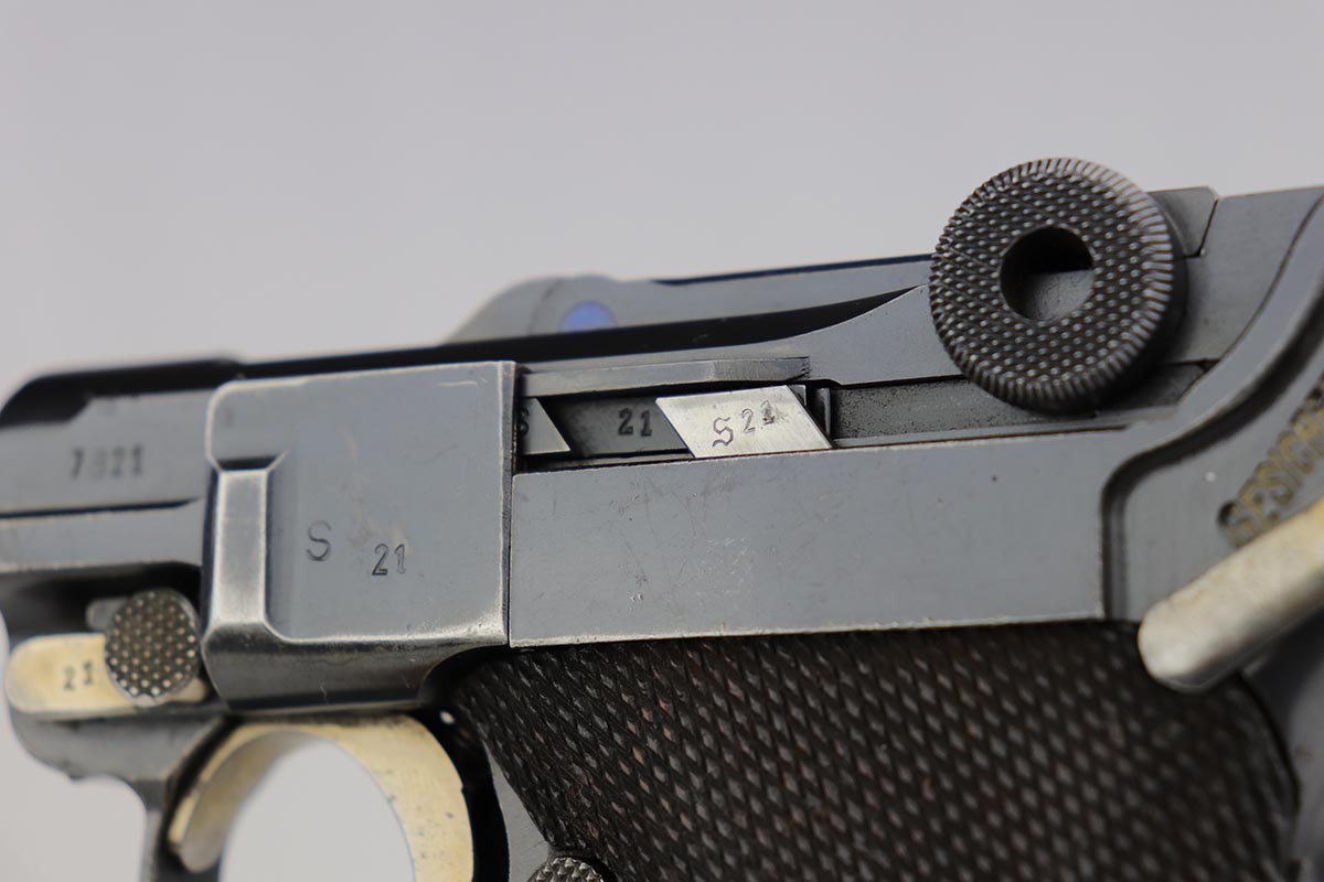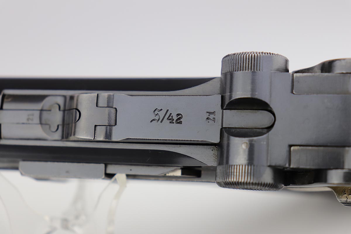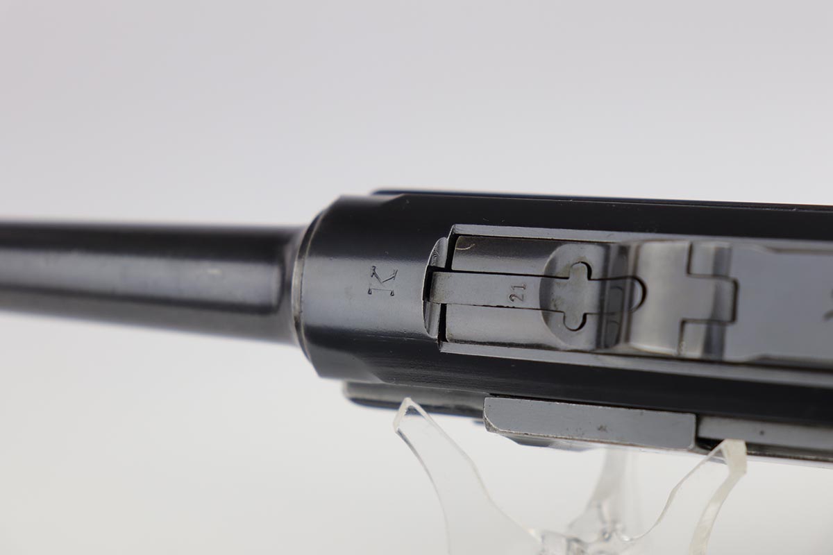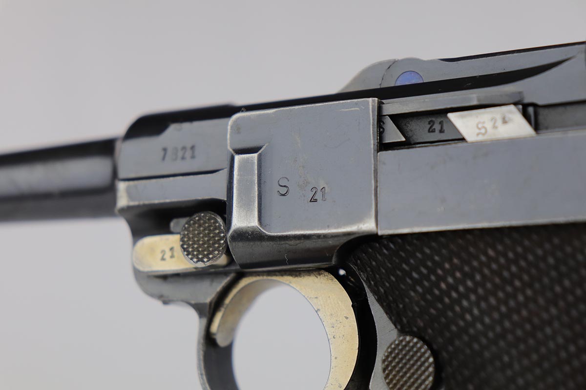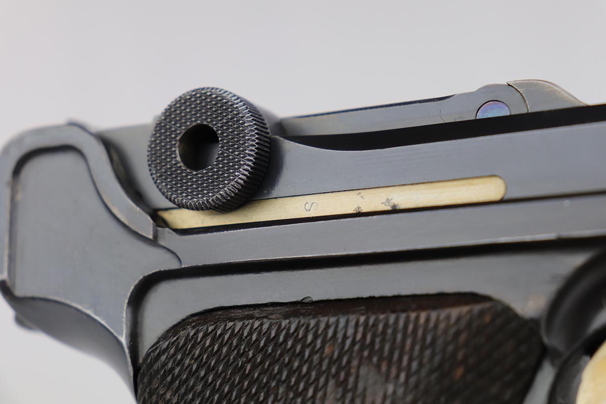7/25/19 – This is a hard to find K Date Luger in very good, original condition. Made in 1934, it has about 90% of its original finish remaining, with most of the wear on the straps and high points. There is some patina to the straps, and some freckling on the left side of the muzzle. These guns were produced with the ‘K’ code in 1934, and many saw action so they are difficult to find in excellent condition. This one has all matching numbers except the magazine, but including the matching grips. There were only about 10,000 of this variation produced, and not many can be found in good, original condition at this point. There is a mixture of Gothic and contemporary ‘S’ marks which is correct for this serial range K date. The S can be found on the sideplate, ejector, firing pin, safety lever and other parts. Halos under the barrel and recessed front sight make this one an all correct K Date. The magazine is a proper B90 proofed example but numbered to another pistol. The grips show some age and handling wear but no major cracks or chips. The bore is shiny with strong rifling, and only minor signs of use.