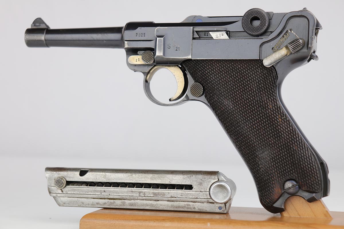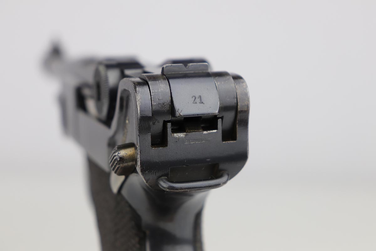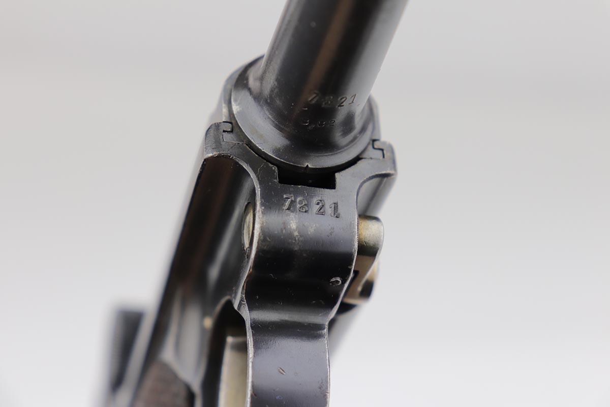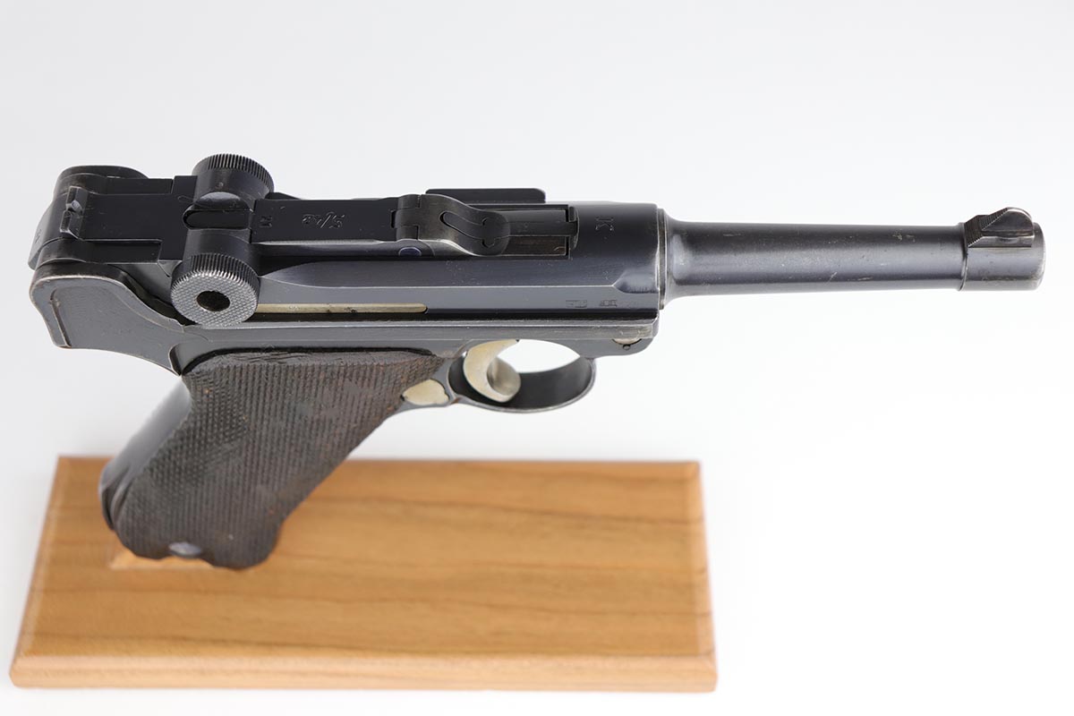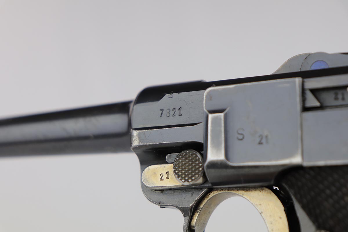 7/25/19 – This is a hard to find K Date Luger in very good, original condition. Made in 1934, it has about 90% of its original finish remaining, with most of the wear on the straps and high points. There is some patina to the straps, and some freckling on the left side of the muzzle. These guns were produced with the ‘K’ code in 1934, and many saw action so they are difficult to find in excellent condition. This one has all matching numbers except the magazine, but including the matching grips. There were only about 10,000 of this variation produced, and not many can be found in good, original condition at this point. There is a mixture of Gothic and contemporary ‘S’ marks which is correct for this serial range K date. The S can be found on the sideplate, ejector, firing pin, safety lever and other parts. Halos under the barrel and recessed front sight make this one an all correct K Date. The magazine is a proper B90 proofed example but numbered to another pistol. The grips show some age and handling wear but no major cracks or chips. The bore is shiny with strong rifling, and only minor signs of use.