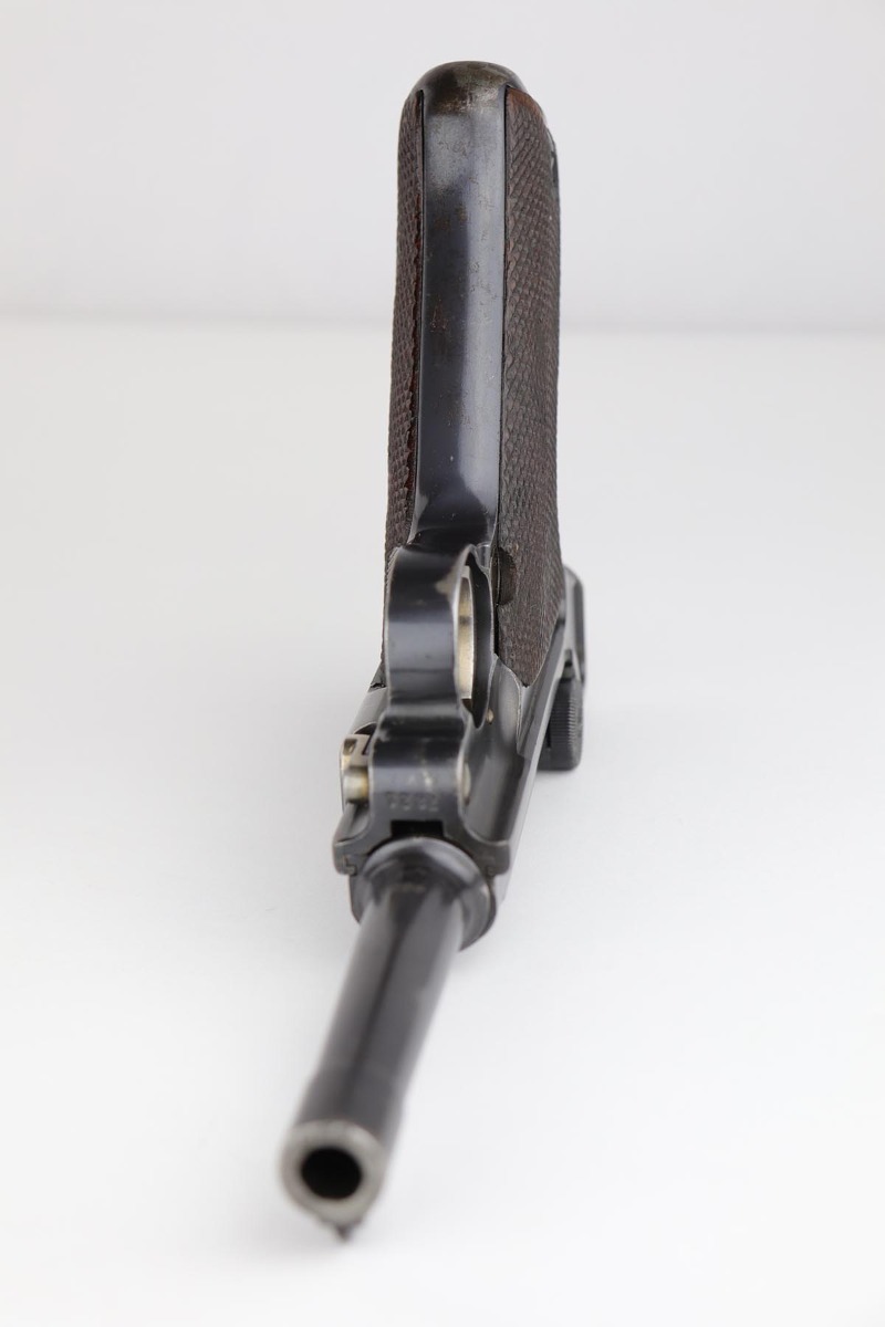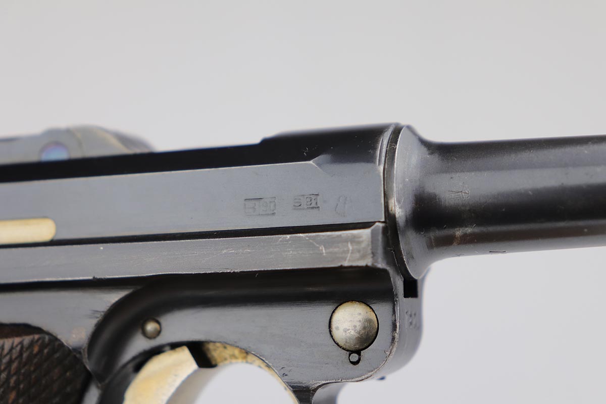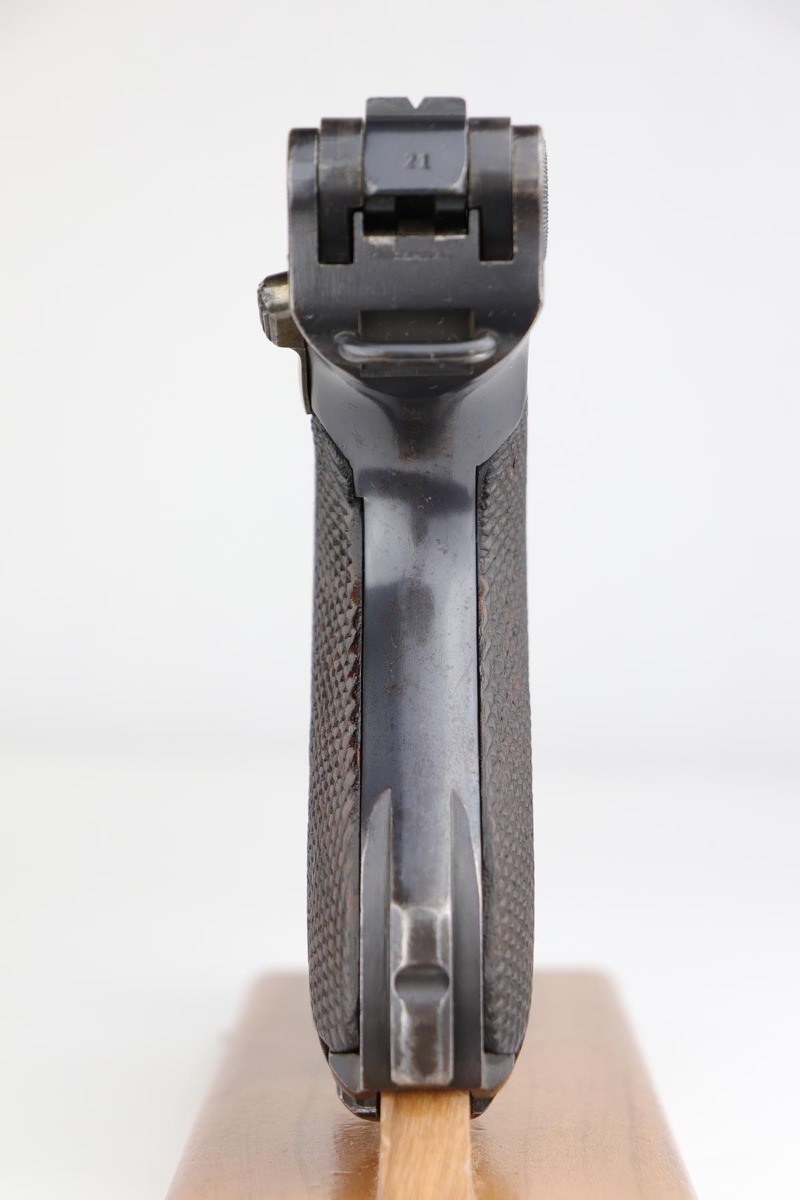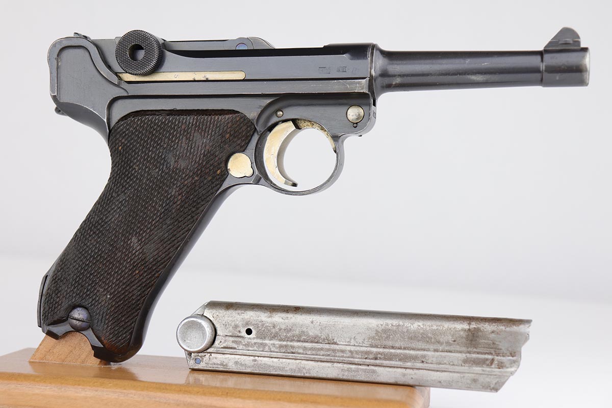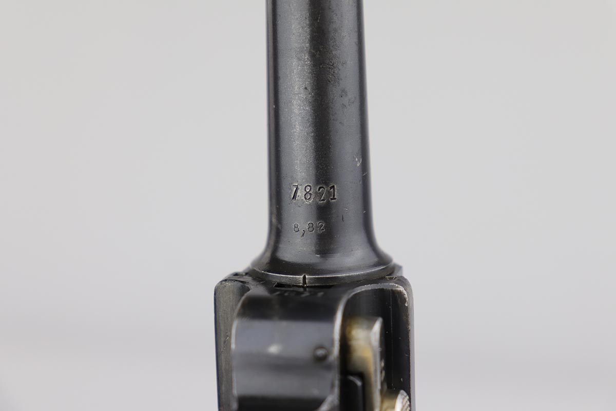 7/25/19 – This is a hard to find K Date Luger in very good, original condition. Made in 1934, it has about 90% of its original finish remaining, with most of the wear on the straps and high points. There is some patina to the straps, and some freckling on the left side of the muzzle. These guns were produced with the ‘K’ code in 1934, and many saw action so they are difficult to find in excellent condition. This one has all matching numbers except the magazine, but including the matching grips. There were only about 10,000 of this variation produced, and not many can be found in good, original condition at this point. There is a mixture of Gothic and contemporary ‘S’ marks which is correct for this serial range K date. The S can be found on the sideplate, ejector, firing pin, safety lever and other parts. Halos under the barrel and recessed front sight make this one an all correct K Date. The magazine is a proper B90 proofed example but numbered to another pistol. The grips show some age and handling wear but no major cracks or chips. The bore is shiny with strong rifling, and only minor signs of use.