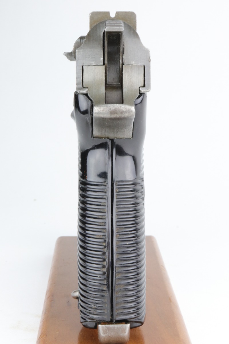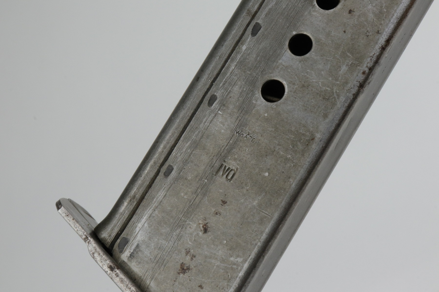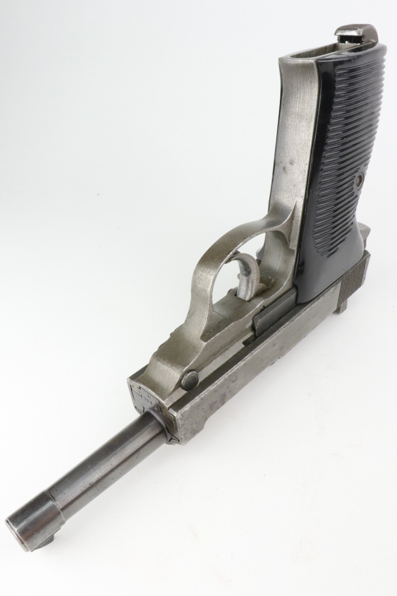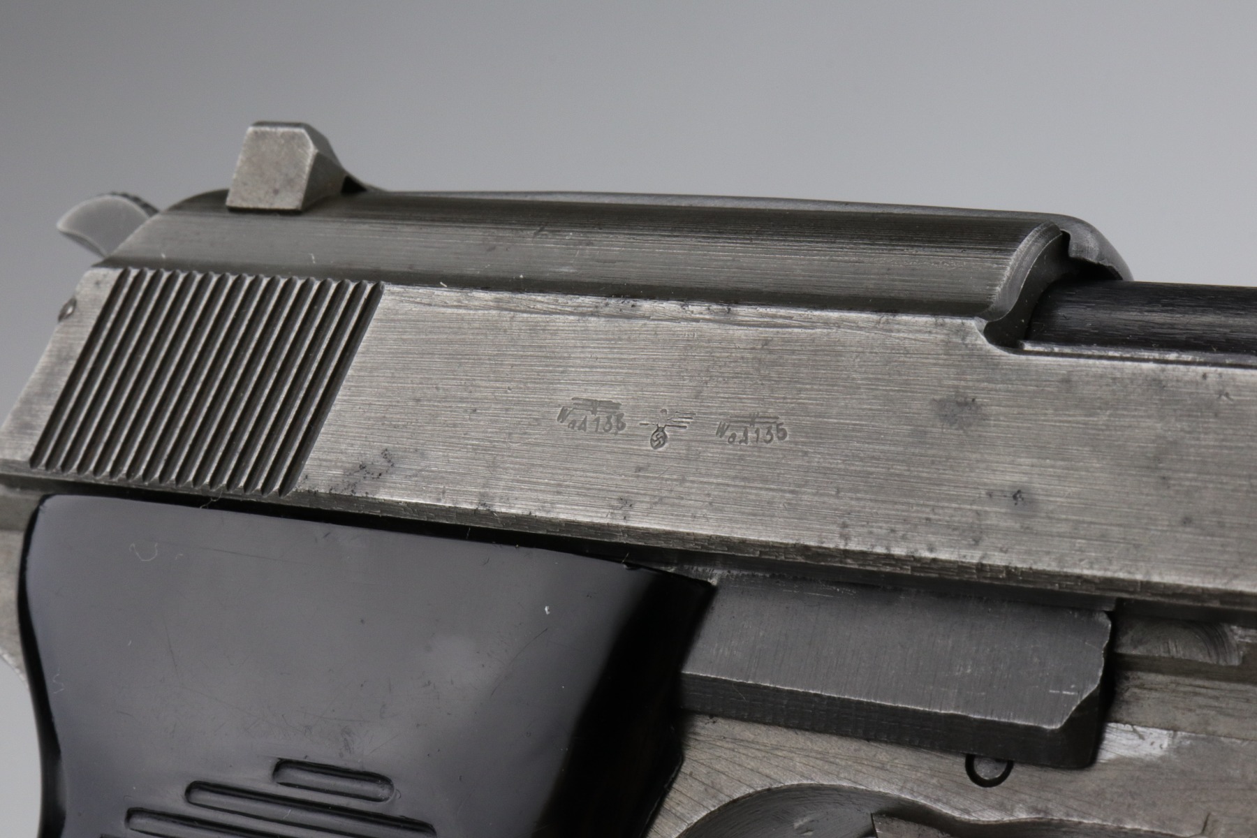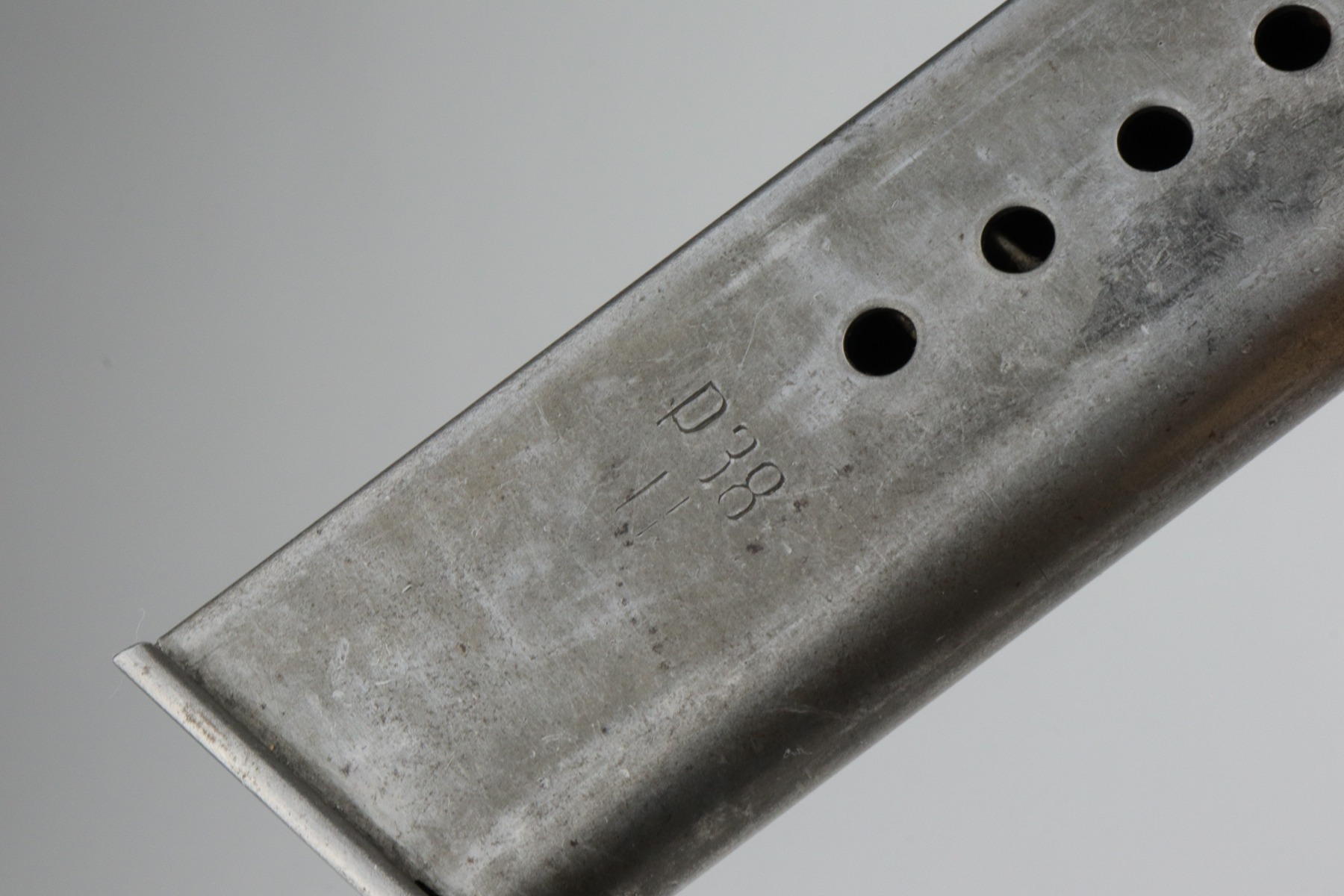 2/21/22 – This is a very nice example of a rare Mauser P.38 issued to the Nazi military in 1945 – marked “svw 45”. There were only 15,000 SVW 45’s produced, and over 346,000 total Mauser P.38’s produced during the war (Jan Still, Axis Pistols). These SVW’s are rare and Legacy does not get them often. This gun has a dual-tone finish, with a phosphate slide and frame, but blued barrel. This one is all matching and has the proper “Waffen 135” military proofs. The nature of the phosphate frame makes it difficult to rate, but we estimate it has retained about 90%. As is typical with phosphate, there is spotty oxidation throughout. There is thinning on the front strap and wear around some of the high edges. It comes with excellent grips and a rare phosphated magazine. The bore is excellent – shiny with strong rifling. De-cocker is functional.