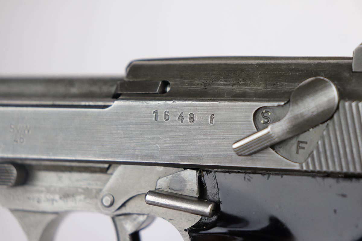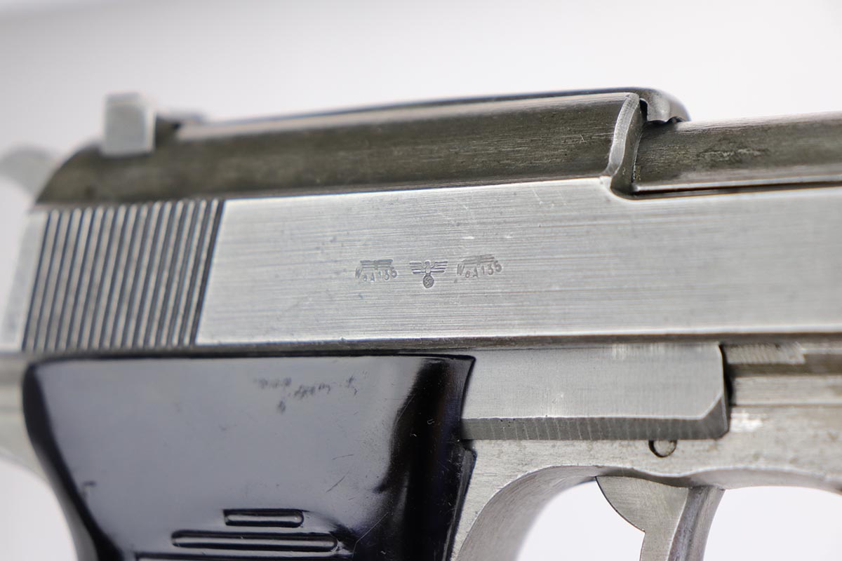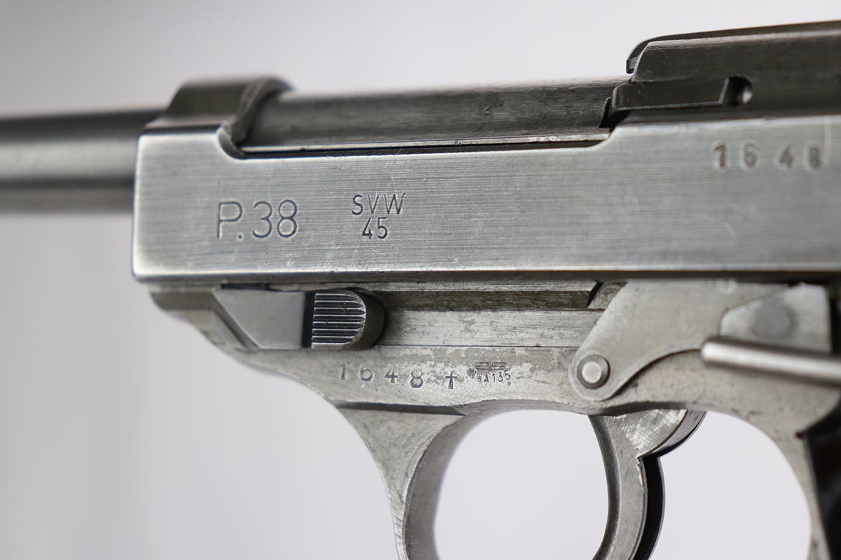 12/9/19 – This is a rare Nazi Mauser P.38 from 1945, with all phosphate parts. It is “svw 45” marked on the slide, of which there were only 15,000 such pistols issued to the German Army. A much smaller portion of that lot has all phosphate parts. The finish on the gun shows some minor thinning throughout, so it’s a little tough to rate, but there’s no major areas of wear or patches of finish loss. All matching numbers. Terrific bore. Grips are in good shape but do have some scratches on both sides.