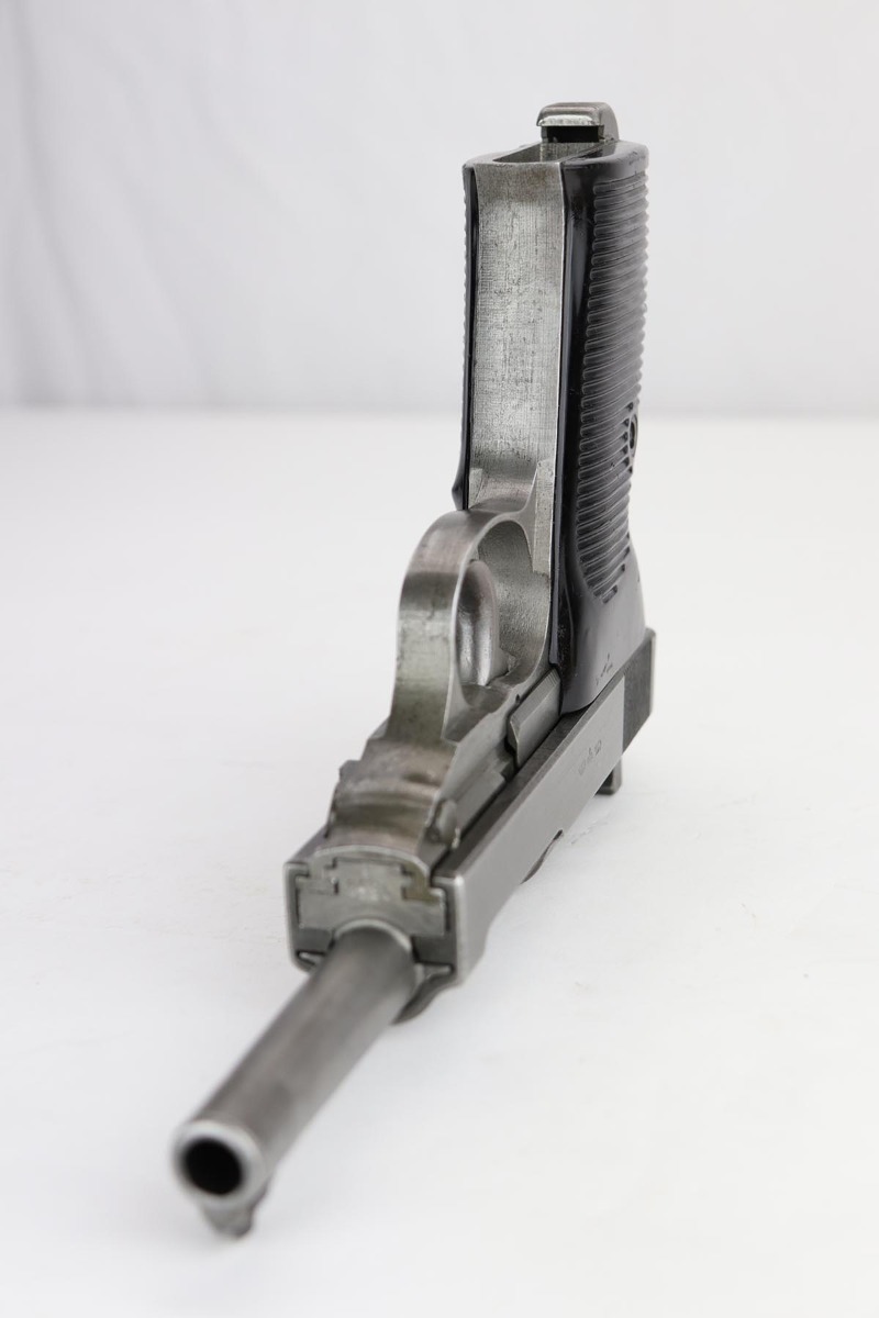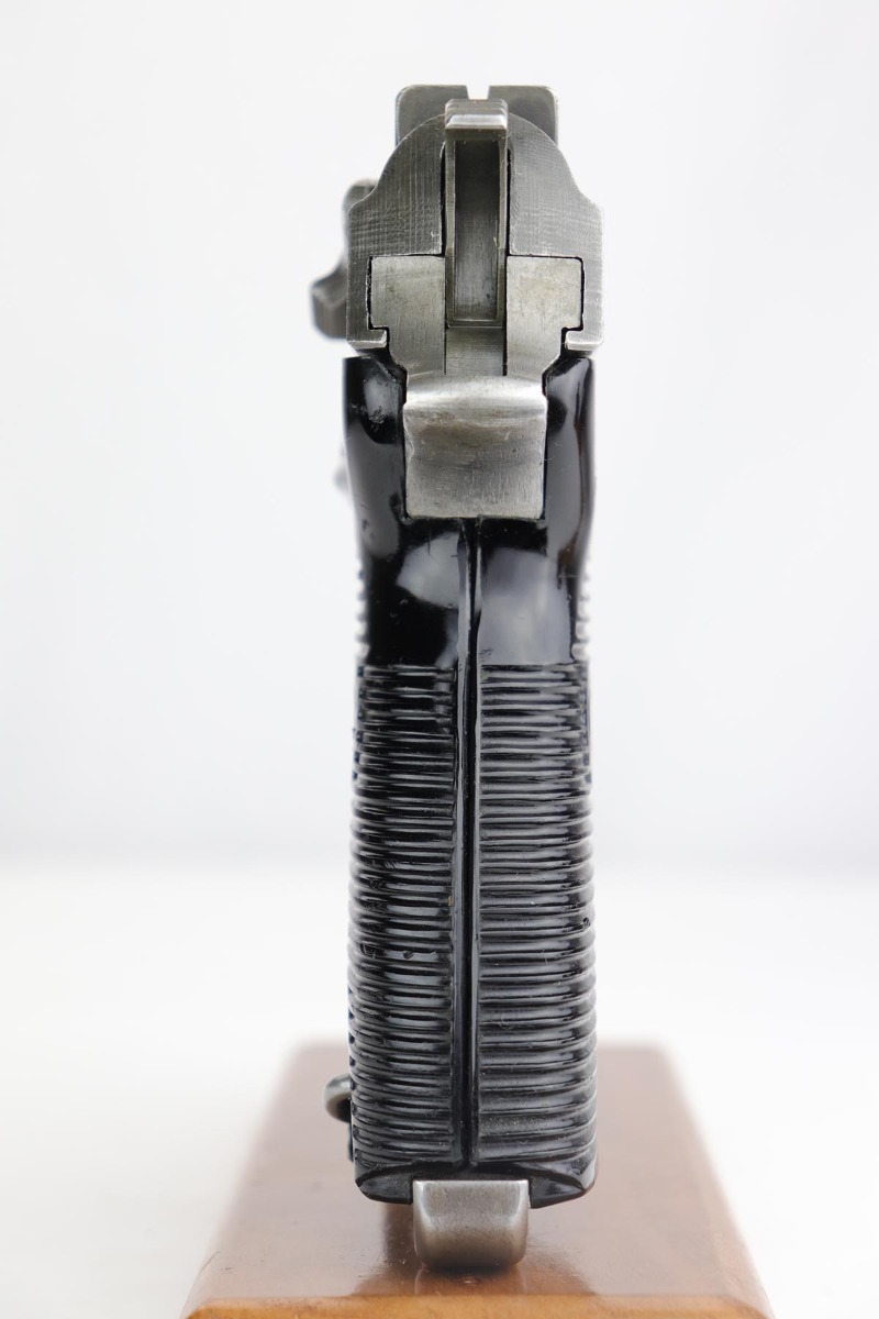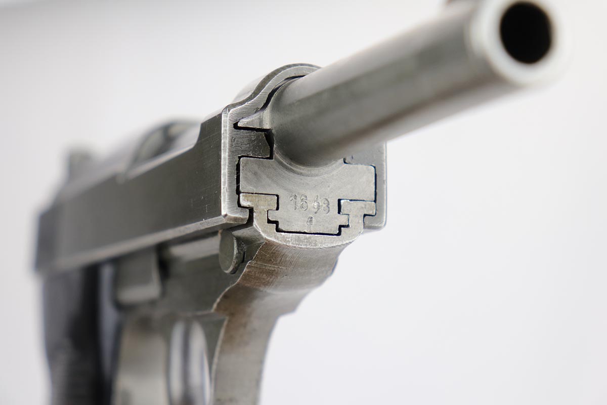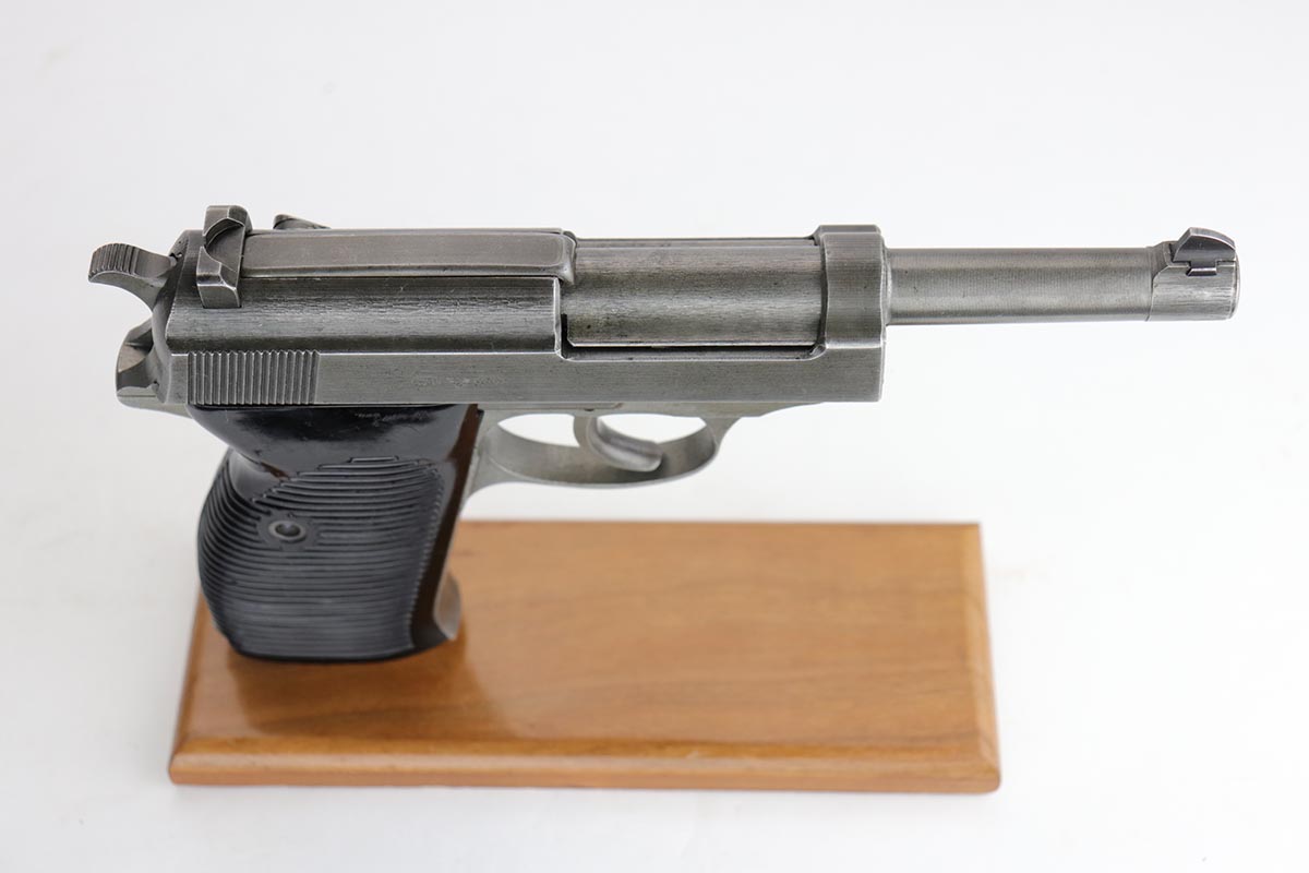 12/9/19 – This is a rare Nazi Mauser P.38 from 1945, with all phosphate parts. It is “svw 45” marked on the slide, of which there were only 15,000 such pistols issued to the German Army. A much smaller portion of that lot has all phosphate parts. The finish on the gun shows some minor thinning throughout, so it’s a little tough to rate, but there’s no major areas of wear or patches of finish loss. All matching numbers. Terrific bore. Grips are in good shape but do have some scratches on both sides.