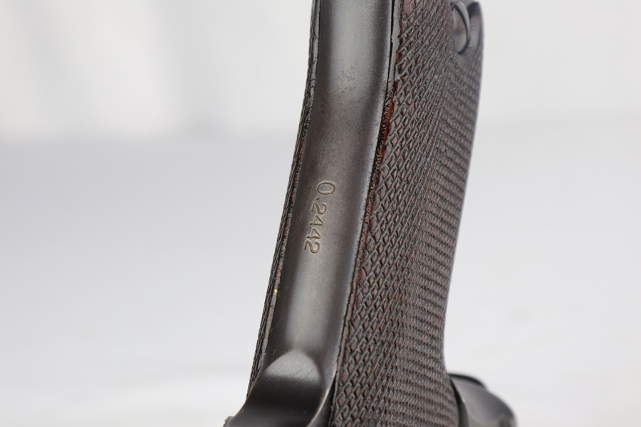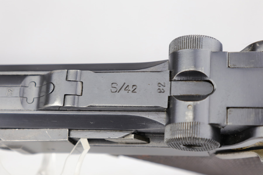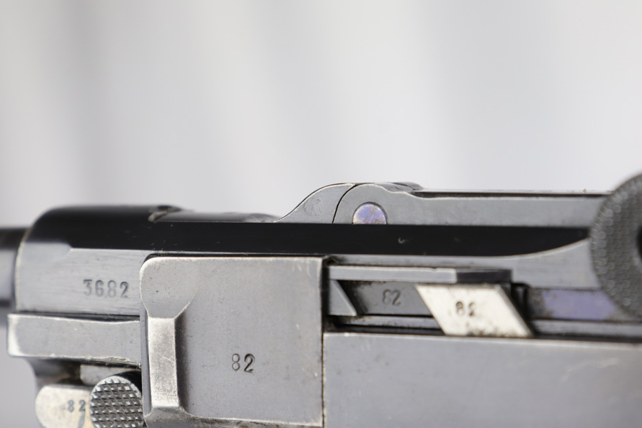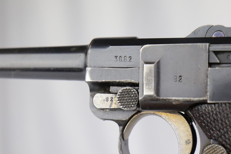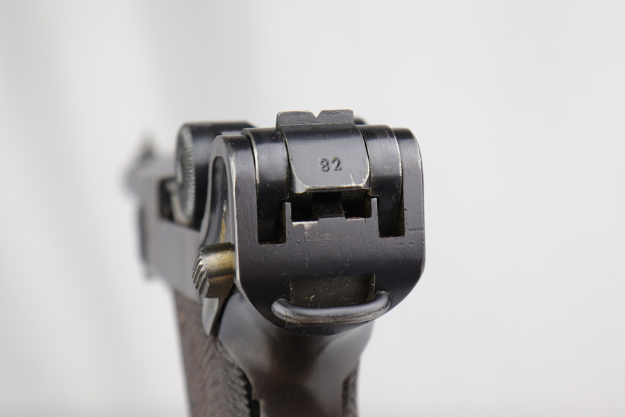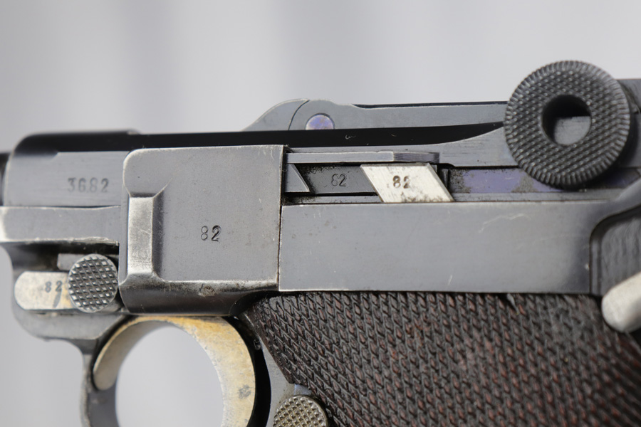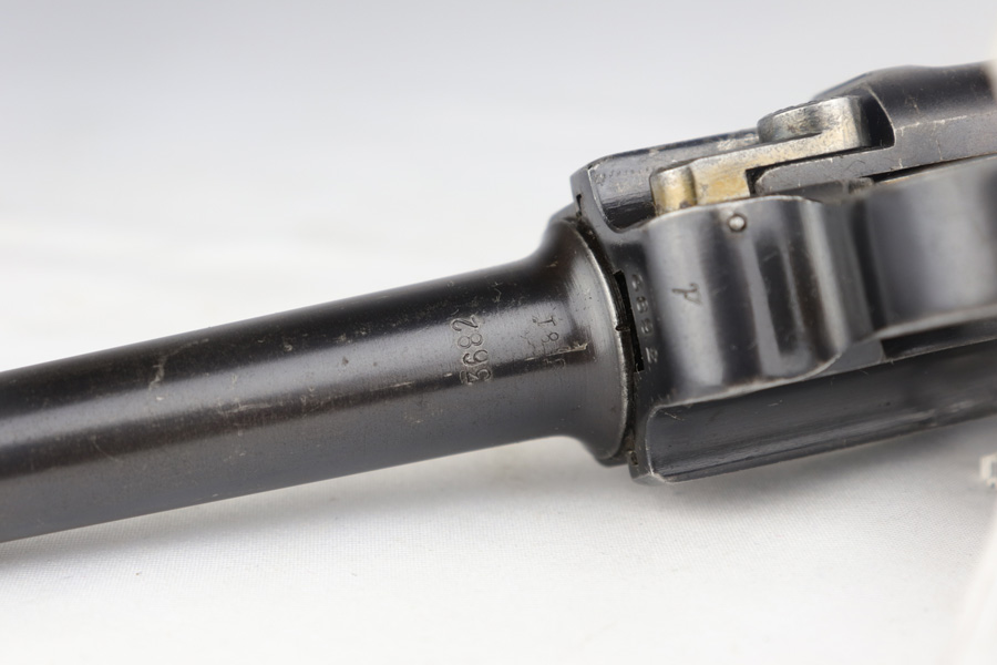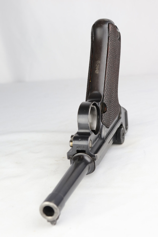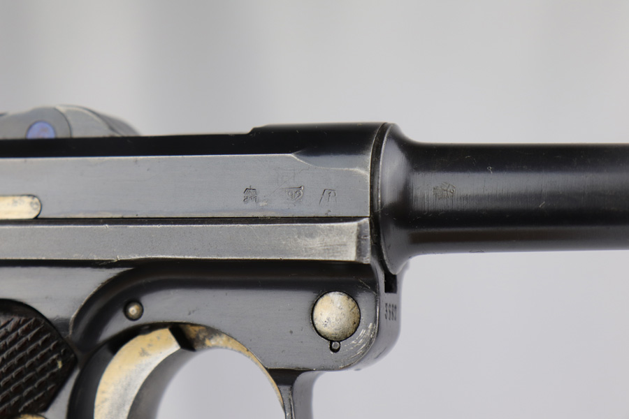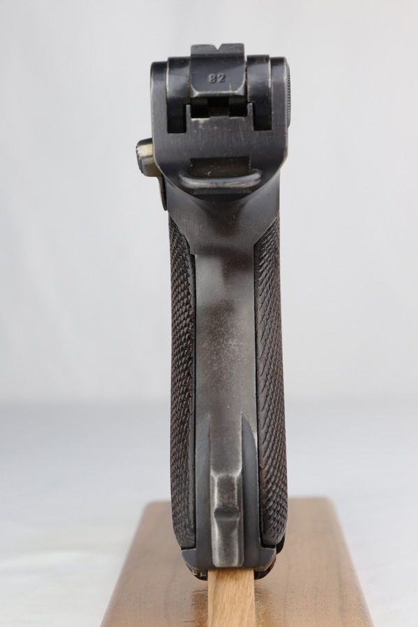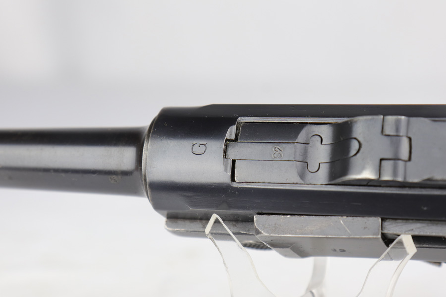 2/27/19 – This is an incredibly hard to find G Date Mauser Luger rig that was issued to the German Navy. There were only 700 such G Date Lugers sent to the Navy, and this one is especially rare as it is the less common O-property mark and comes with one of the original, matching magazines. The O-property G Dates were not marked with the Kriegsmarine Eagle, just the property number on the front strap, and their magazines were not Navy marked, either. This pistol is all matching and original with 85-90% original blue. There is high edge wear from the holster and some browning to the finish, especially on the straps. The grips are not numbered, and the rig includes a second, rare W/154 marked magazine that doesn’t match the pistol. There is an Eagle/63 marked tool in the pouch, and the rig is completed by a rare and desirable 1936 holster with clear Navy Eagle marking.