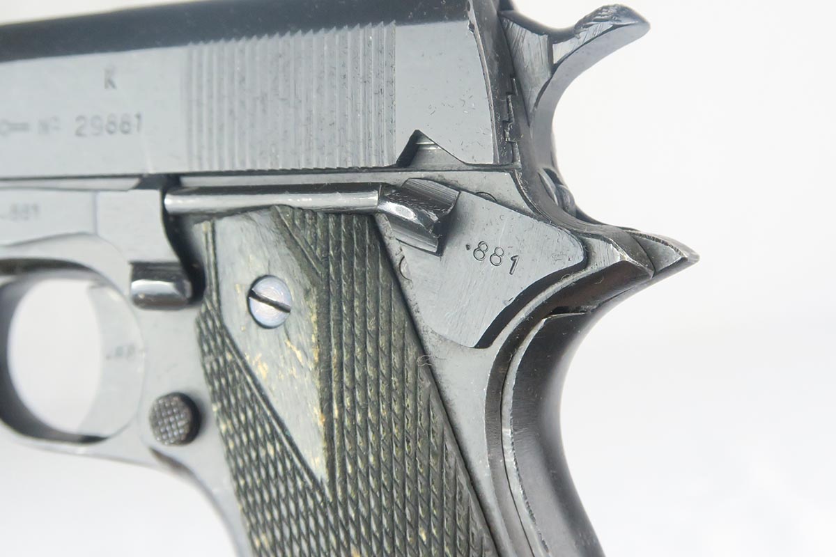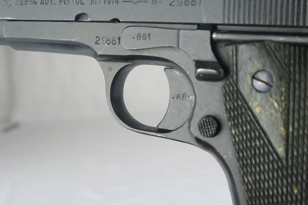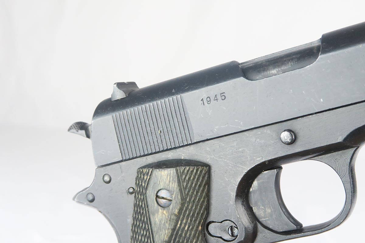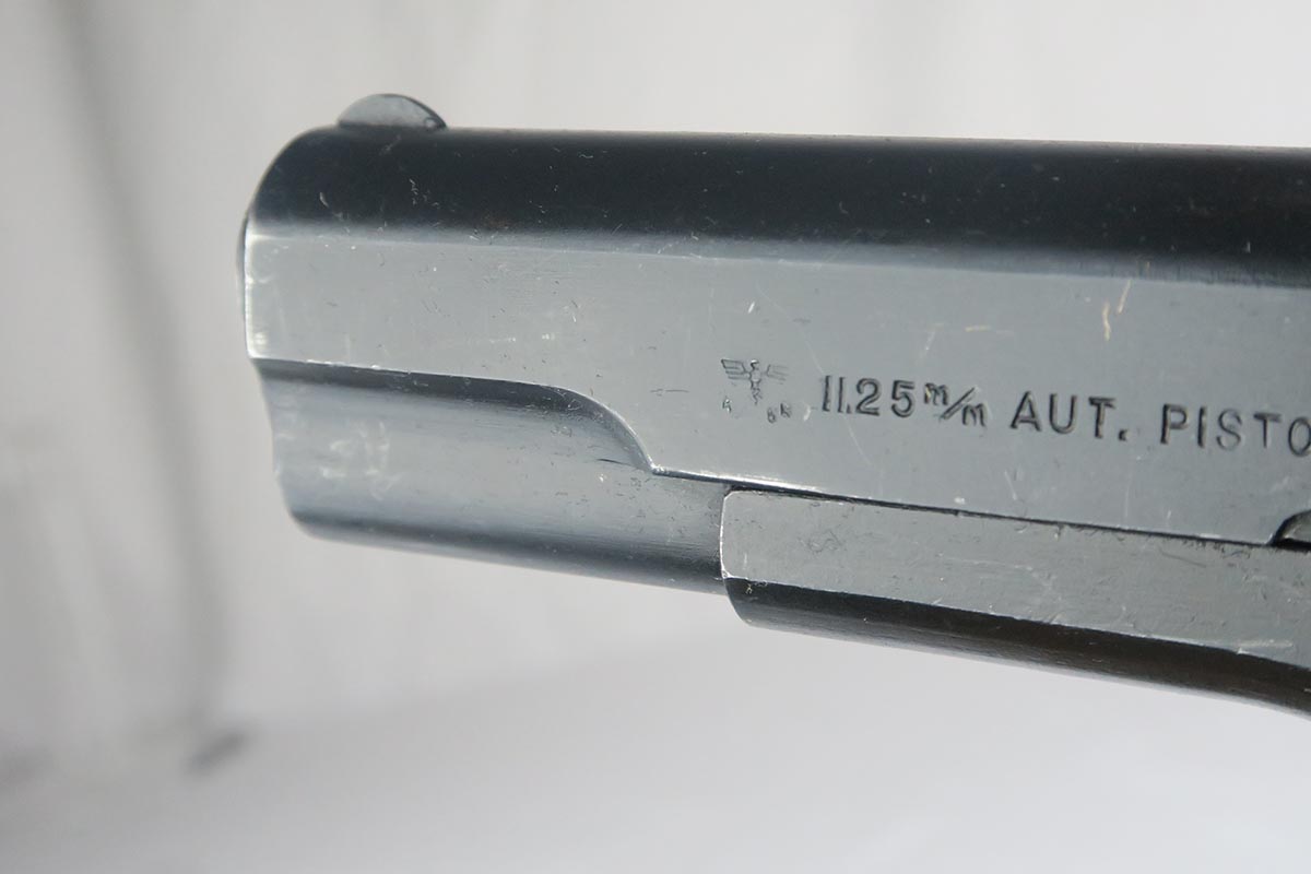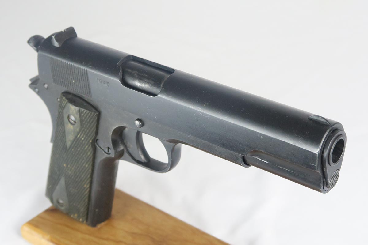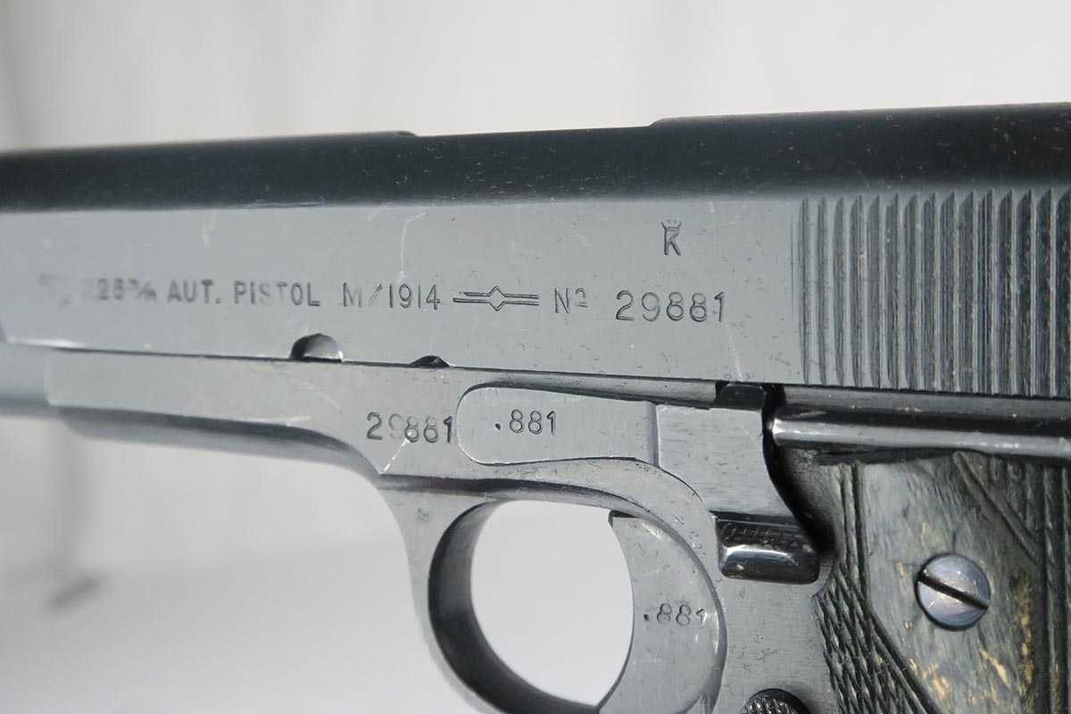 2/6/18 – This is an excellent Kongsberg Colt model 1914, manufactured in 1945 and issued to the Nazi Army.  These are rare pistols, and this one is all original and correct.  The finish rates at 97+% with minor scuff marks on the slide and frame.   Colt licensed out production of the 1911 to Kongsberg Vaapenfabrik in Norway, who in 1945 produced less than 1,000 of this waffen variation according to Jan Still’s book. This particular piece falls in the documented serial range of 29261-30523, where only ~30-50 have been reported. It has the original matte blue finish and stained birch grips, which have retained a good portion of the dark stain finish. The gun is 1945 dated, and it is stamped along the left side of the slide “11.25m/m AUT. PISTOL M/1914” followed by the serial number, above which is a crown/K inspector proof. To the left of this stamp is an E/WaA84 nazi proof, showing this gun was delivered to the German occupying forces in Norway.  The barrel is numbered to the pistol.. Bore is excellent, all parts are original and matching and gun comes with original loop magazine.