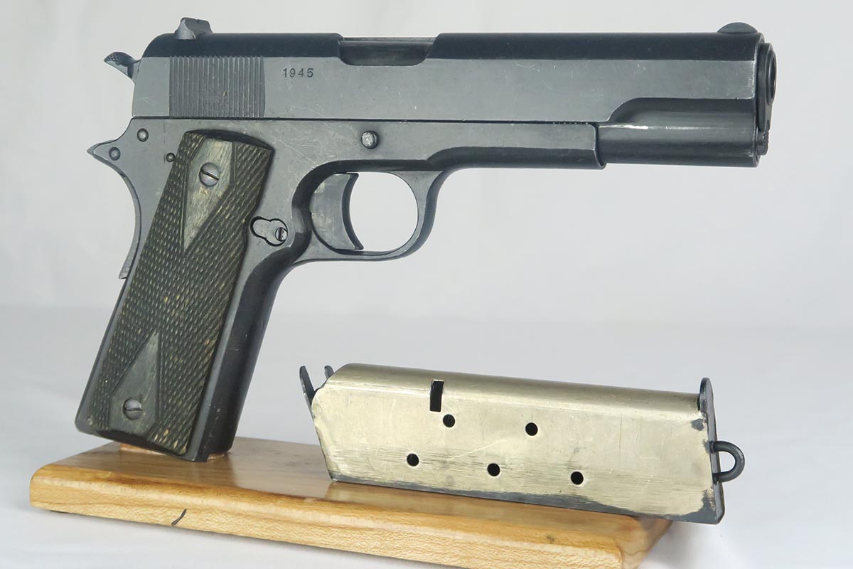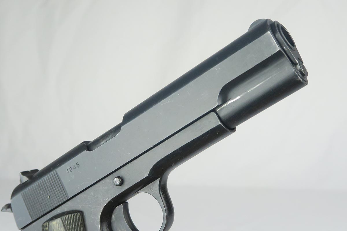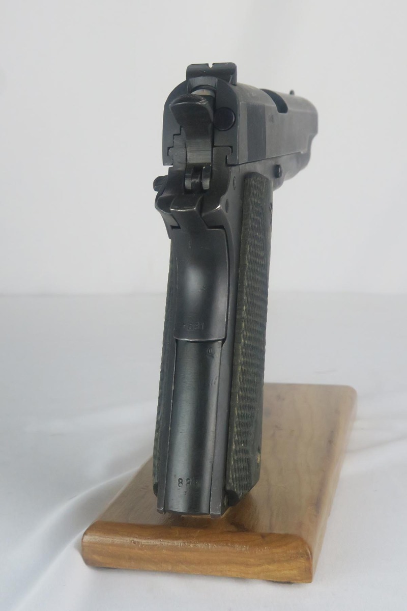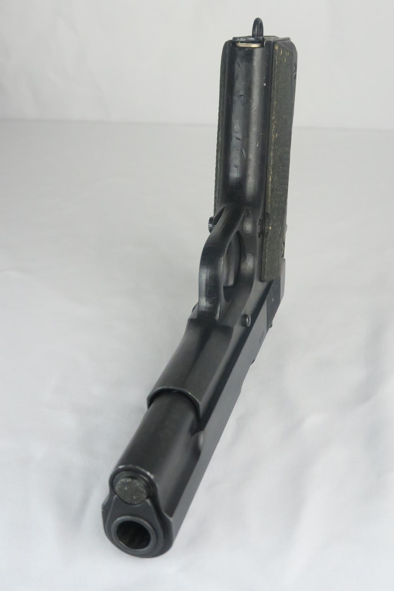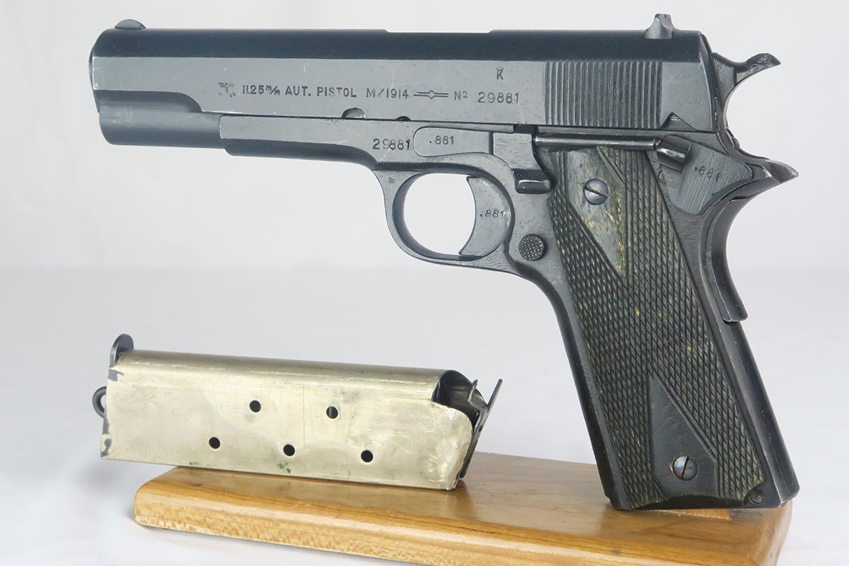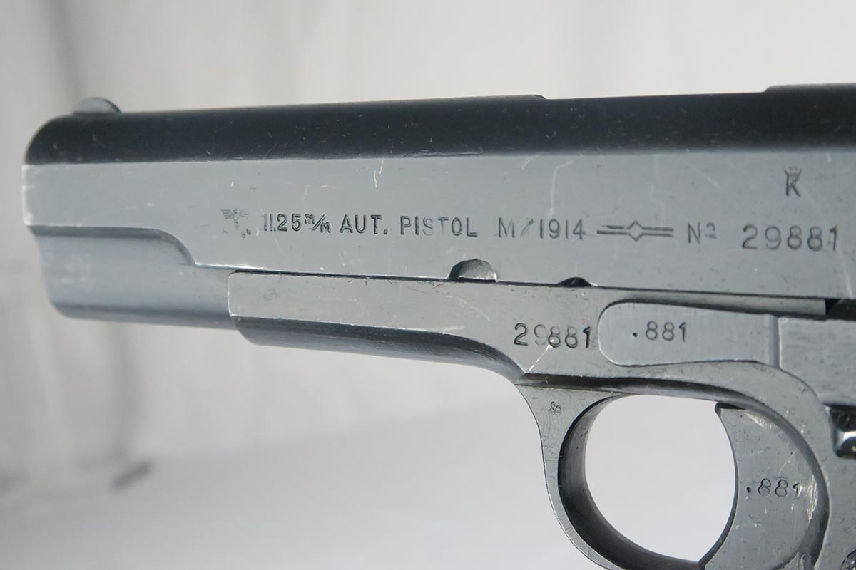 2/6/18 – This is an excellent Kongsberg Colt model 1914, manufactured in 1945 and issued to the Nazi Army.  These are rare pistols, and this one is all original and correct.  The finish rates at 97+% with minor scuff marks on the slide and frame.   Colt licensed out production of the 1911 to Kongsberg Vaapenfabrik in Norway, who in 1945 produced less than 1,000 of this waffen variation according to Jan Still’s book. This particular piece falls in the documented serial range of 29261-30523, where only ~30-50 have been reported. It has the original matte blue finish and stained birch grips, which have retained a good portion of the dark stain finish. The gun is 1945 dated, and it is stamped along the left side of the slide “11.25m/m AUT. PISTOL M/1914” followed by the serial number, above which is a crown/K inspector proof. To the left of this stamp is an E/WaA84 nazi proof, showing this gun was delivered to the German occupying forces in Norway.  The barrel is numbered to the pistol.. Bore is excellent, all parts are original and matching and gun comes with original loop magazine.
