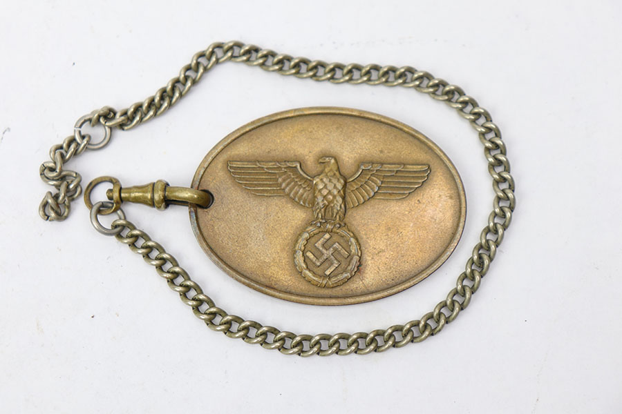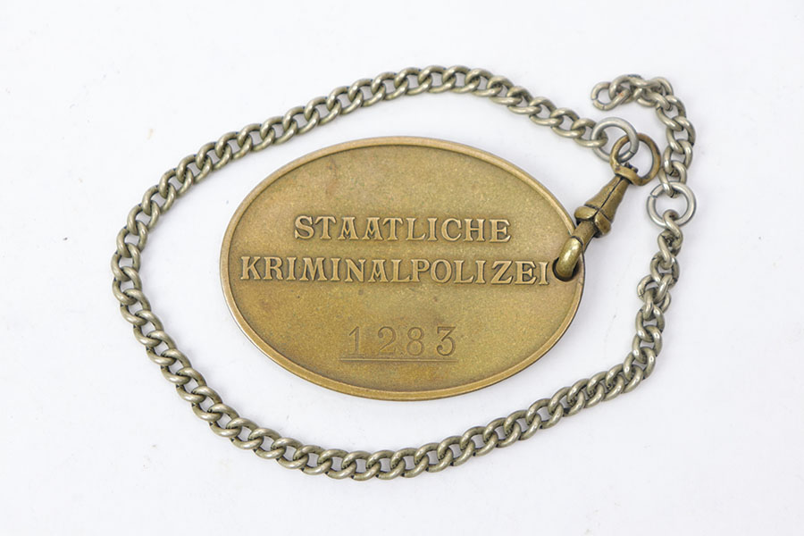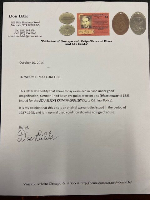 8/14/20 – This is a very rare and highly desirable Third Reich “kripo” disc for the State Criminal Police (Staatliche Kriminalpolizei). These discs were used as a means of identifying a State Criminal Police Officer, and was carried at all times by personnel in this organization. These officers were often retained for post war duty, and were allowed to retain their discs for about one year, after which new discs were issued. It is a bronze disc, which is quite heavy, that reads “Staatliche Kriminalpolizei”, with the ID #1283, on one side and a national eagle with swastika on the other. This piece is accompanied by a letter of authenticity from Don Bible, considered the top expert on these Gestapo and Kripo discs. This particular disc is in excellent condition and still has chain accompanying it.