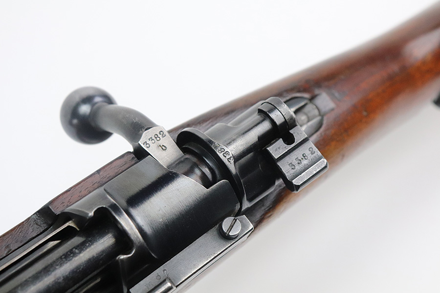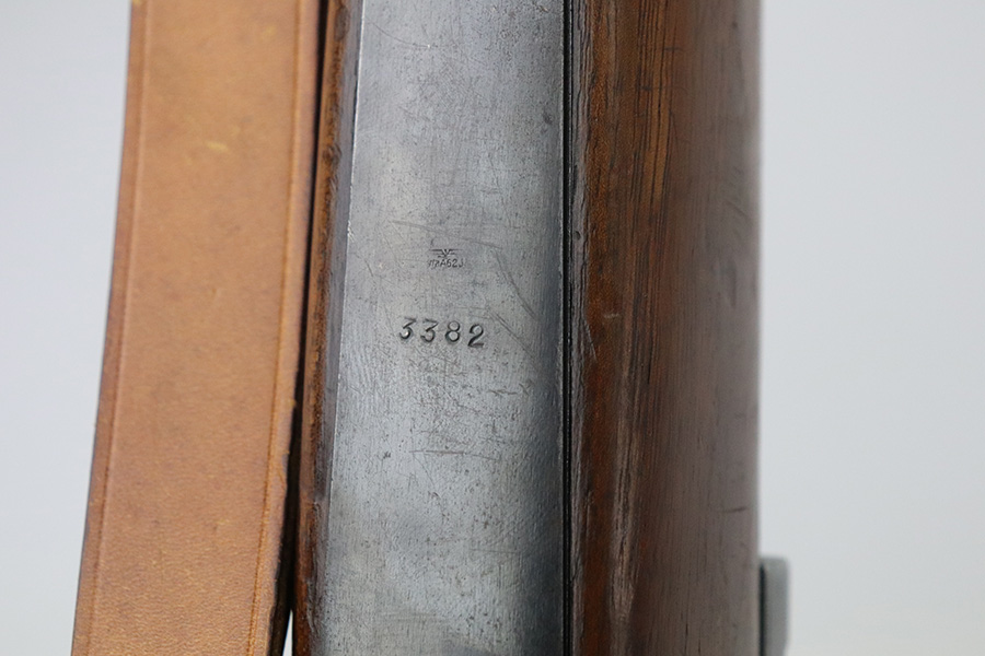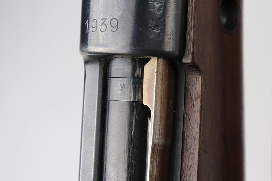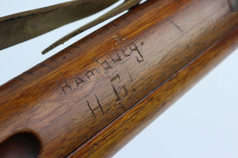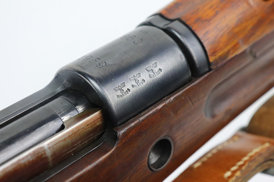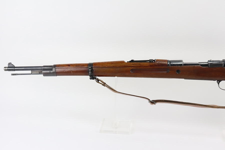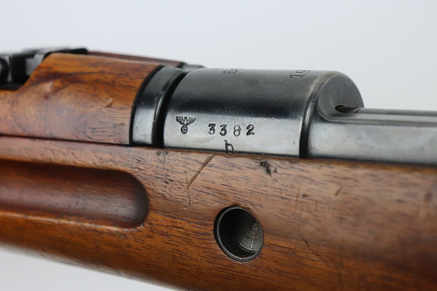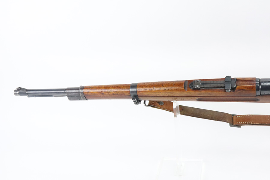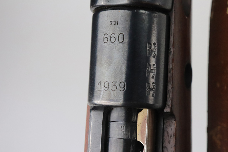 7/29/21 – This is a very rare Steyr G29(o) assembly that was part of a small Luftwaffe contract. These rifles were part of a separate contract that was being manufactured at Steyr when the 1938 annexation of Austria occurred. The Luftwaffe, in desperate need of small arms, immediately took over the production and the rifle was modified as much as possible to the standard 98k Rifle configuration. It was made briefly in 1938 and early 1939, after which the factory was re-tooled to manufacture the standard K98k. These rifles are all Luftwaffe marked, and this one is Eagle/L proofed on the stock. This rifle is all matching throughout, down to the screws. The original blue is in very good condition with minor thinning on receiver and a little bit of wear around the muzzle and front band. The stock is structurally sound but does have a large ding on the left side, and you will also see that various names and initials have been carved into it. Names like Hubert, Hamburg and Schmidt can be seen. It appears this was done by the American soldiers who later captured it, as it is also dated to August of 1945. Includes a sling and cleaning rod. Bore is shiny with strong rifling but some frost throughout.