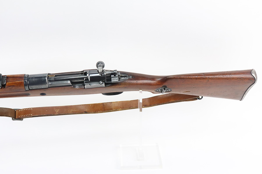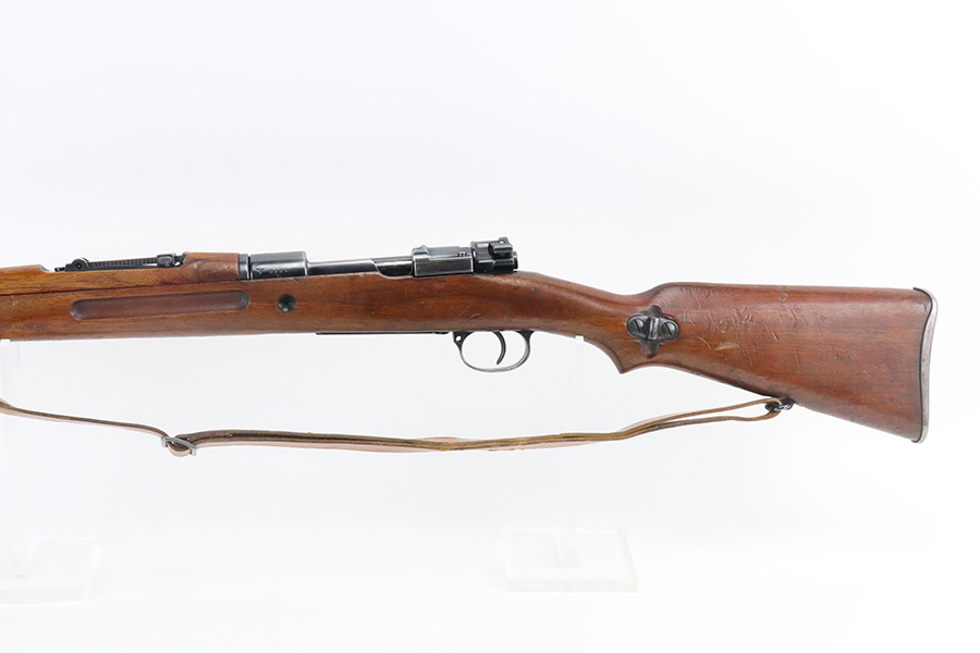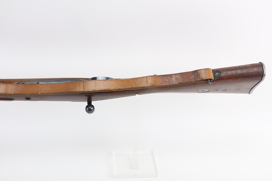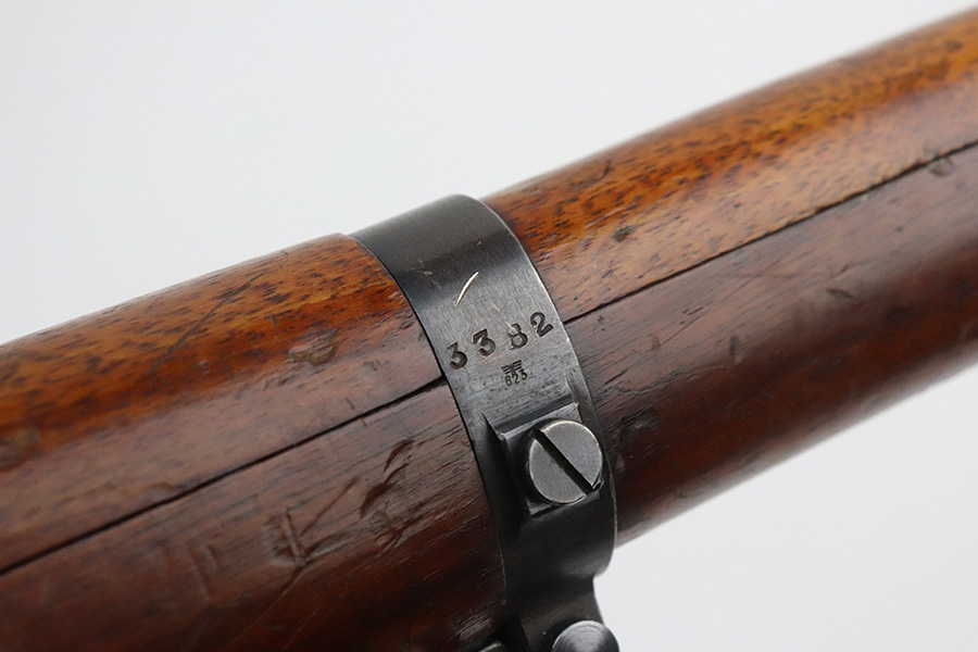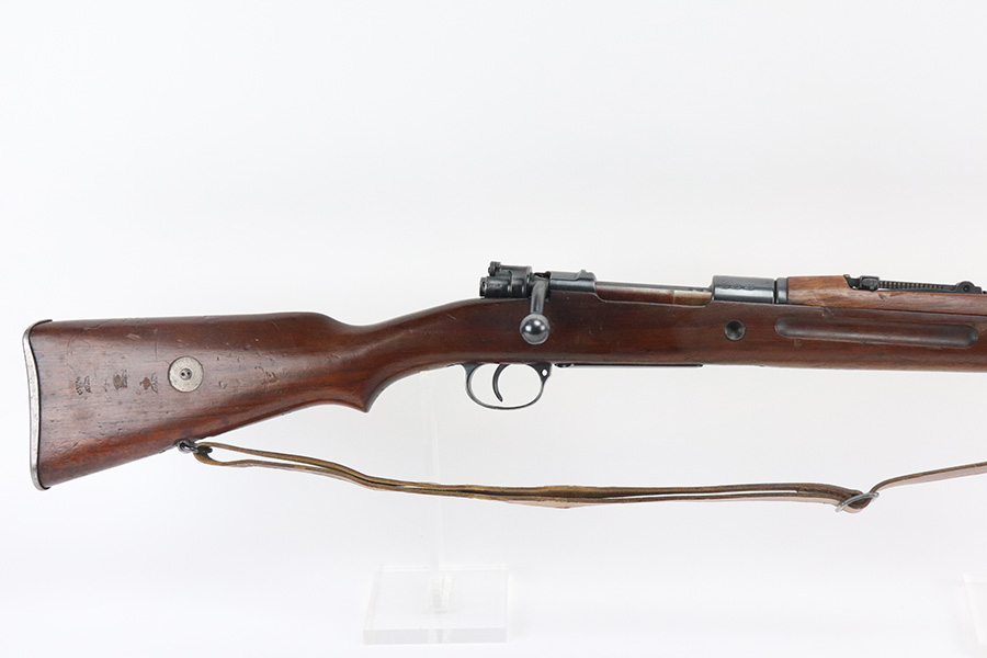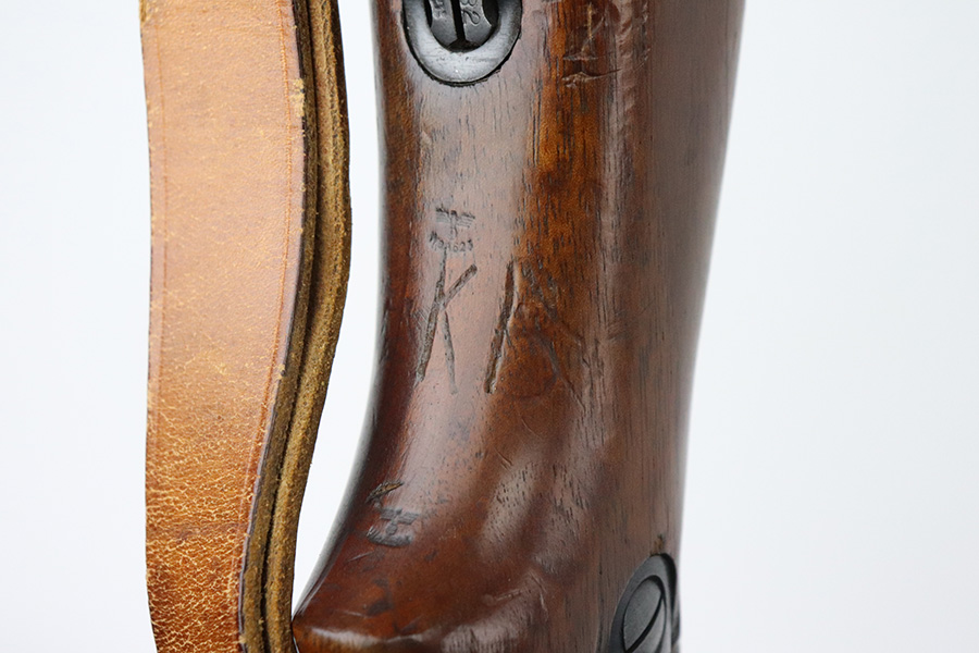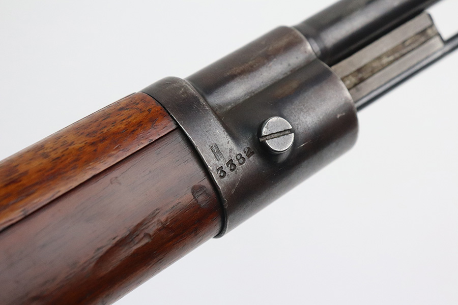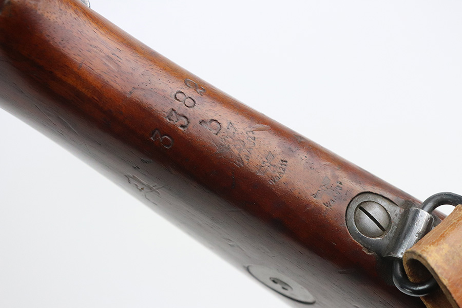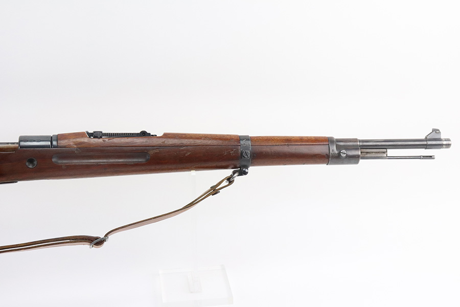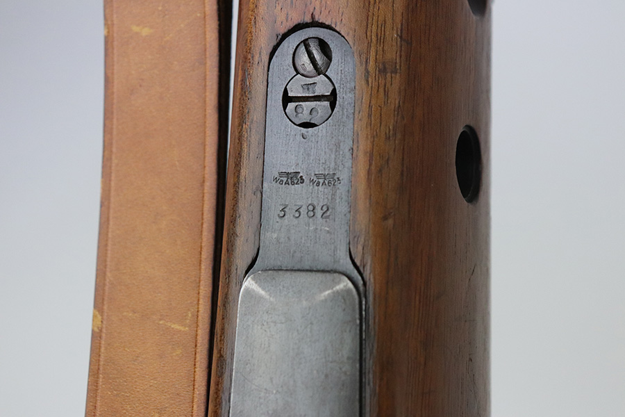 7/29/21 – This is a very rare Steyr G29(o) assembly that was part of a small Luftwaffe contract. These rifles were part of a separate contract that was being manufactured at Steyr when the 1938 annexation of Austria occurred. The Luftwaffe, in desperate need of small arms, immediately took over the production and the rifle was modified as much as possible to the standard 98k Rifle configuration. It was made briefly in 1938 and early 1939, after which the factory was re-tooled to manufacture the standard K98k. These rifles are all Luftwaffe marked, and this one is Eagle/L proofed on the stock. This rifle is all matching throughout, down to the screws. The original blue is in very good condition with minor thinning on receiver and a little bit of wear around the muzzle and front band. The stock is structurally sound but does have a large ding on the left side, and you will also see that various names and initials have been carved into it. Names like Hubert, Hamburg and Schmidt can be seen. It appears this was done by the American soldiers who later captured it, as it is also dated to August of 1945. Includes a sling and cleaning rod. Bore is shiny with strong rifling but some frost throughout.