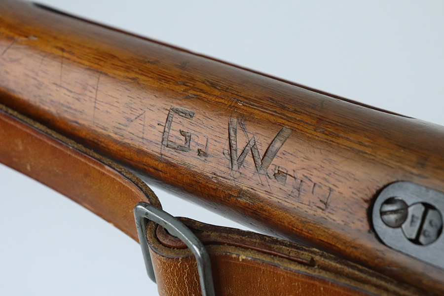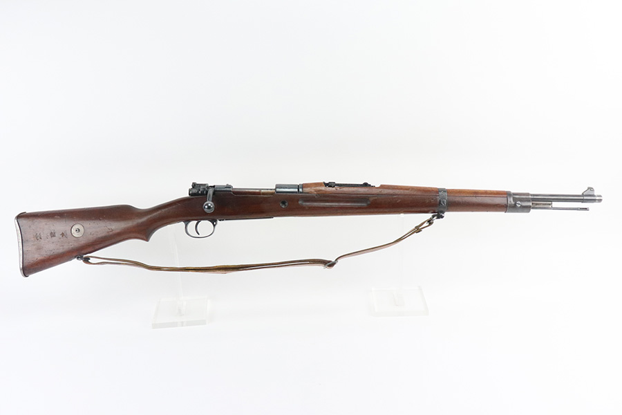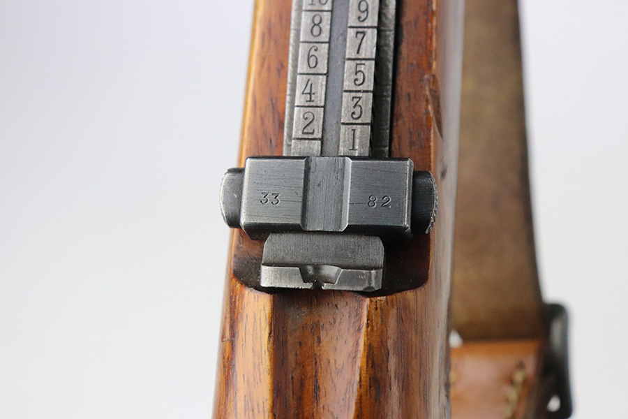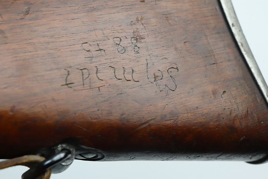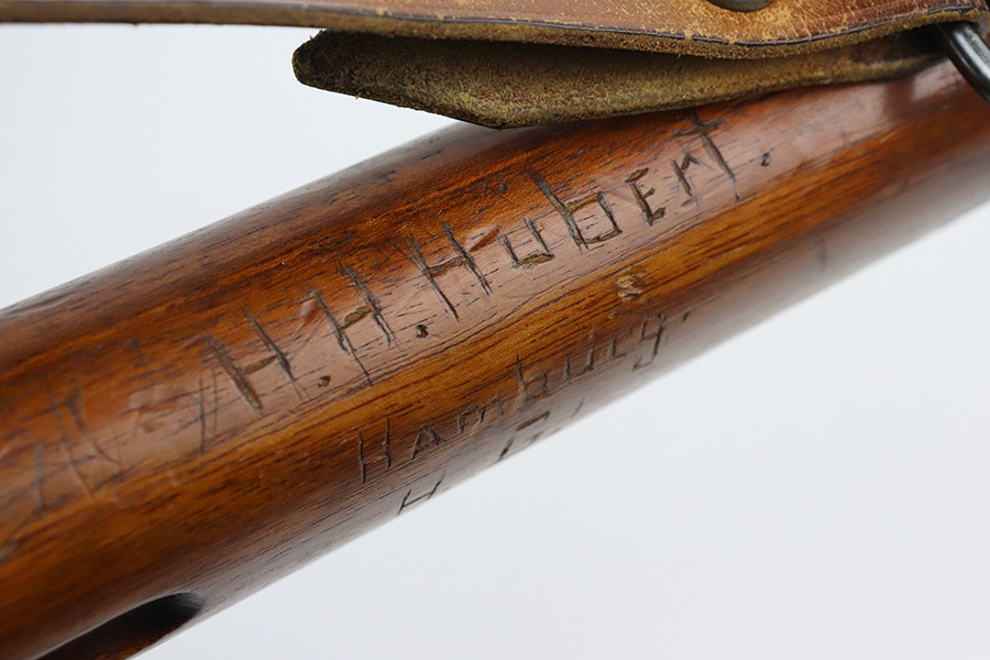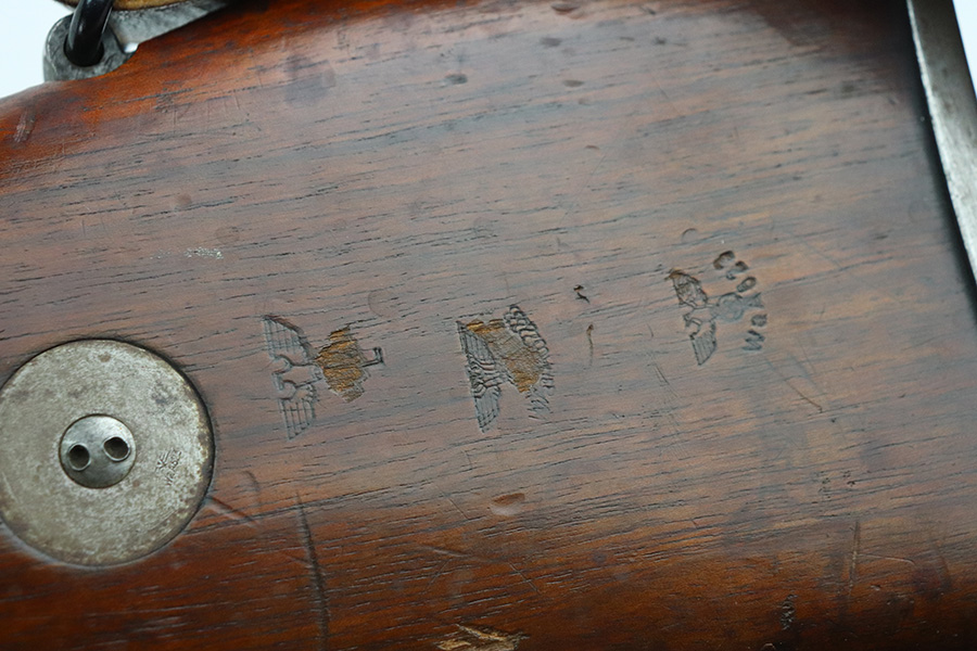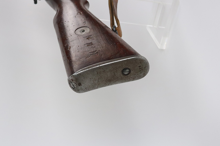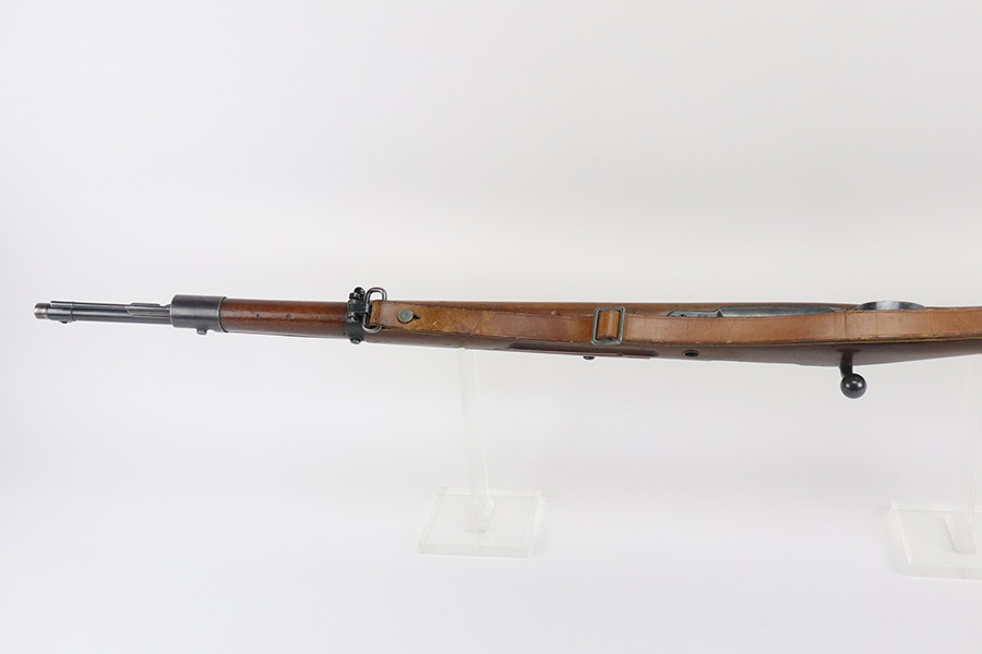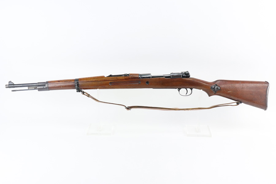 7/29/21 – This is a very rare Steyr G29(o) assembly that was part of a small Luftwaffe contract. These rifles were part of a separate contract that was being manufactured at Steyr when the 1938 annexation of Austria occurred. The Luftwaffe, in desperate need of small arms, immediately took over the production and the rifle was modified as much as possible to the standard 98k Rifle configuration. It was made briefly in 1938 and early 1939, after which the factory was re-tooled to manufacture the standard K98k. These rifles are all Luftwaffe marked, and this one is Eagle/L proofed on the stock. This rifle is all matching throughout, down to the screws. The original blue is in very good condition with minor thinning on receiver and a little bit of wear around the muzzle and front band. The stock is structurally sound but does have a large ding on the left side, and you will also see that various names and initials have been carved into it. Names like Hubert, Hamburg and Schmidt can be seen. It appears this was done by the American soldiers who later captured it, as it is also dated to August of 1945. Includes a sling and cleaning rod. Bore is shiny with strong rifling but some frost throughout.