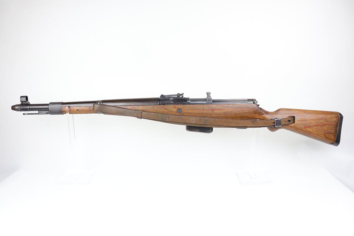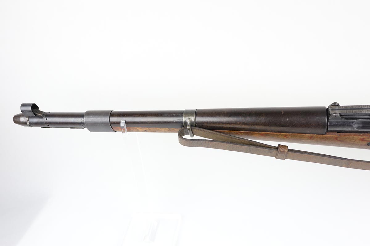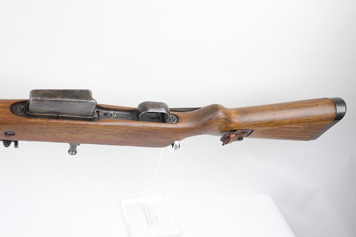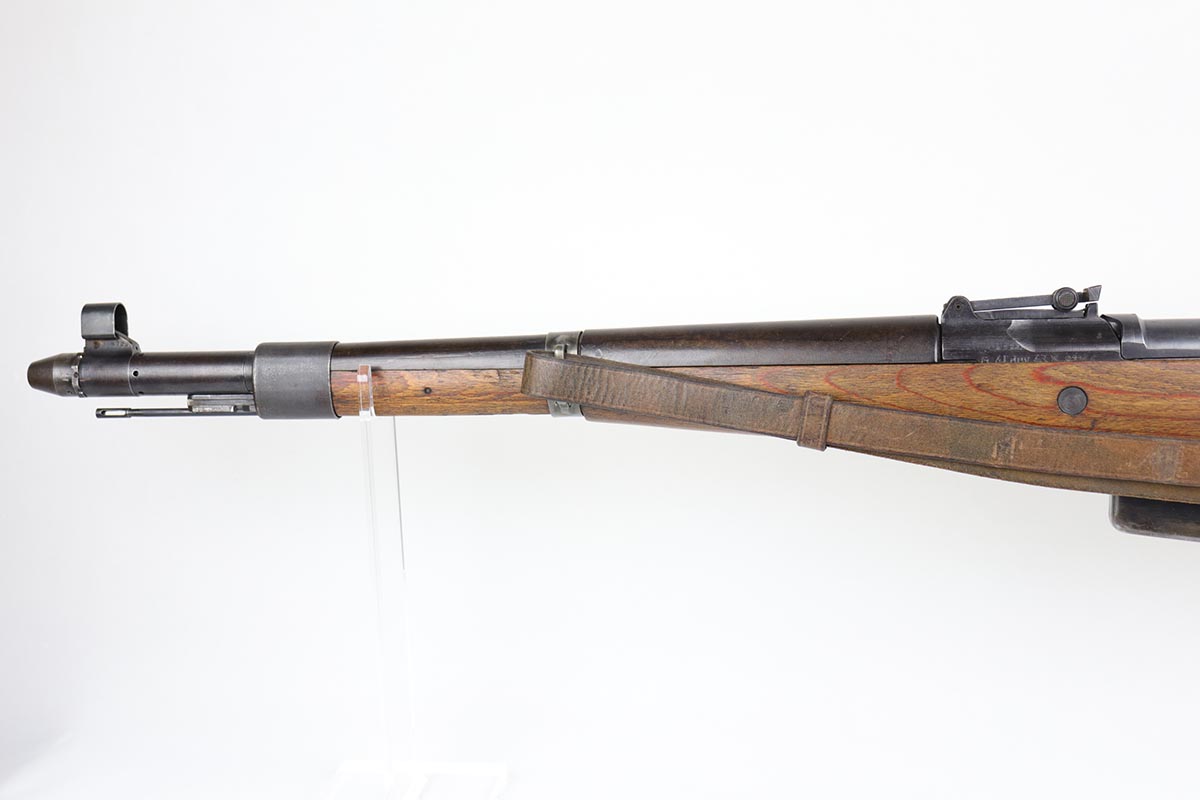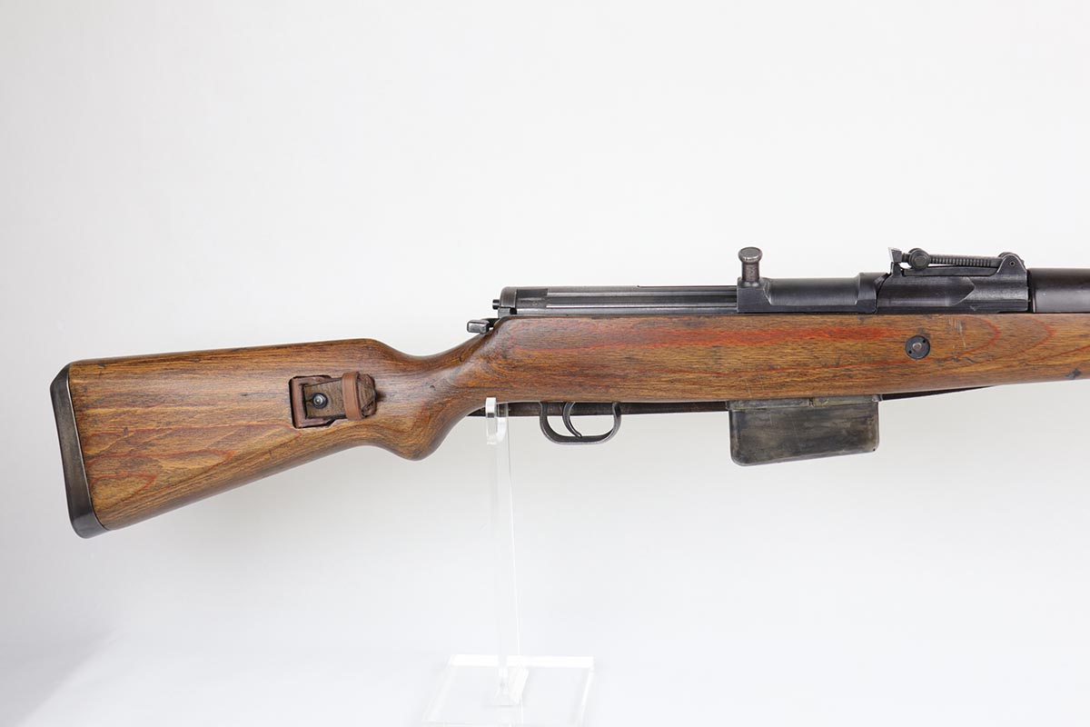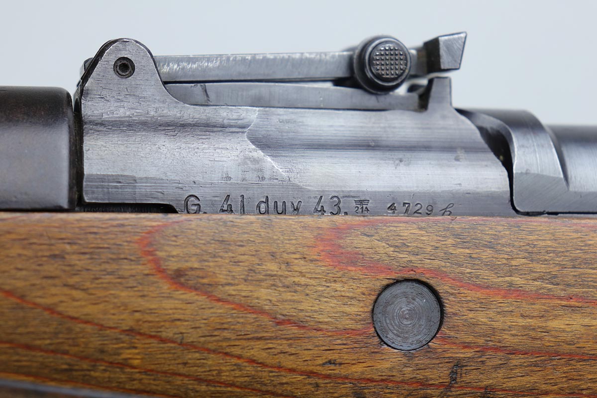 3/2/20 – This is a rare and desirable Walther Gewehr 41 (G41) rifle from World War II. The receiver is marked with ‘duv 43’ code, denoting it was manufactured at the Berlin-Lubecker factory. There were fewer than 10,000 estimated G41s produced before production switched to the G43/K43. These early G41 series of rifles used the “Bang Gas-Trap” system which employed a barrel mounted “Gas Trap” muzzle cone to trap hot gas that was bled off when the round was fired, which cycled the action. This entire series of rifles was very short lived however it was used extensively on the Eastern Front where a semi-automatic rifles was considered essential for “long-life”. Consequently, their survival rate is very low in any condition. The later series of G/K43 rifles did away with the earlier “Bang” gas trap style system and instead used a barrel mounted gas system, that was copied from the Russian Tokarev rifles, making them far more reliable and easier to produce. The Walther design was more successful than the Mauser design at least, as they removed the bolt and had a cleaner receiver area as a result. This particular rifle is all matching and correct, with fully matching numbered parts. The receiver and all numbered areas of the upper/barrel are matching, as is the stock and trigger assembly. E/214 proofs present on several metal parts. The finish on the metal parts is in very good condition, with most of the thinning/patina on the magazine/mag well. The stock is in very good condition with no cracks but a few minor chips or dings. Mint bore. Sling is included.