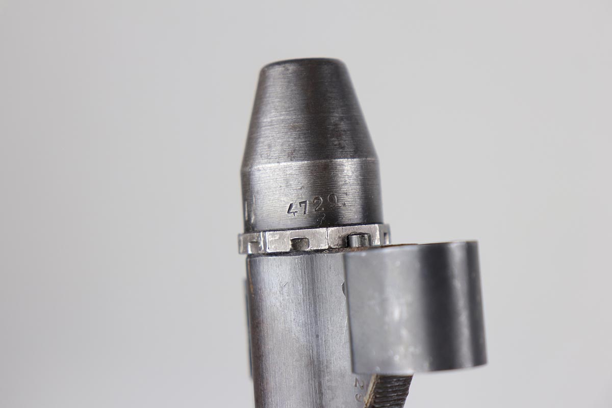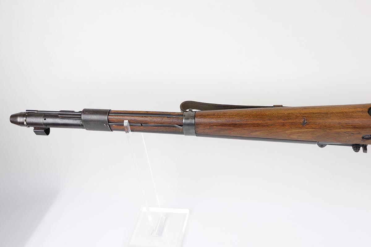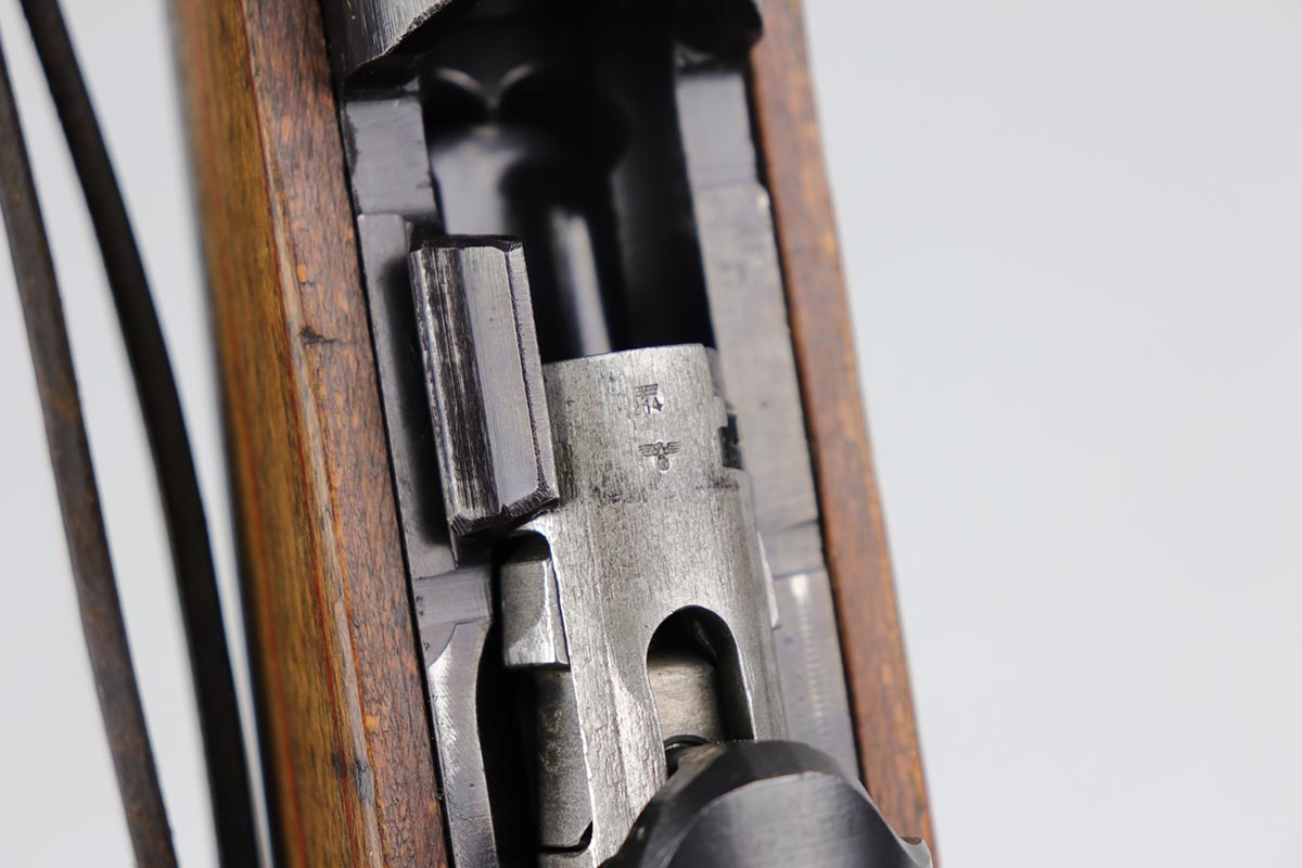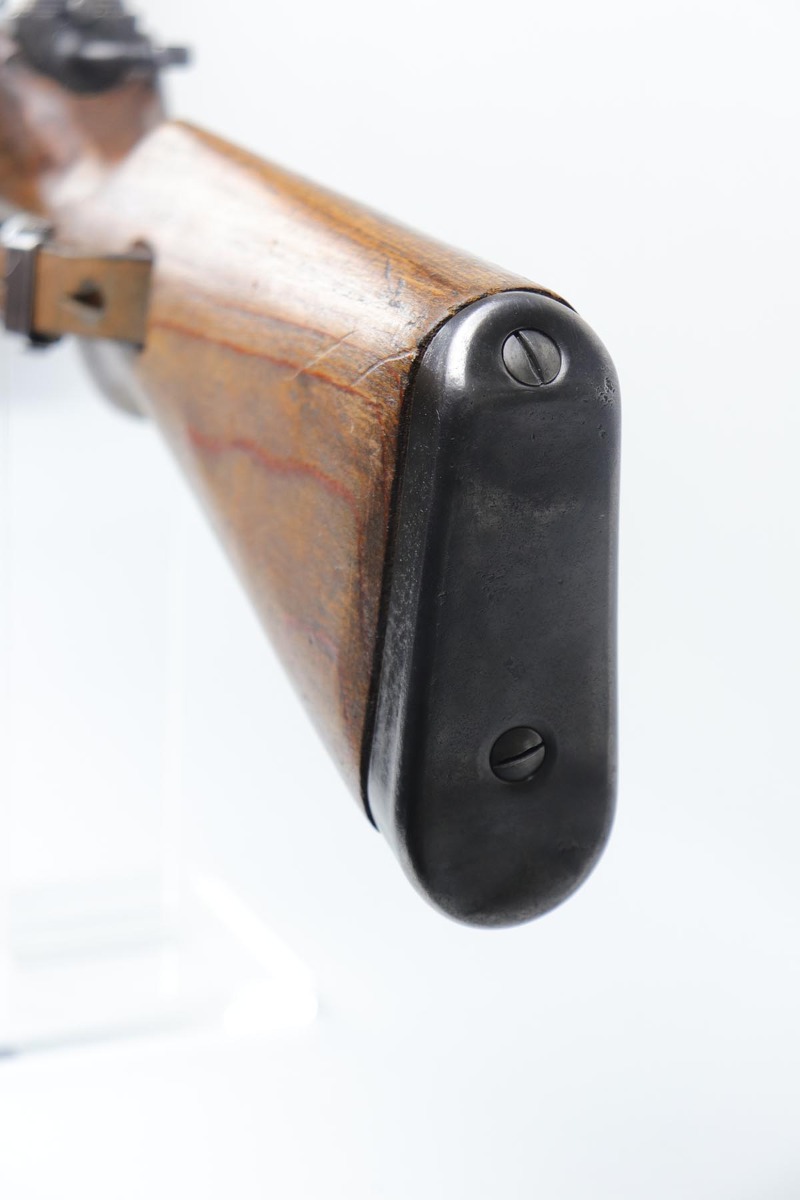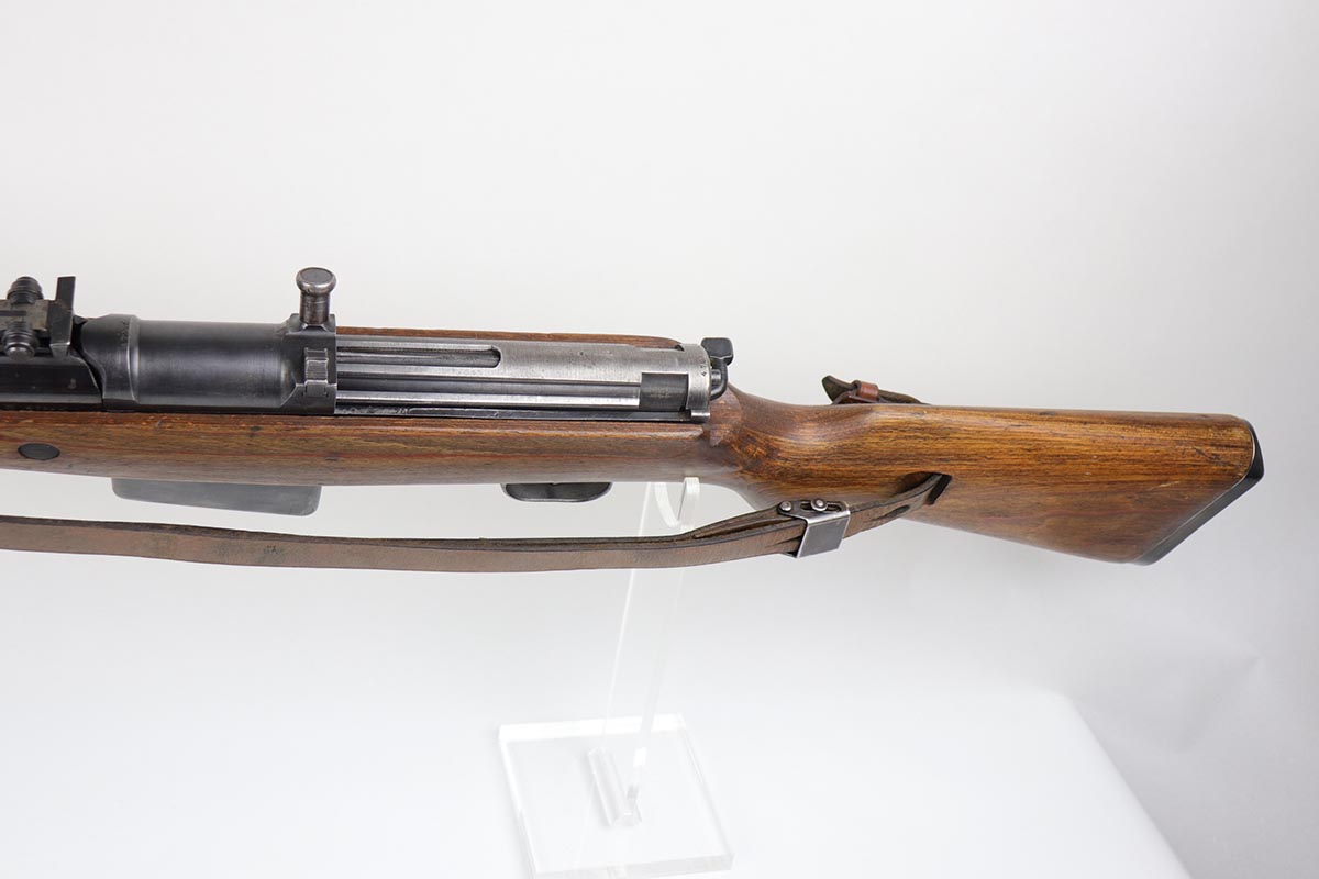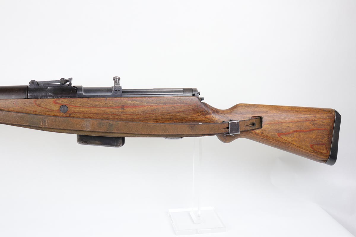 3/2/20 – This is a rare and desirable Walther Gewehr 41 (G41) rifle from World War II. The receiver is marked with ‘duv 43’ code, denoting it was manufactured at the Berlin-Lubecker factory. There were fewer than 10,000 estimated G41s produced before production switched to the G43/K43. These early G41 series of rifles used the “Bang Gas-Trap” system which employed a barrel mounted “Gas Trap” muzzle cone to trap hot gas that was bled off when the round was fired, which cycled the action. This entire series of rifles was very short lived however it was used extensively on the Eastern Front where a semi-automatic rifles was considered essential for “long-life”. Consequently, their survival rate is very low in any condition. The later series of G/K43 rifles did away with the earlier “Bang” gas trap style system and instead used a barrel mounted gas system, that was copied from the Russian Tokarev rifles, making them far more reliable and easier to produce. The Walther design was more successful than the Mauser design at least, as they removed the bolt and had a cleaner receiver area as a result. This particular rifle is all matching and correct, with fully matching numbered parts. The receiver and all numbered areas of the upper/barrel are matching, as is the stock and trigger assembly. E/214 proofs present on several metal parts. The finish on the metal parts is in very good condition, with most of the thinning/patina on the magazine/mag well. The stock is in very good condition with no cracks but a few minor chips or dings. Mint bore. Sling is included.