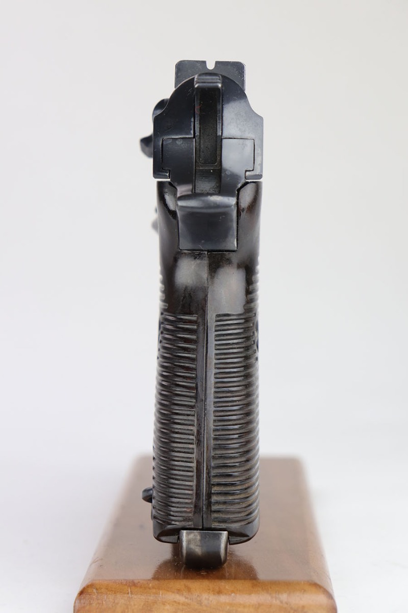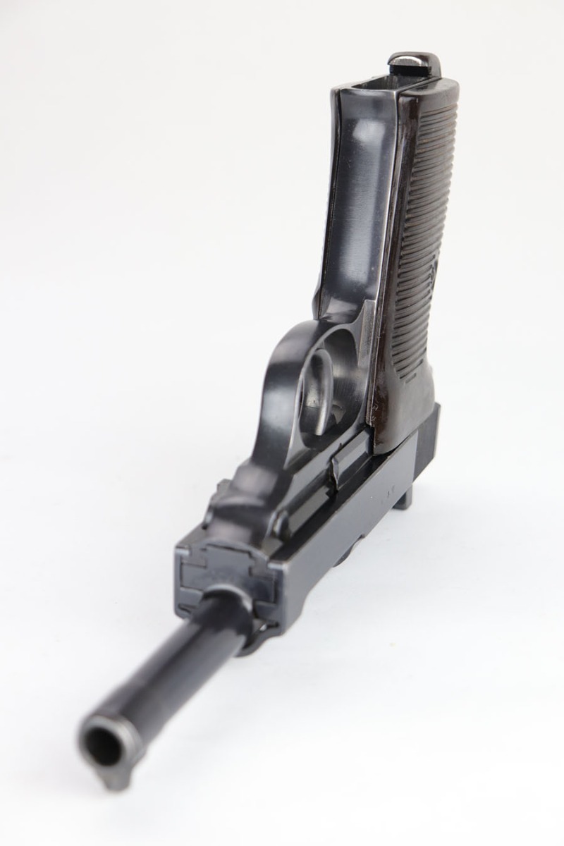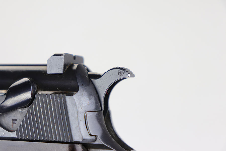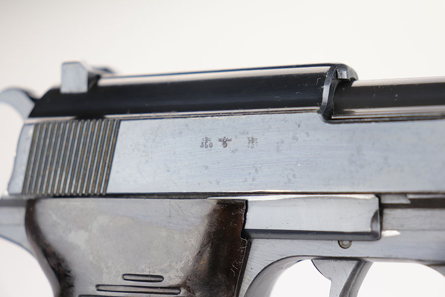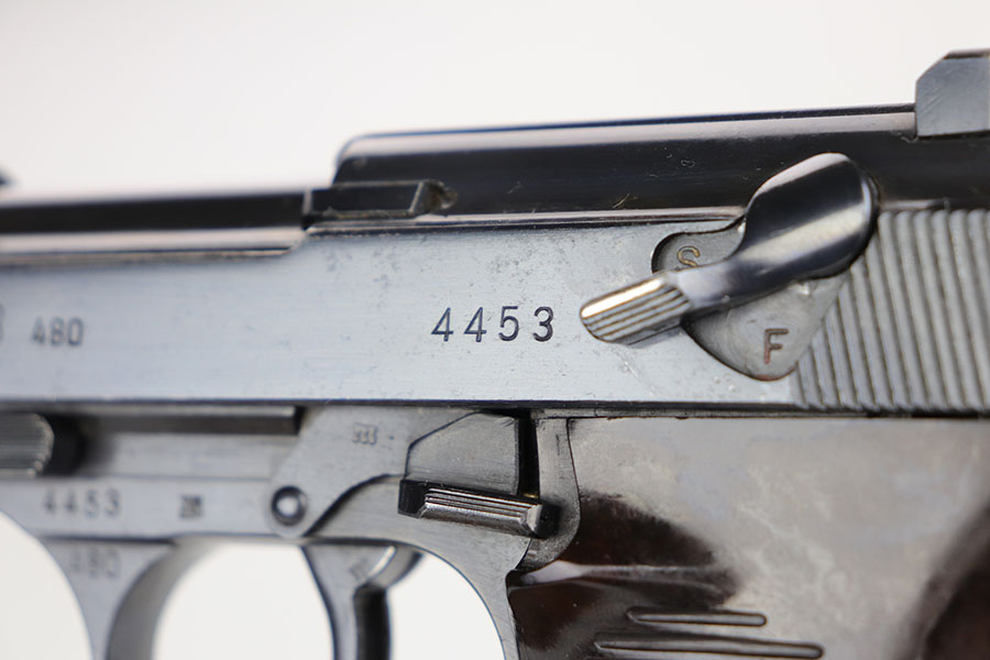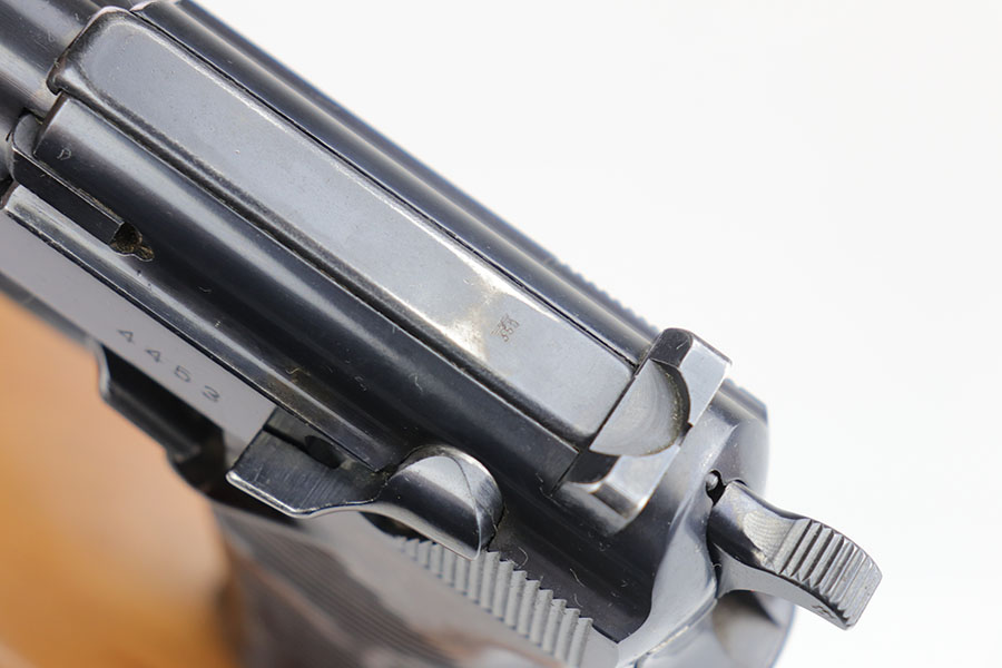3/29/20 – This is a rare and early Walther P.38 from 1940, one of only 7,000 produced with ‘480’ code on frame/slide. It has all matching numbers but the finish was restored at some point. There is some age under the finish and a bit of oxidation on the right side of the slide, so was likely re-blued many years ago. Small parts correctly have Walther inspection stamp. Grips are numbered and matching to the gun. Bore has strong rifling with minor signs of use, and a bit of freckling near the muzzle. Safety works but de-cocker does not.