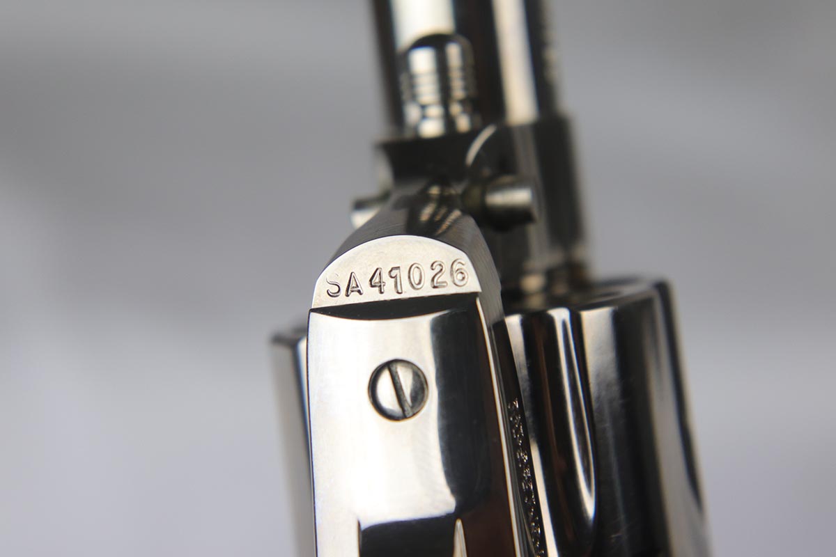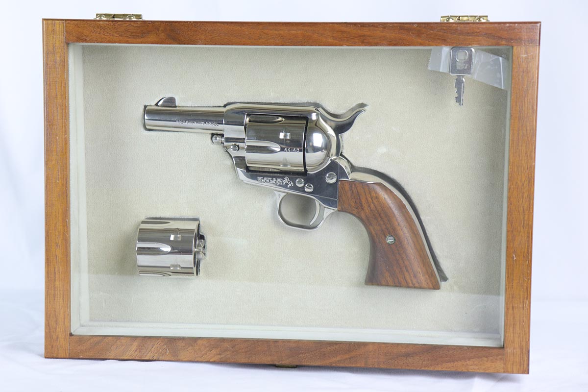7/12/18 – This is a mint condition Colt SAA – Sheriff’s model.  It has an original nickel finish and 3 inch barrel.  This is a third generation revolver, manufactured in 1980, with dual-cylinder for both .44 spl and .44-40 Colt.  There were only 633 of this model variation produced between 1980-1983.  It is fitted with smooth walnut grips and comes complete with a shadow presentation box.