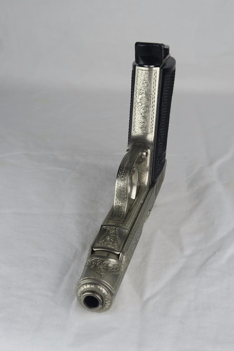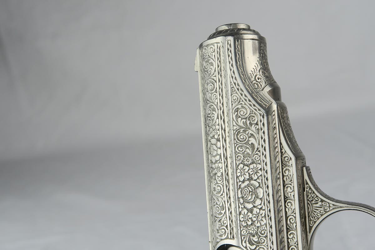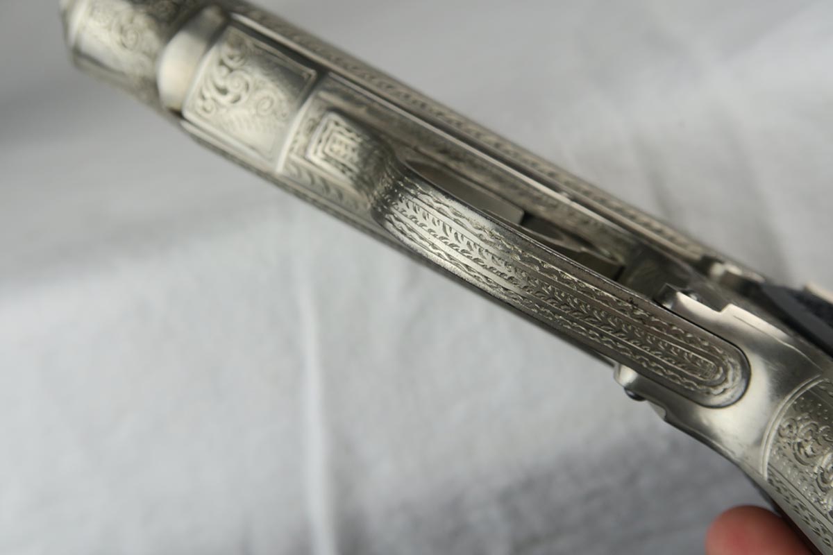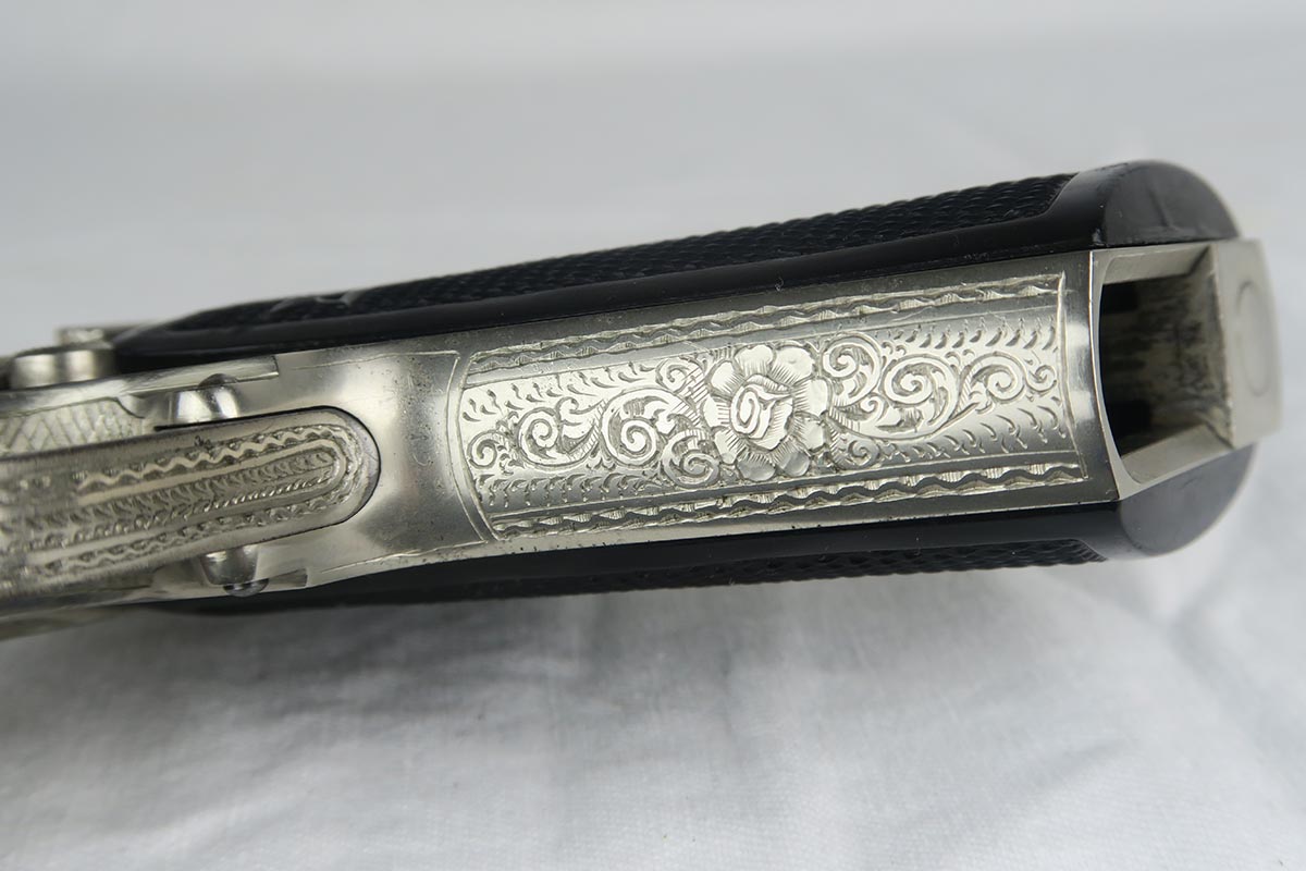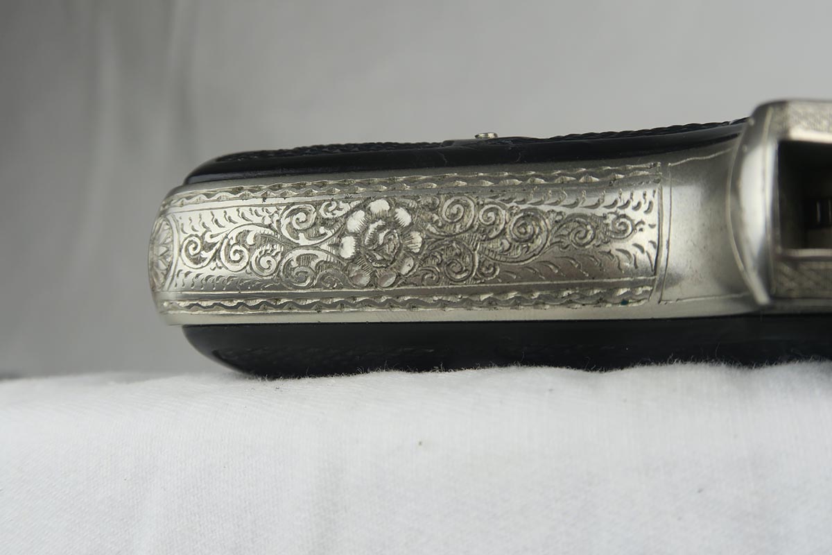 12/4/17 – For those collectors who have been looking for a FACTORY engraved piece, here’s a rare one for you. Most engraved guns from the factory (about 90%) are blued and either oak leaf or acorn pattern. This one is unique as it has a nickel finish and it is engraved in a floral pattern. Probably less than 5% were made in this pattern, and if you look closely at the slide and frame you can see several roses and other flowers. This gun is also one of the earliest known engraved guns, as it is in the 757xxx range. It has early X grips, a 90 degree safety and a “fat” hammer. Also has the enclosed firing pin. The magazine is an early finger extension mag, but the tube of the magazine is not nickeled but rather “in the white”. Another interesting feature on this gun is that it has no firing proofs on the slide or frame. The barrel is crown/N proofed on the end. I can’t explain the lack of proofs as I doubt this was never issued, but I know the guns for factory engraving were pulled off the assembly line for special orders and then took many months to complete the process. Perhaps when the gun was completed it was never cycled back for test firing. The lack of proofs just further confirms the fact that it was a factory order.