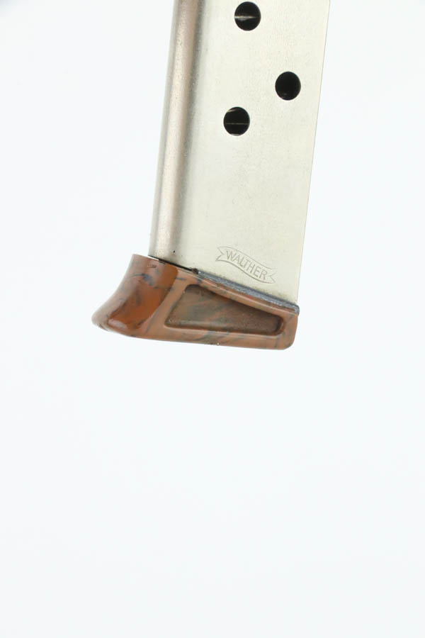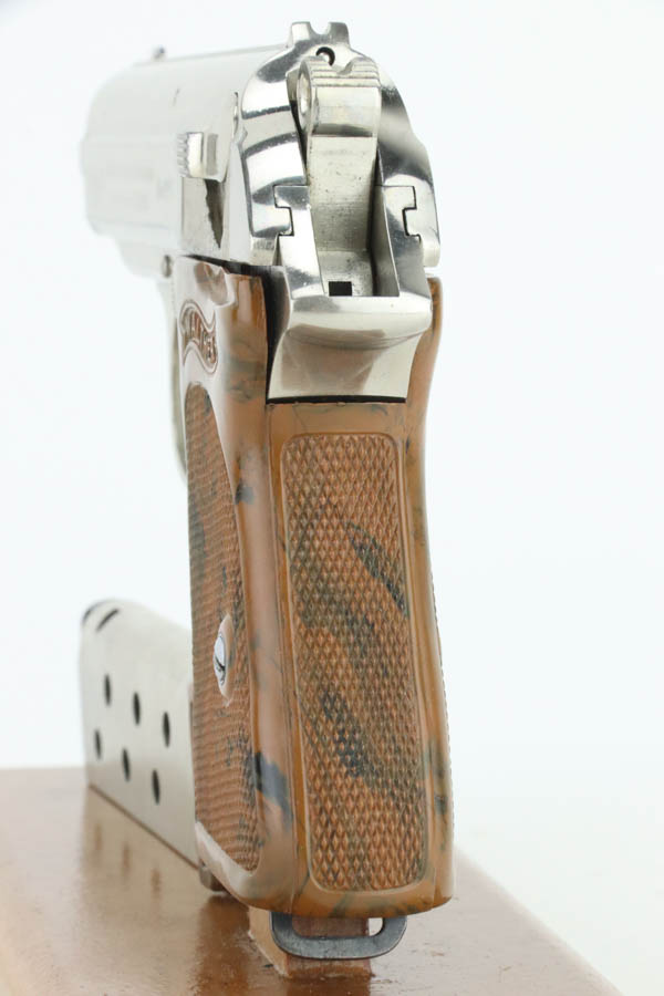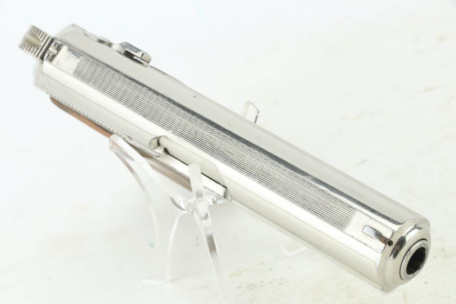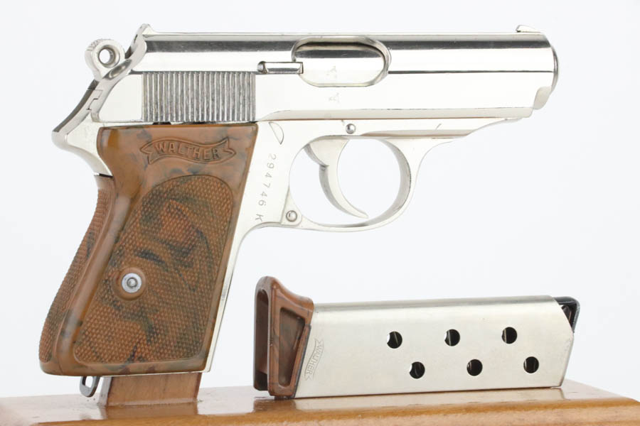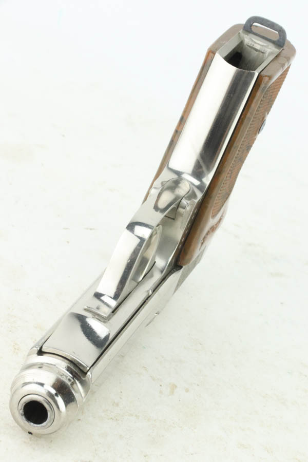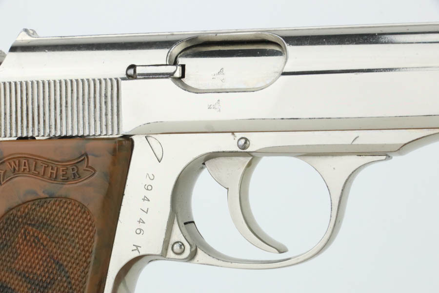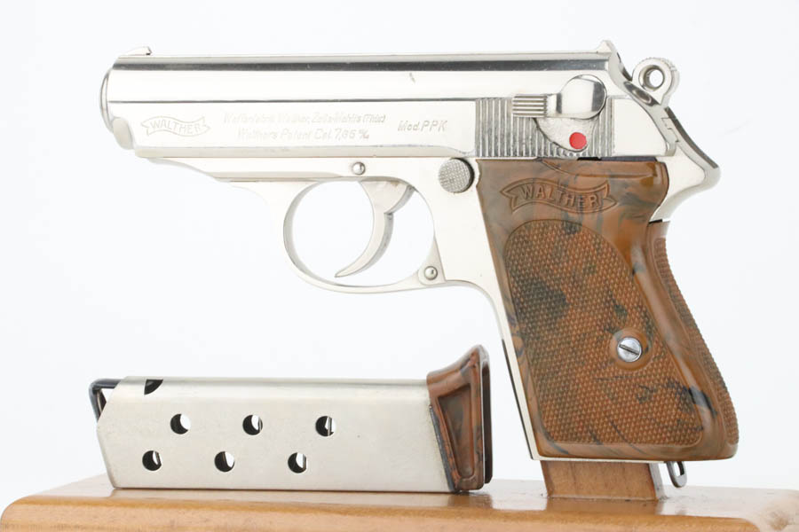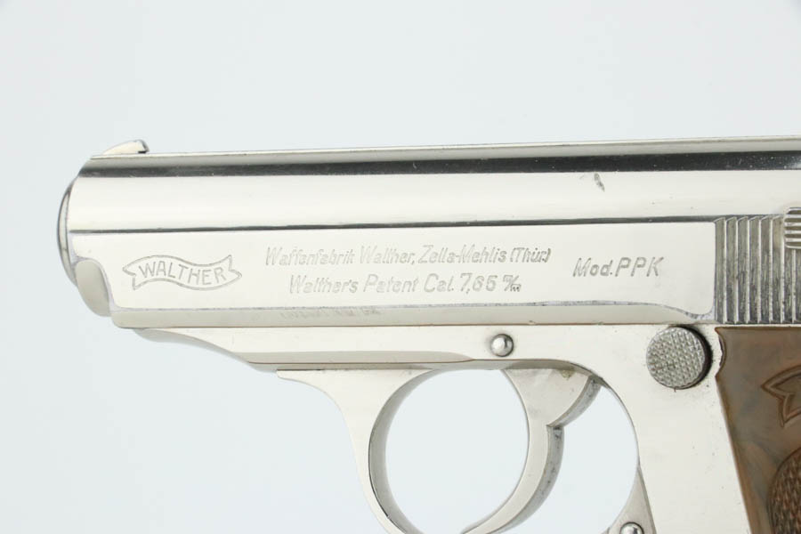 7/23/24 – This is an excellent example of a rare, factory-nickeled Walther PPK from 1939. All matching and “Eagle N” proofed. It comes as a rig with a factory-nickeled finger extension magazine and a tan leather shoulder holster. This particular gun comes with a notarized letter stating that it was captured by a man named Paul Davis during WW2 from an SS Colonel in the Battle of Aachen, Germany in late 1944. The letter also states that it came as a rig with this shoulder holster. It has retained essentially all of its original factory nickel finish with just some surface micro-scratches and a tiny ding on the left side of the slide. Fitted with an excellent brown Walther grip. The bore has good rifling, but there is light pin-pricking in the grooves.