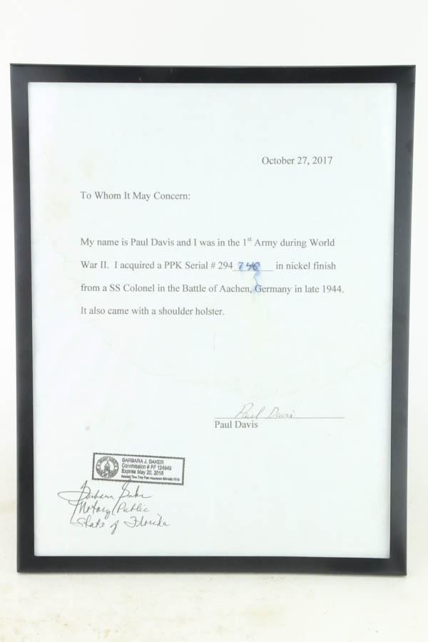 SOLD – Rare, Nickel Walther PPK Rig – SS Colonel Capture With Letter