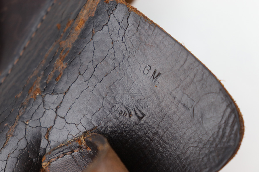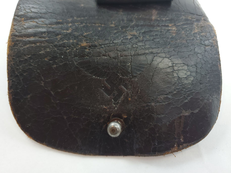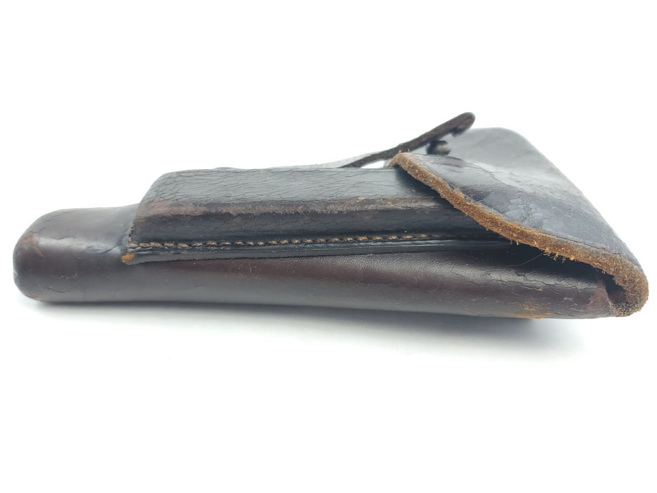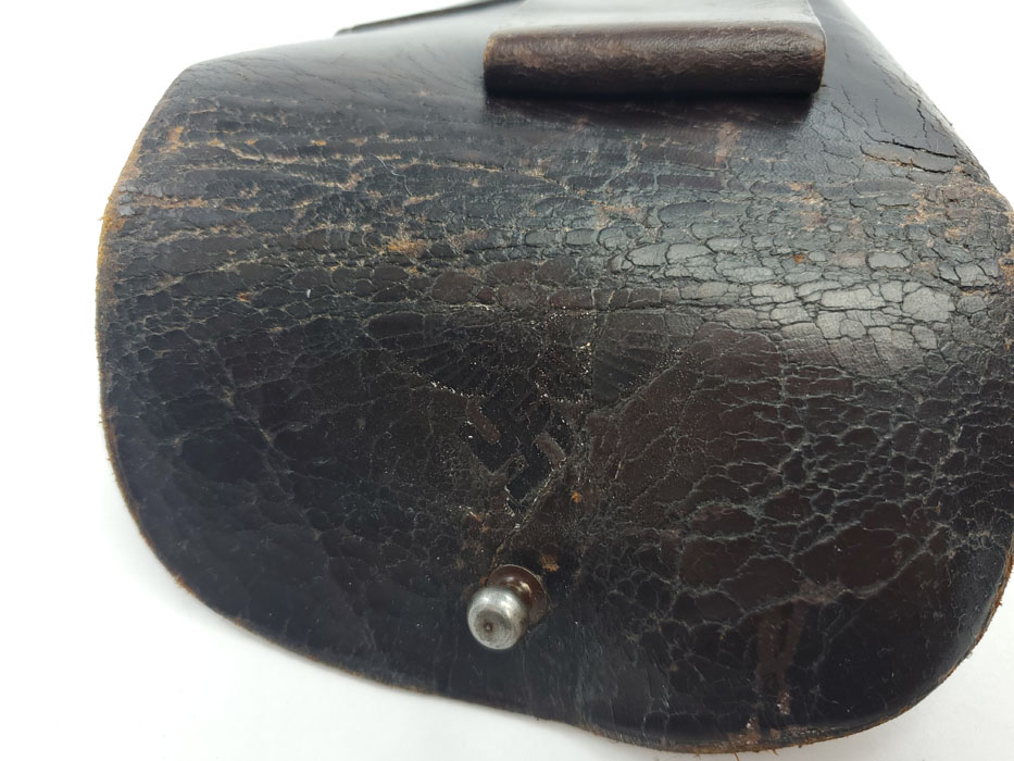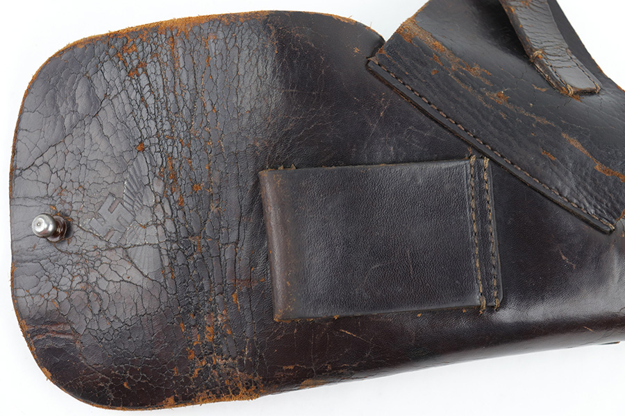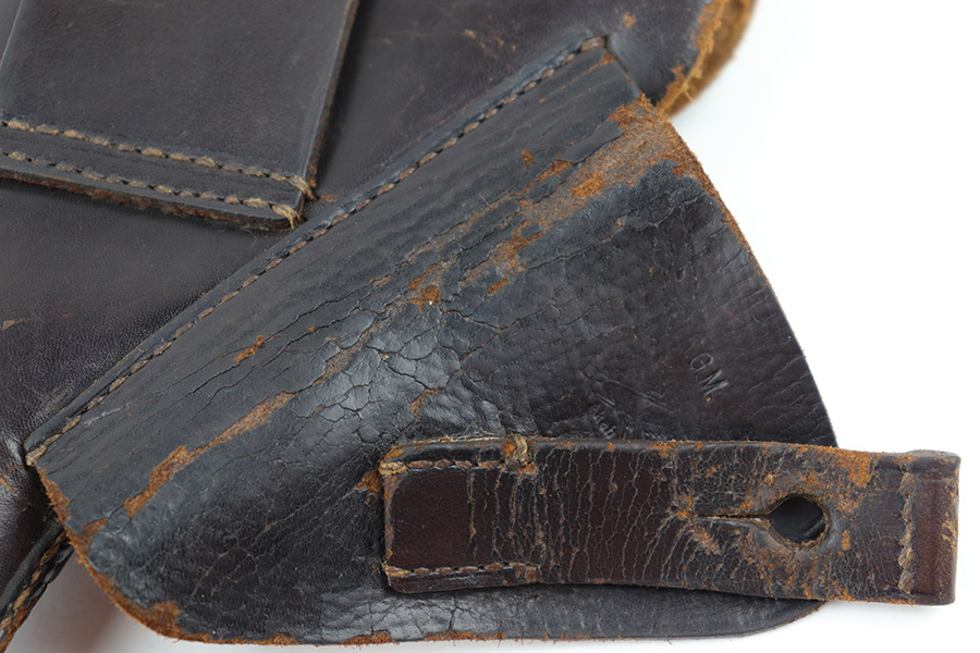 5/11/20 – This is an extremely scarce Walther PP holster designated to the N.S.F.K. The NSFK was the predecessor to the Luftwaffe. There weren’t many NSFK holsters produced during WW2, making these one of the hardest-to-find holsters today. The front leather has a flying man with a banner and “NSFK” over top. The upper portion / banner of this stamp is barely visible due to the surface wear on the leather. You can clearly see the flying man logo though, which is unique to the NSFK. The holster is also AKAH DRGM maker stamped under the closure strap. There is a faint remnant of the Walther PP interior ink stamp as well. The leather is worn, and cracking on the surface as shown. Despite this, the leather is completely in tact and all original. The stitching is all original as well. Priced to sell according to condition, as again this may be the hardest variation holster to find on the market.