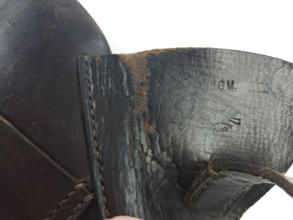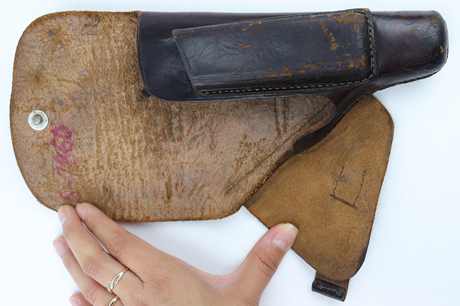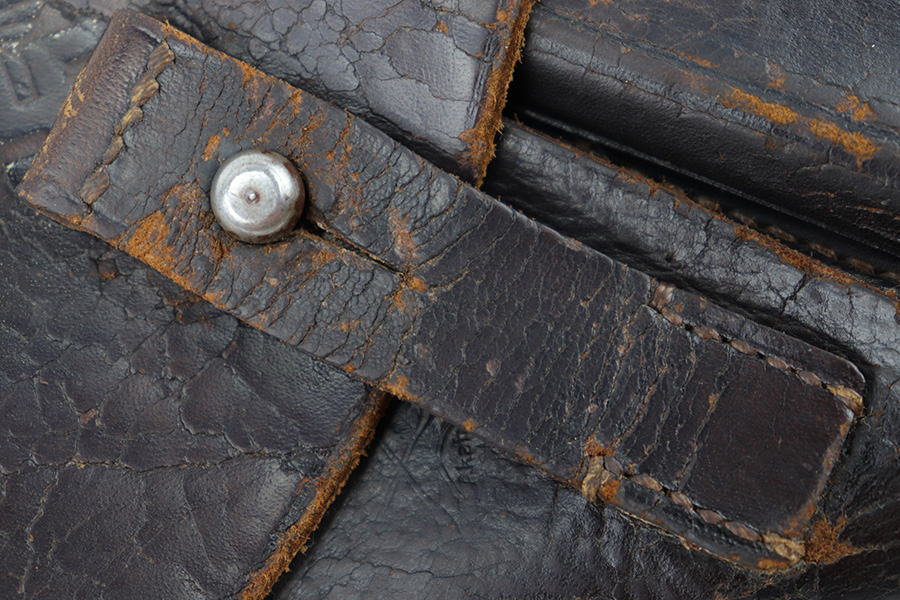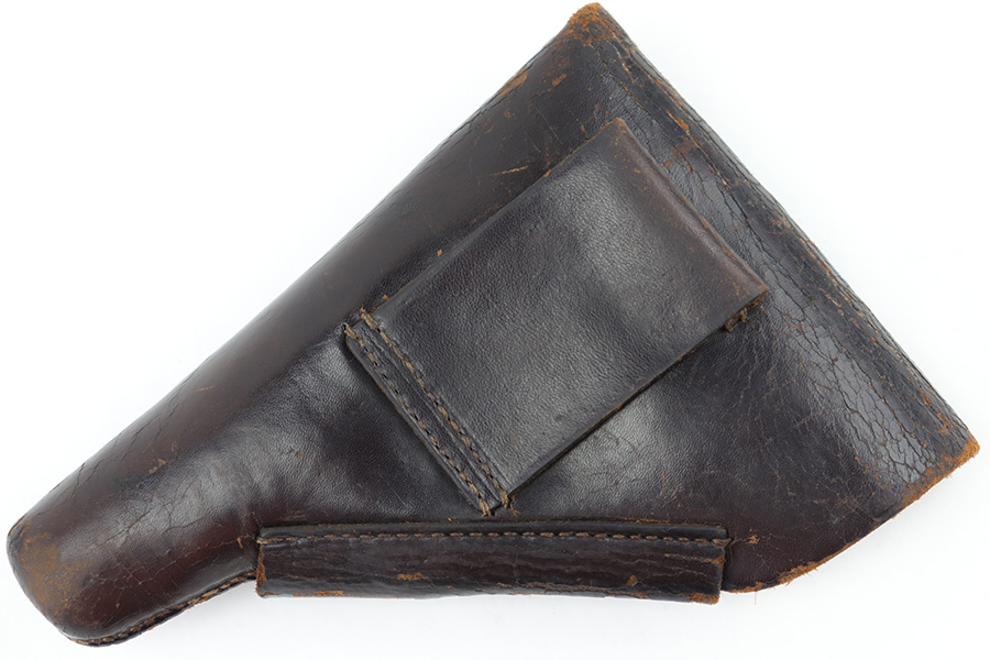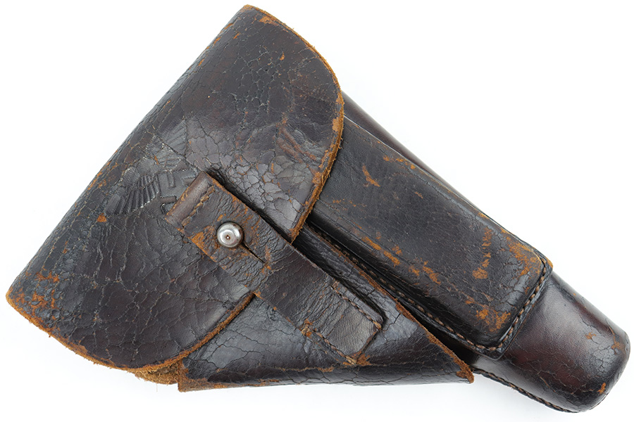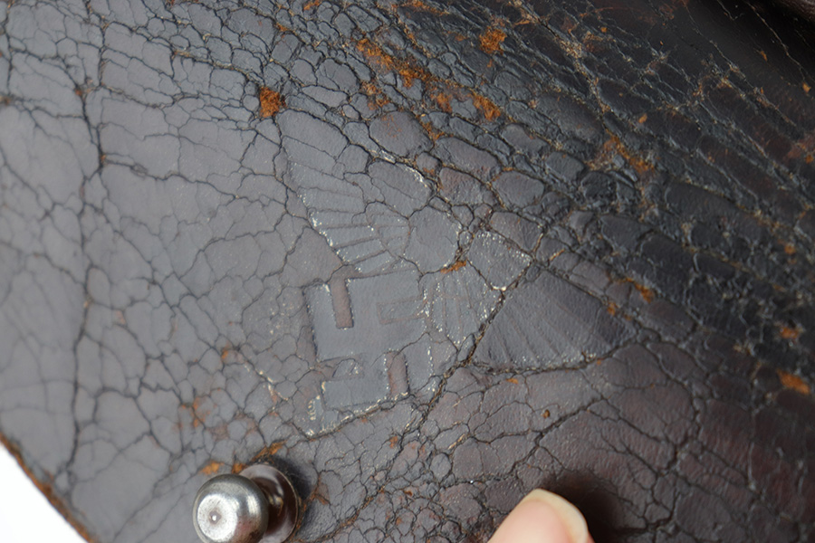 5/11/20 – This is an extremely scarce Walther PP holster designated to the N.S.F.K. The NSFK was the predecessor to the Luftwaffe. There weren’t many NSFK holsters produced during WW2, making these one of the hardest-to-find holsters today. The front leather has a flying man with a banner and “NSFK” over top. The upper portion / banner of this stamp is barely visible due to the surface wear on the leather. You can clearly see the flying man logo though, which is unique to the NSFK. The holster is also AKAH DRGM maker stamped under the closure strap. There is a faint remnant of the Walther PP interior ink stamp as well. The leather is worn, and cracking on the surface as shown. Despite this, the leather is completely in tact and all original. The stitching is all original as well. Priced to sell according to condition, as again this may be the hardest variation holster to find on the market.