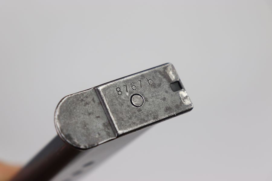 7/19/24 – This is a rare variation numbered Walther P.38 magazine. The magazine base is numbered (not on the lip) in a style suitable for AC 42 P.38 pistols. This is the later-variation of numbered P.38 magazines. The magazine is in excellent+ overall condition with only some mild surface patina and discoloration on the base. The serial number 8767b is clearly visible and original. The magazine tube is P.38 stamped and proof stamped with one eagle 359 proof. The spring is strong and fully functional.