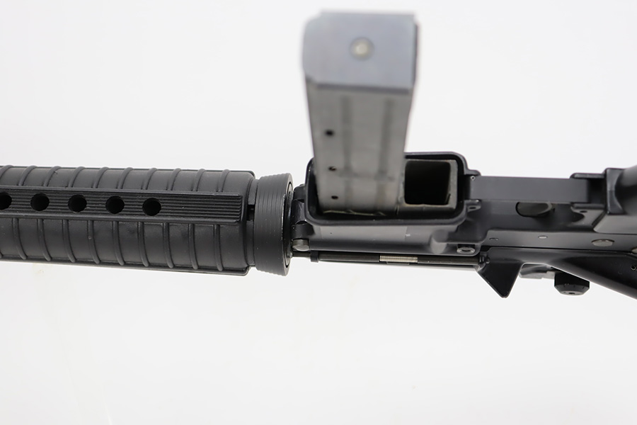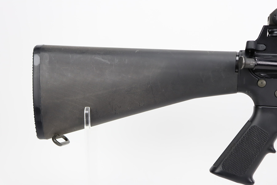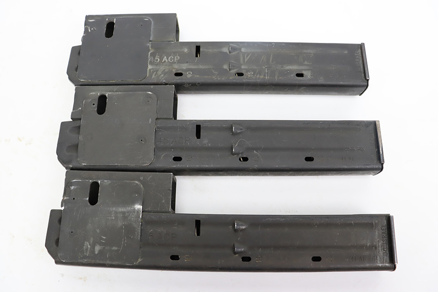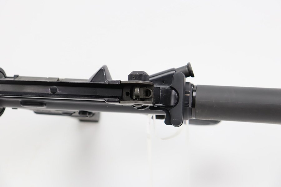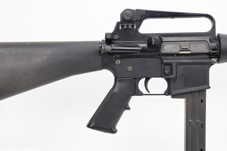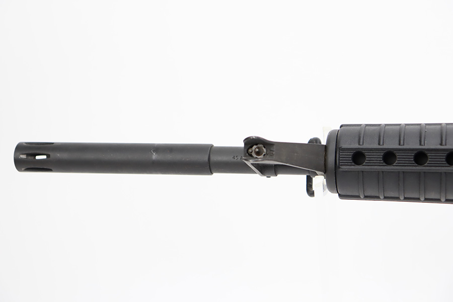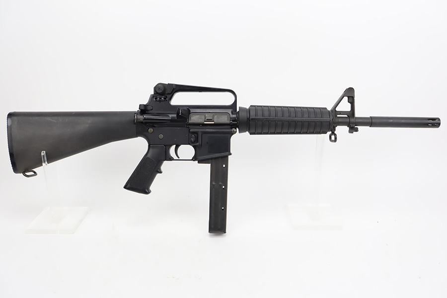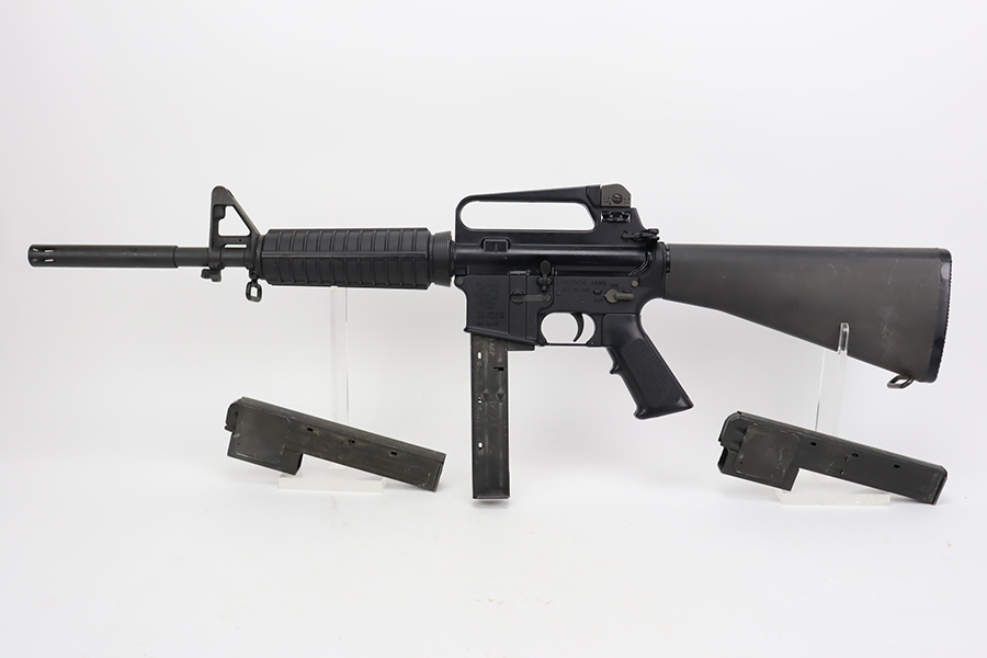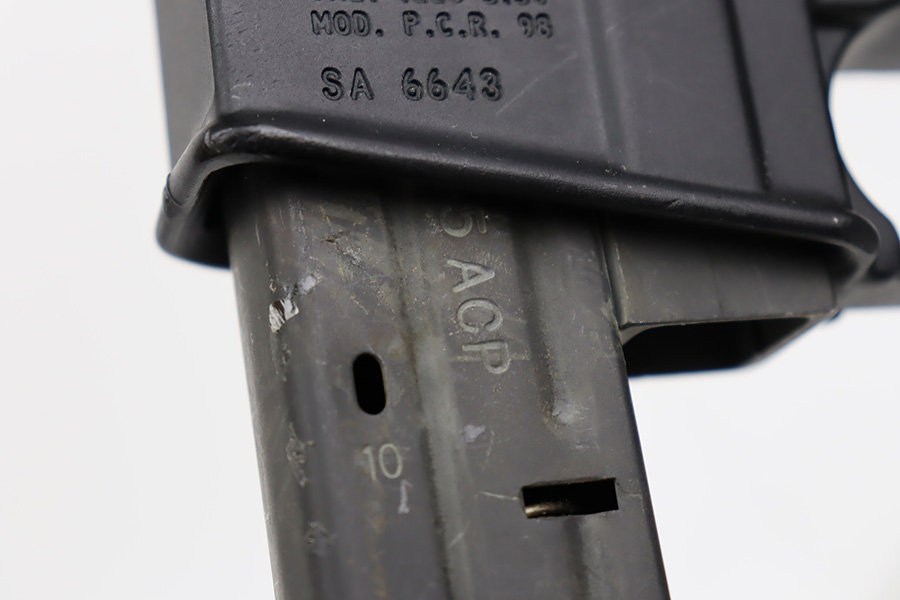 10/3/23 – This is a rare Olympic Arms P.C.R. 98 with .45ACP upper conversion and rare, Uzi-style converted mags. Comes with a total of three of these magazines. The rifle is in excellent condition with only very minor handling wear. 16″ barrel with minty bore. Fixed buttstock with trapdoor compartment. Bayo lug and carry handle. FFL required.