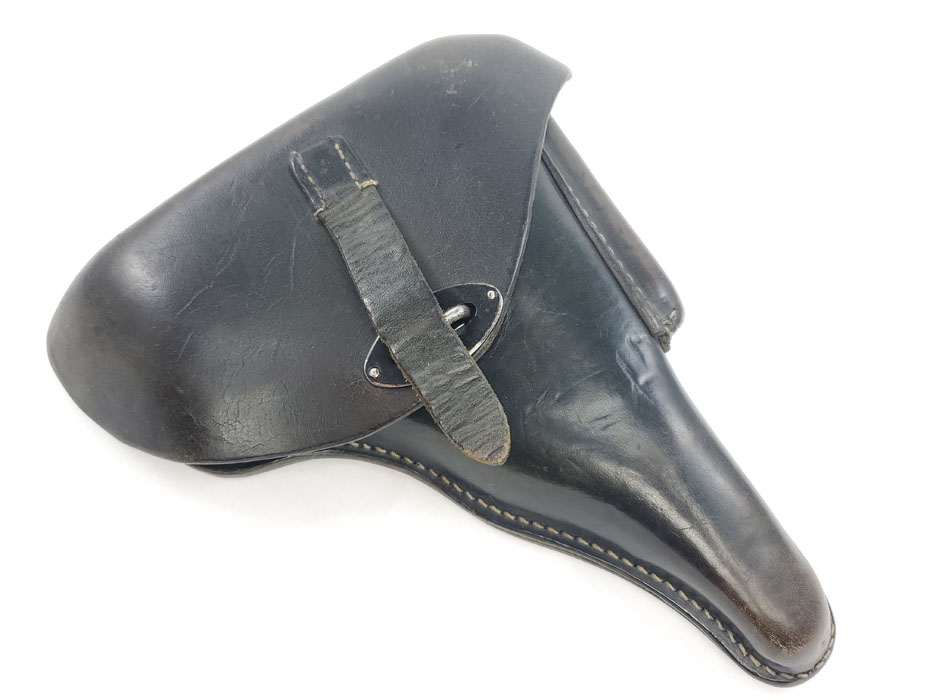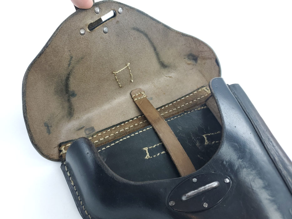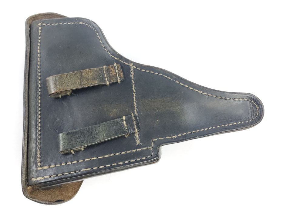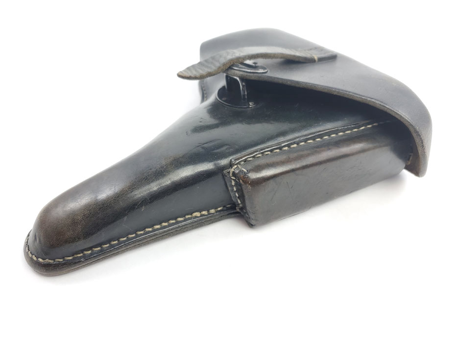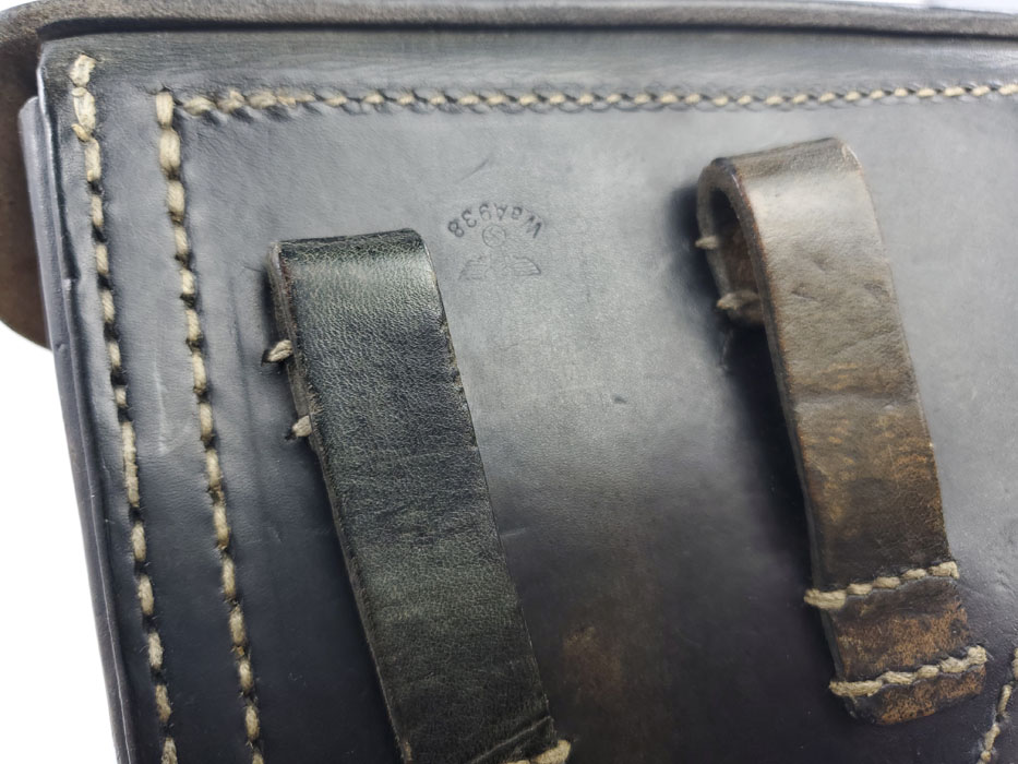 5/11/20 – This is an original WW2 era P.38 holster with a waffen military proof stamp on the back leather. There are no other markings besides the waffen proof, which is interesting and rare. We’re not exactly sure why, but there isn’t even a maker stamp on this holster. The inspection proof is strongly struck and original. The leather is clean with a little dye loss near the toe, but otherwise strong, clean leather and all original stitching. A great collector’s holster as it can virtually match any date P.38.