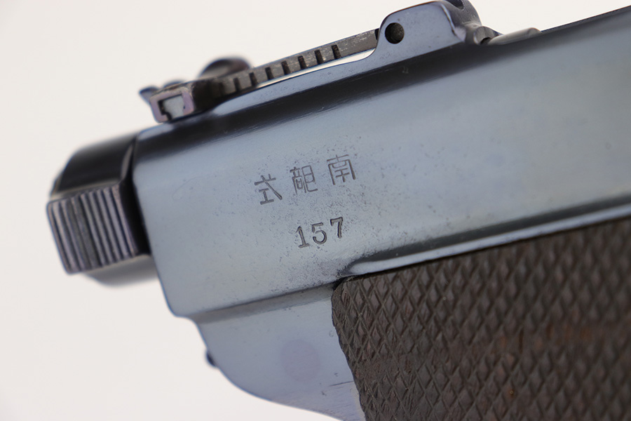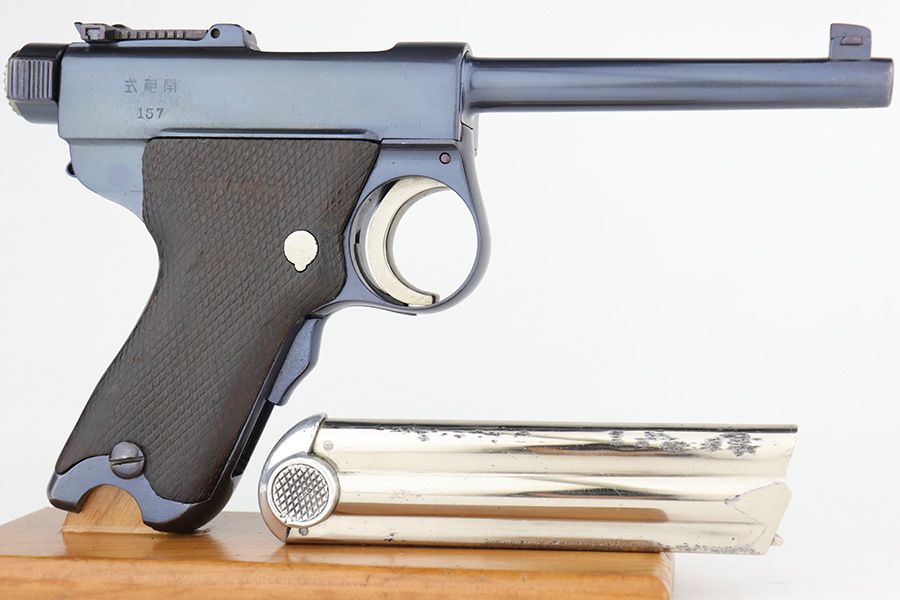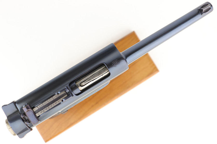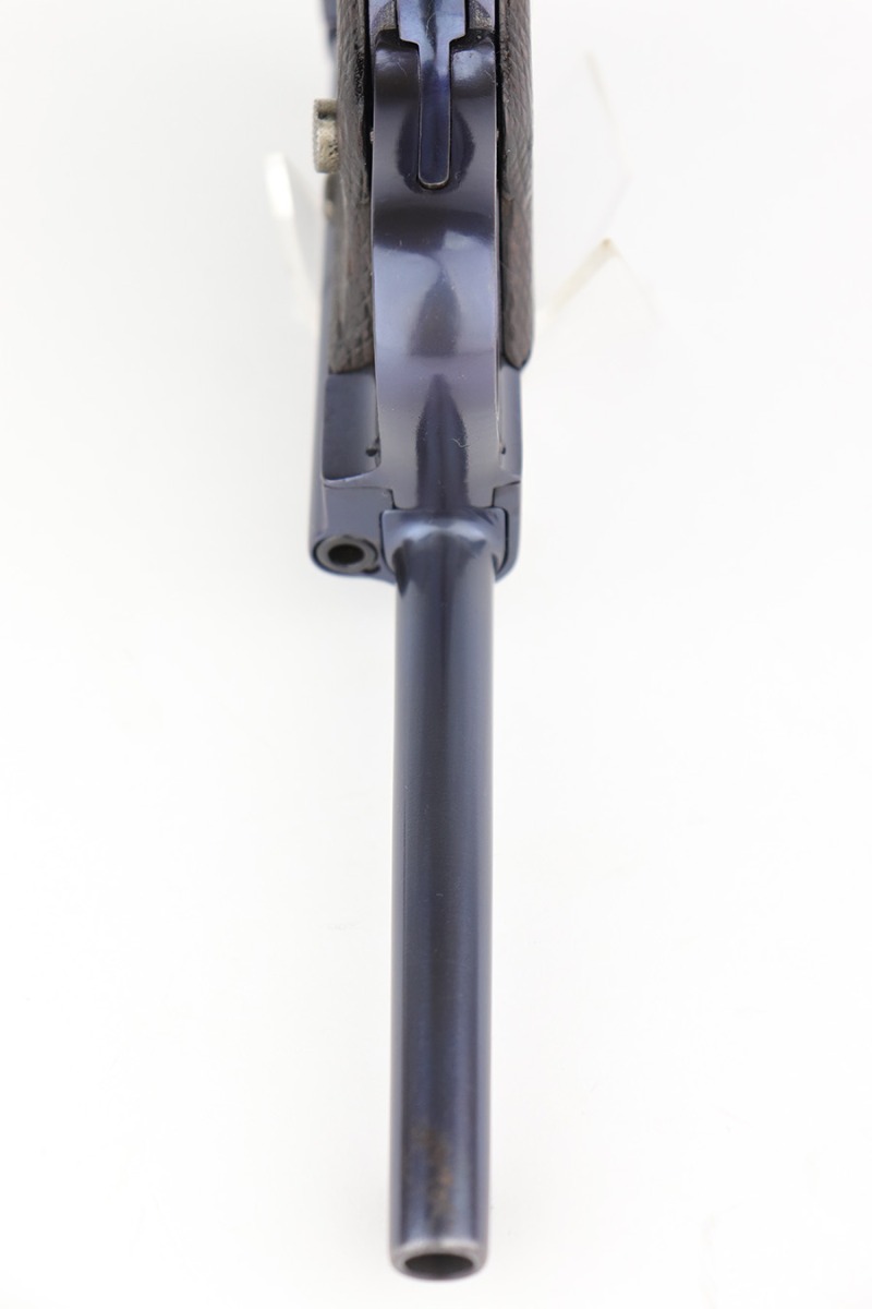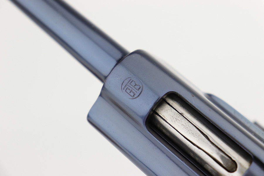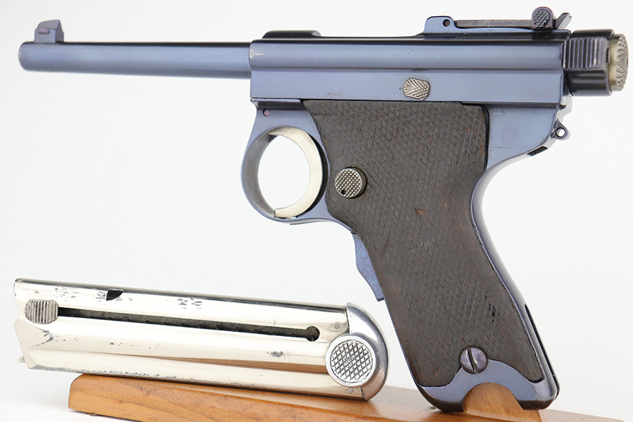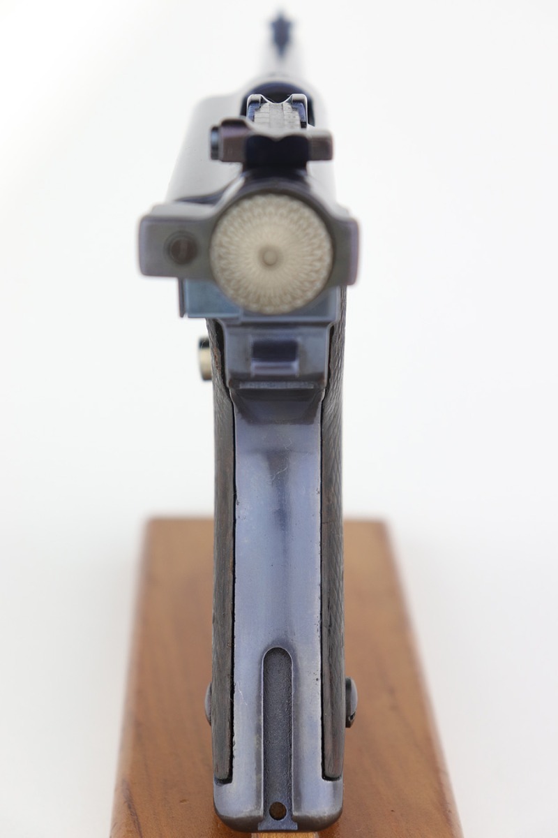 1/17/23 – This is a rare Papa Nambu made in the early 1920s. Most Papa Nambu pistols were Navy issued and marked with an anchor. This one was Army issued, as best we can tell due to the lack of anchor marking. The pistol comes as a rig with a reproduction Type 14 leather holster (the fit is good), a reproduction cleaning rod, and original magazine that does not match the gun. The entire gun has been professionally restored and refinished, so the bluing is really nice, almost no actual finish loss. There is just some minor pin-pricking under the bluing on the right side of the gun. The rifling in the bore is fairly worn with pin-pricking and light oxidation in the grooves.