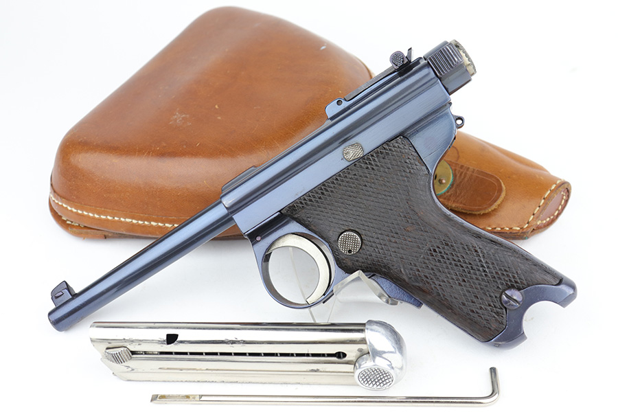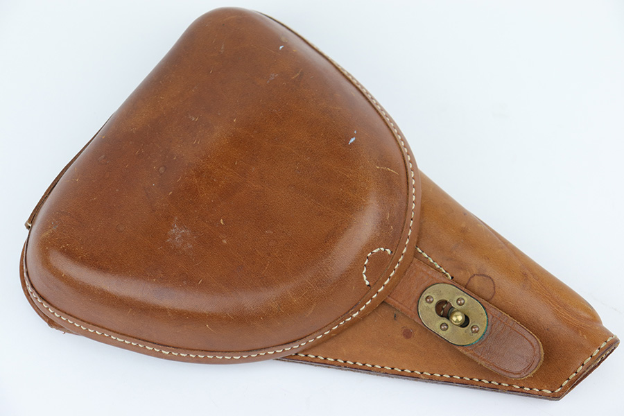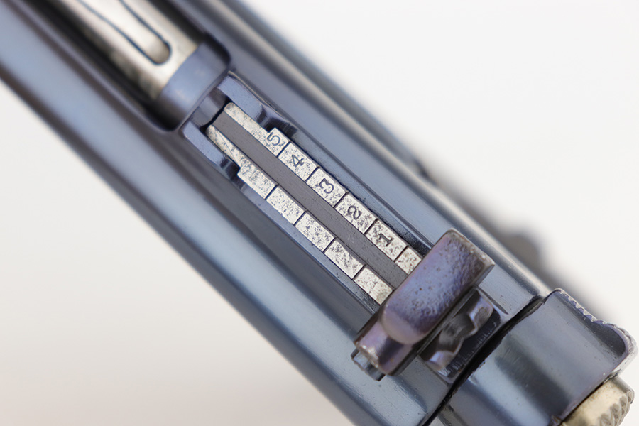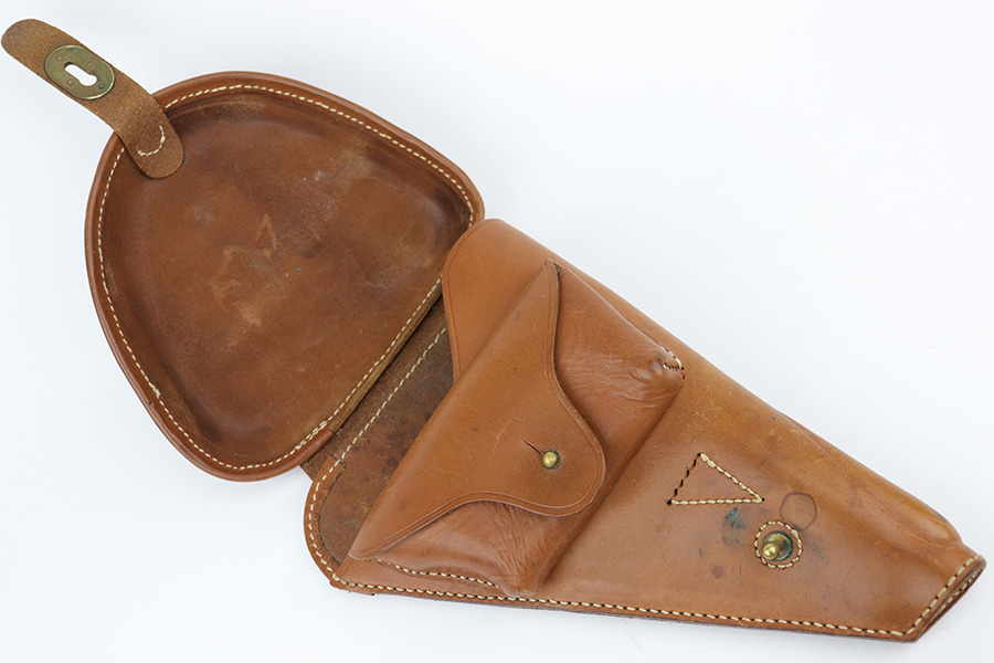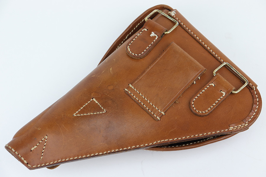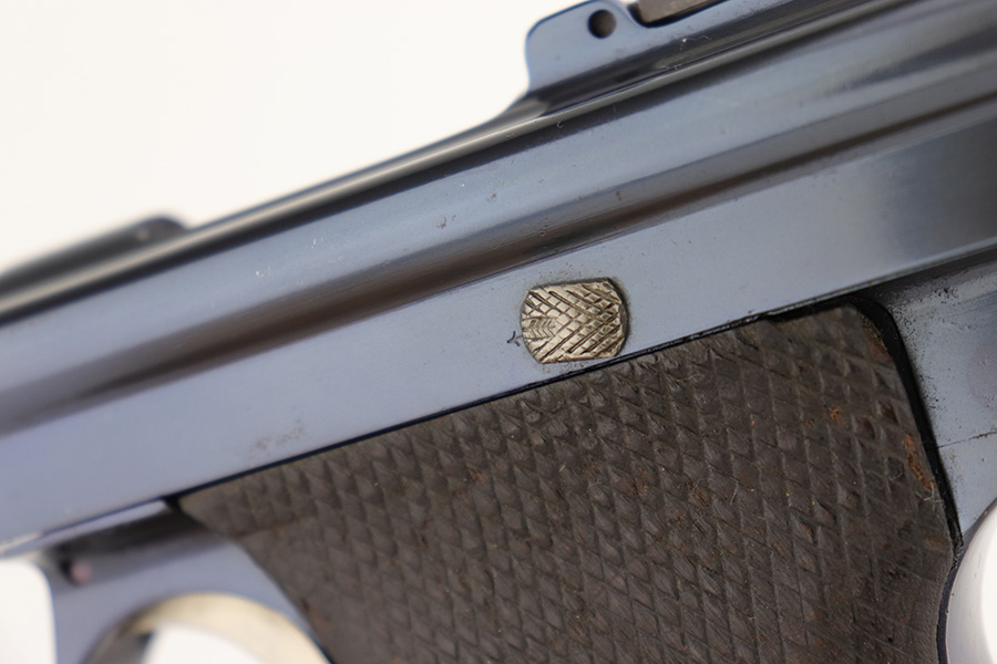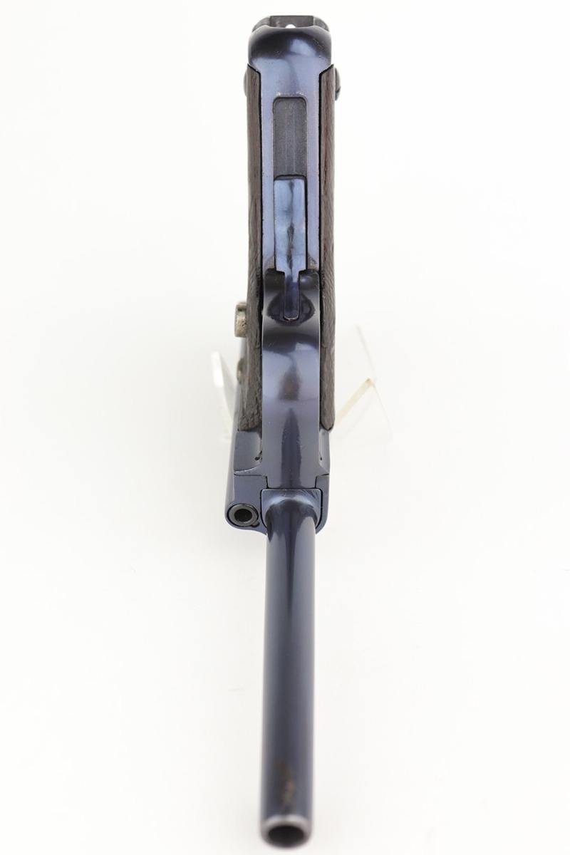 1/17/23 – This is a rare Papa Nambu made in the early 1920s. Most Papa Nambu pistols were Navy issued and marked with an anchor. This one was Army issued, as best we can tell due to the lack of anchor marking. The pistol comes as a rig with a reproduction Type 14 leather holster (the fit is good), a reproduction cleaning rod, and original magazine that does not match the gun. The entire gun has been professionally restored and refinished, so the bluing is really nice, almost no actual finish loss. There is just some minor pin-pricking under the bluing on the right side of the gun. The rifling in the bore is fairly worn with pin-pricking and light oxidation in the grooves.