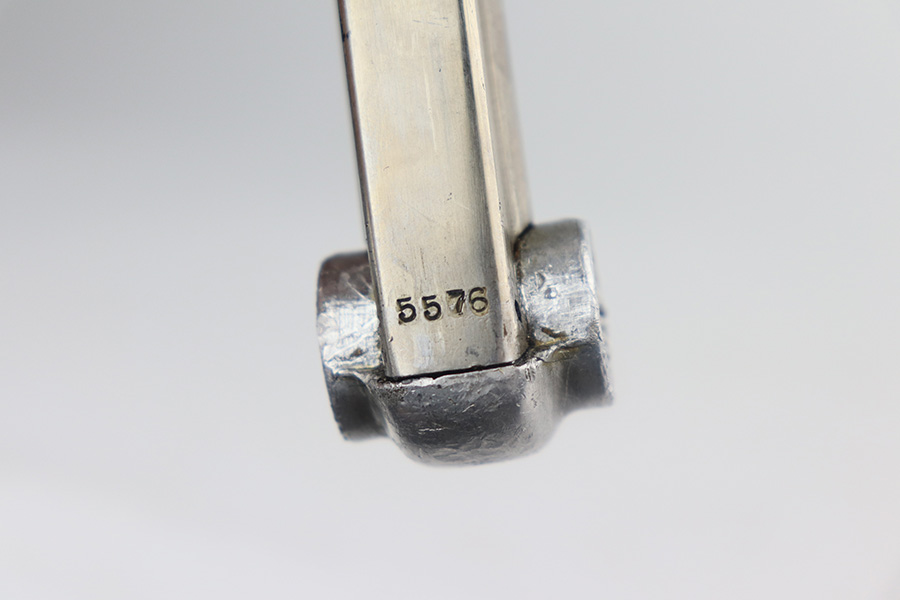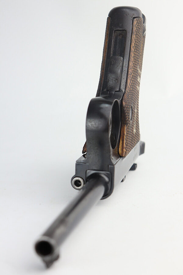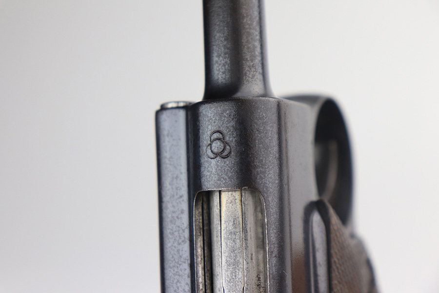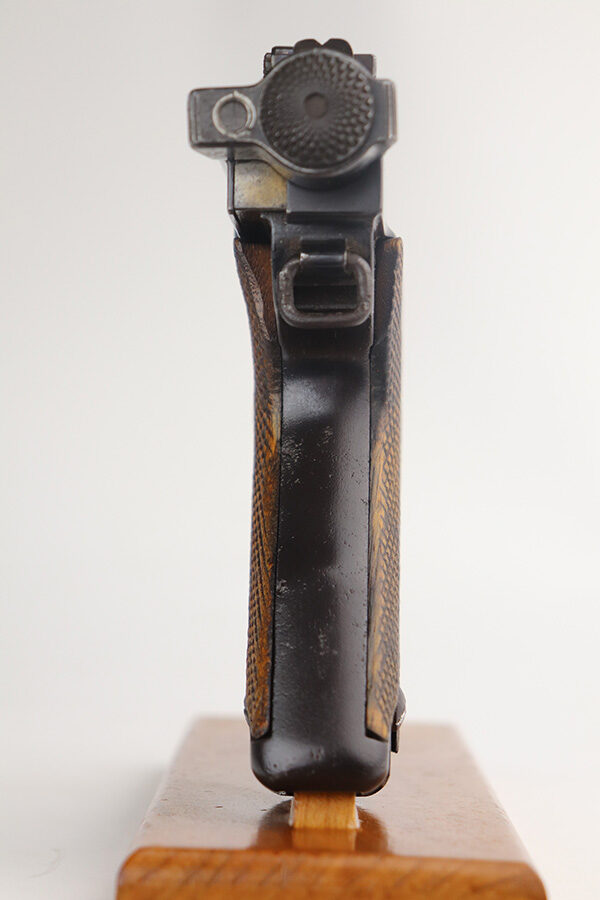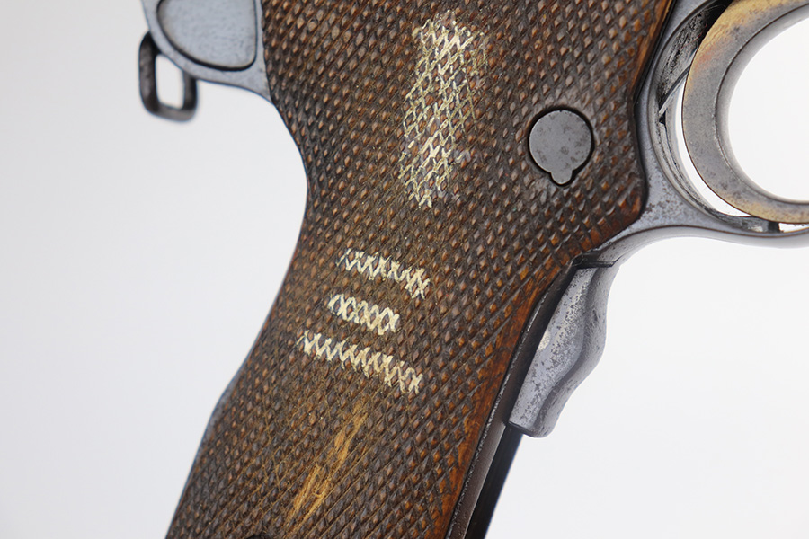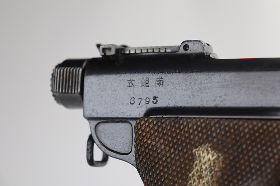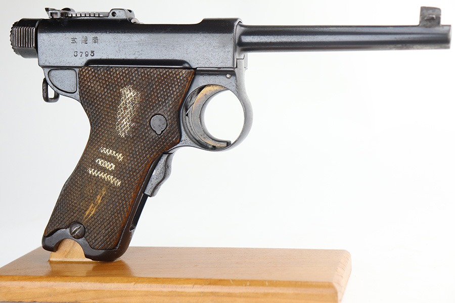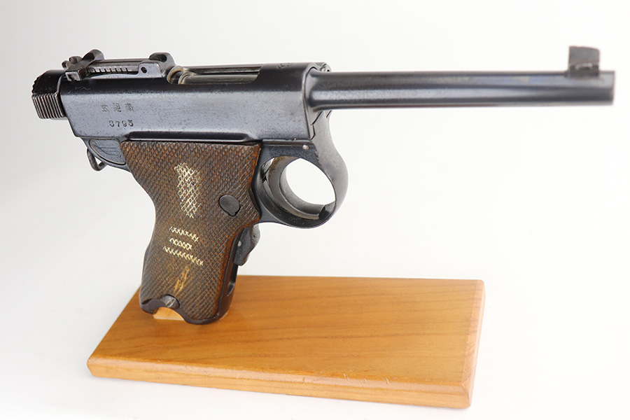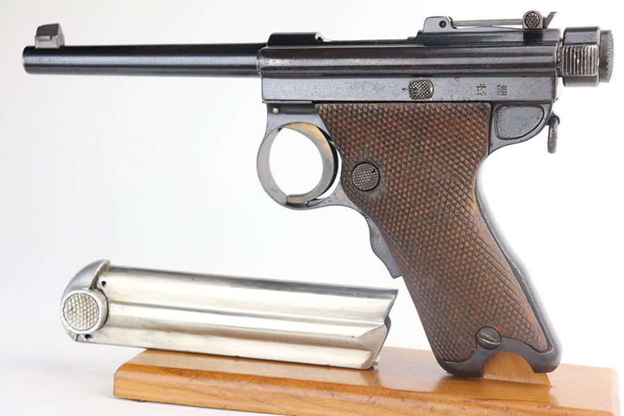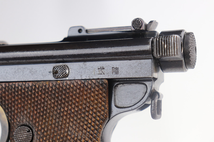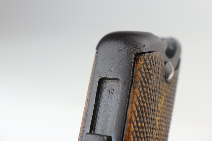 5/27/21 – This is a nice example of a rare Japanese Papa Nambu manufactured in the 1920’s. It is all matching and comes with one period original but mismatched magazine. These guns are a little difficult to rate. They were generally used near salt air, which causes oxidation. This one has very little actual finish loss, but there is heavy spotty oxidation throughout. Heavy brown patina and minor pitting on the straps. Nice un-numbered wood grips with white markings on the right side. The left panel is a little loose. The bore is shiny with strong rifling and spotty freckling throughout.