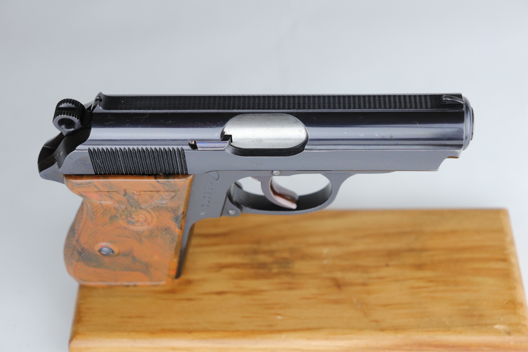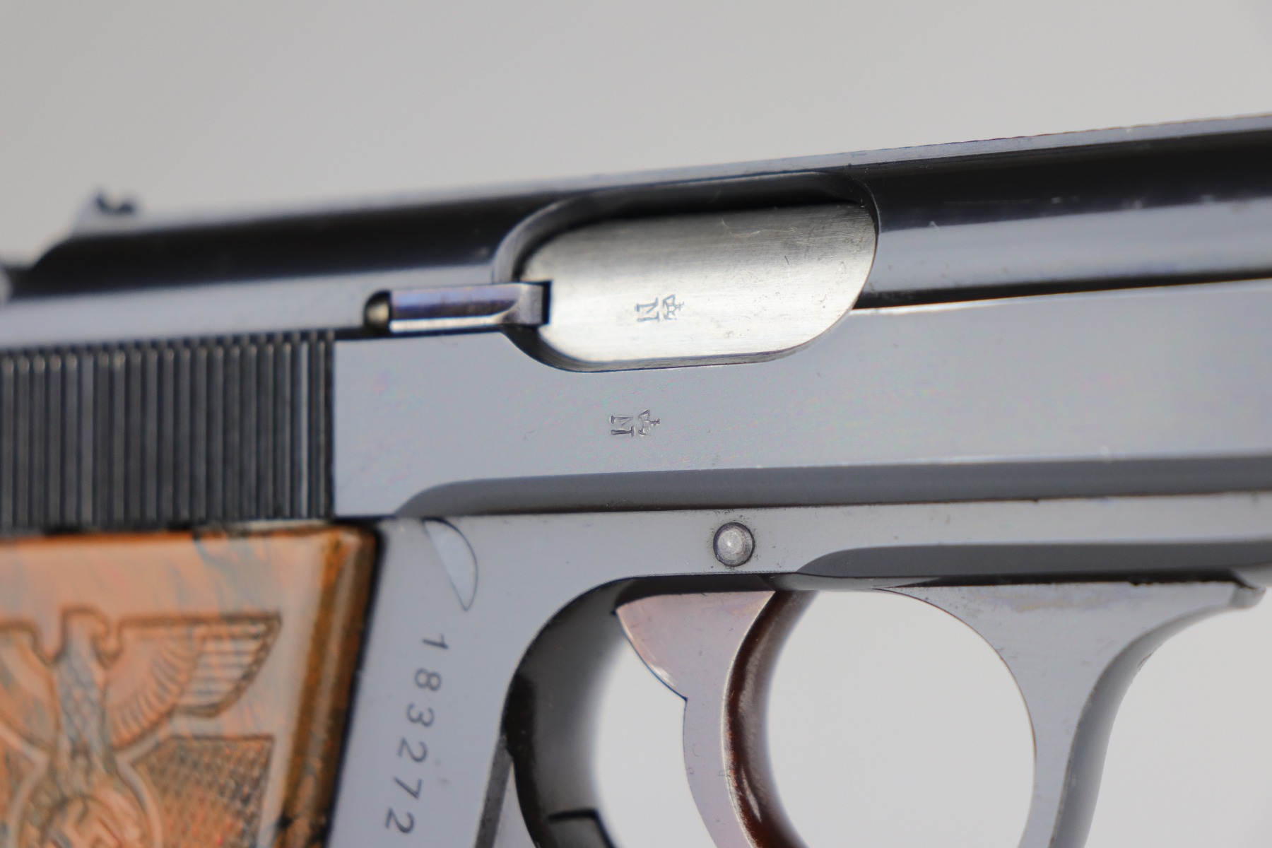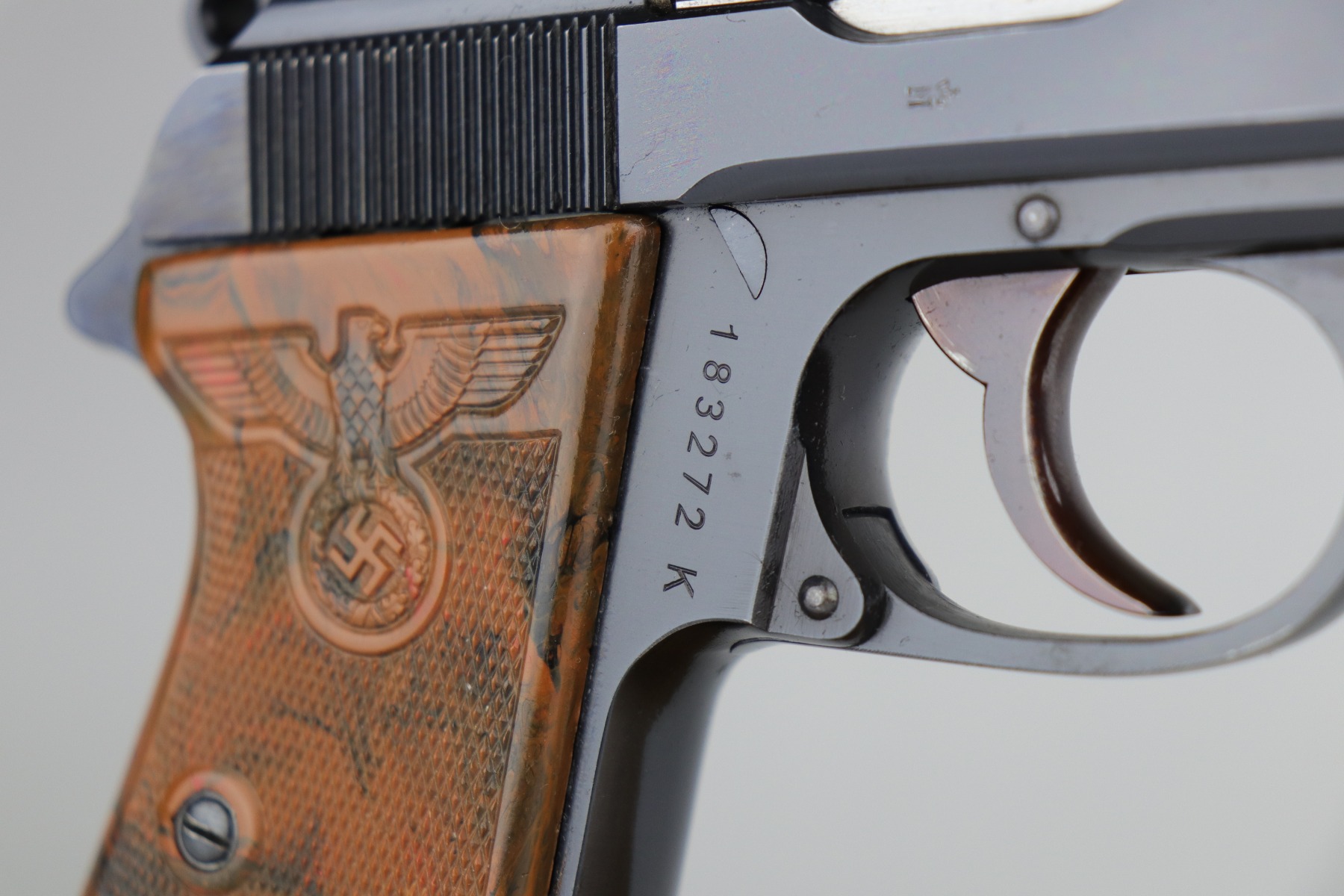 7/3/20 – This is a gorgeous rare Nazi Party Leader Walther PPK pistol. It was manufactured around 1939. This one is in suberb condition. It has retained about 98% of its original finish. The only sign of wear is very minor muzzle wear and a few very light surface marks on the slide. The trigger is a beautiful plumb color. The brown party leader grip is in stunning condition – no cracks or chips. It comes with brown finger extension magazine. The bore is minty.