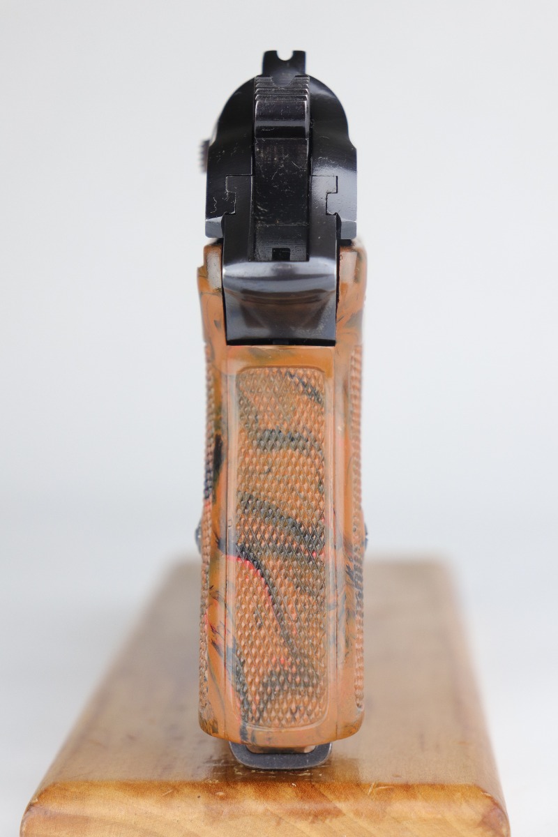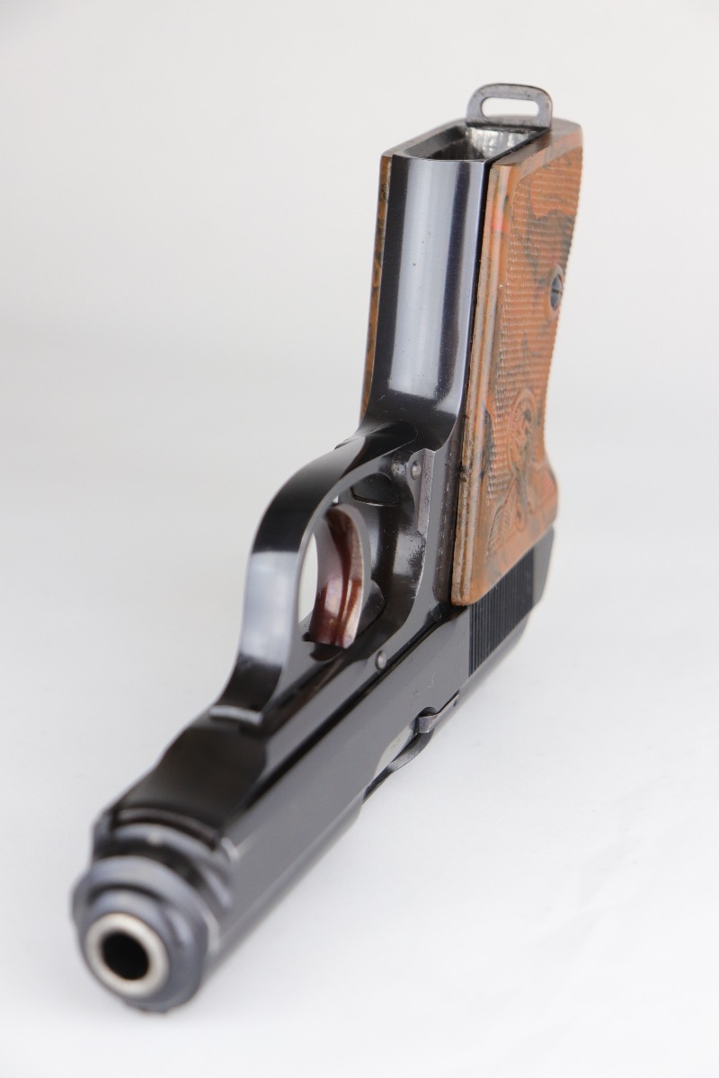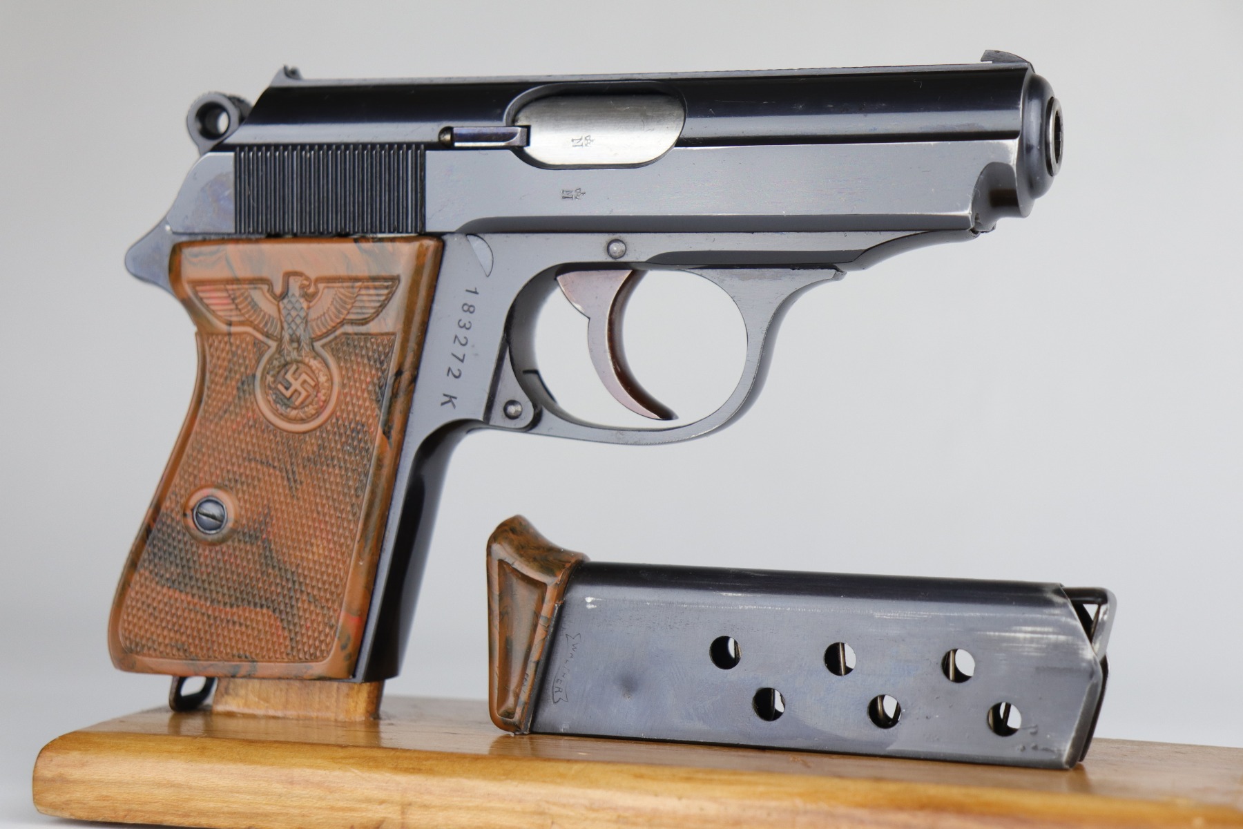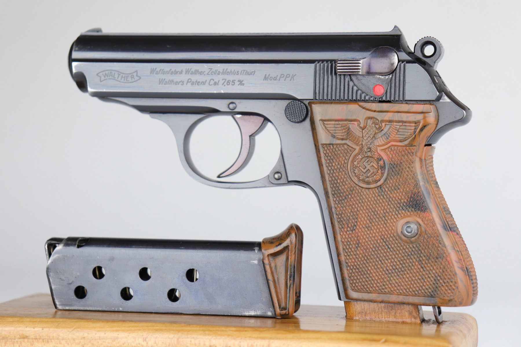 7/3/20 – This is a gorgeous rare Nazi Party Leader Walther PPK pistol. It was manufactured around 1939. This one is in suberb condition. It has retained about 98% of its original finish. The only sign of wear is very minor muzzle wear and a few very light surface marks on the slide. The trigger is a beautiful plumb color. The brown party leader grip is in stunning condition – no cracks or chips. It comes with brown finger extension magazine. The bore is minty.
