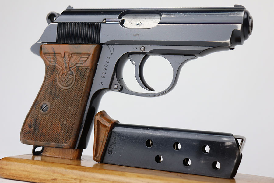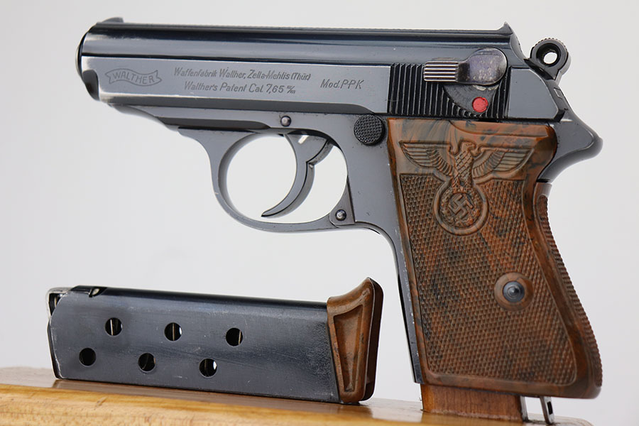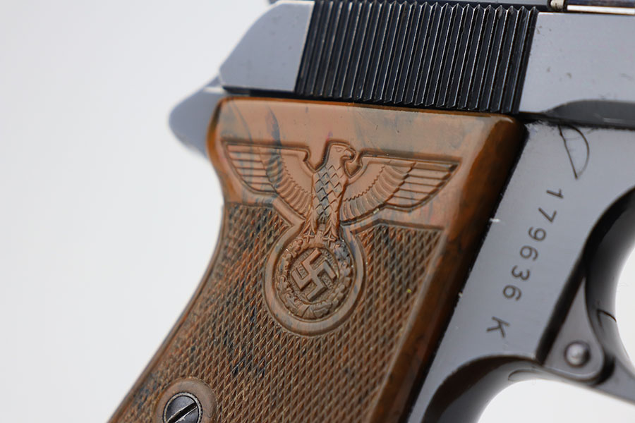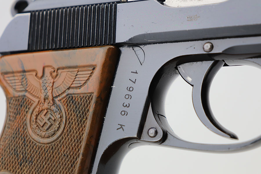 The Walther PPK with Party Leader Grips was the “Honor Weapon of the Political Leaders”. The Hoheitsabzeichen or High Insignia is the Eagle over Swastika found on either side of the grips where the Walther banner is normally located. The person entitled to wear the honor weapons that were awarded them by the Fuhrer were the Political Leaders of the national, regional and district territories, as well as leaders of local and support units. The persons who wore the honor weapon had their authorizations listed in the district personnel offices, and had to have in their possession a weapons permit issued by the police, which was obtained through official channels. These rare pistols were estimated to number around 3,500, and are widely faked, but this one is guaranteed original.