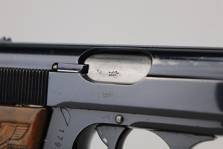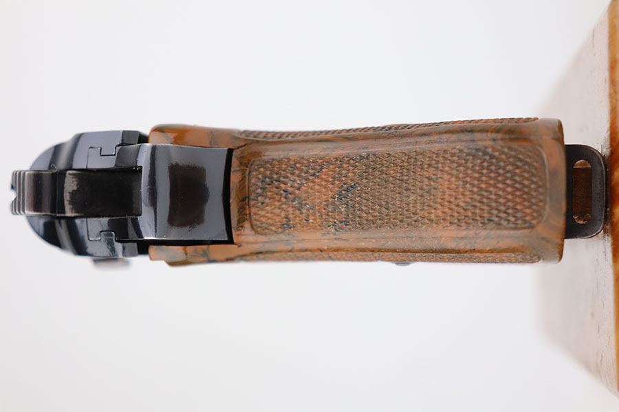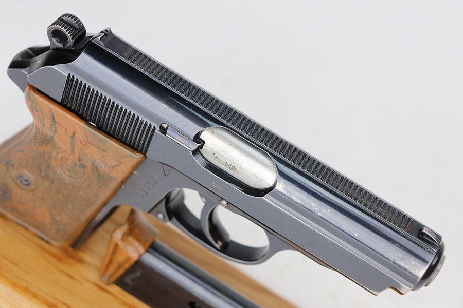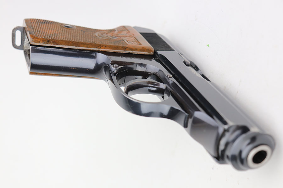 3/30/21 – This is a rare Party Leader Walther PPK from the Nazi era. The original blue rates at about 95-96%, with only minor bluing loss on either side of the muzzle, and a little more on the rounded portion of the right side of the slide. The serial number on the interior of the slide is matching with the frame. The serial dates it to 1938, and is in the correct range for the issuance of the Party Leader “Honor” Grip. The grip is in excellent condition with a nice color swirl. It is in excellent condition with just a small, minor crack on the upper corner of the spine. Minty bore. Excellent finger extension magazine, without cracks or chips.