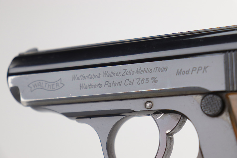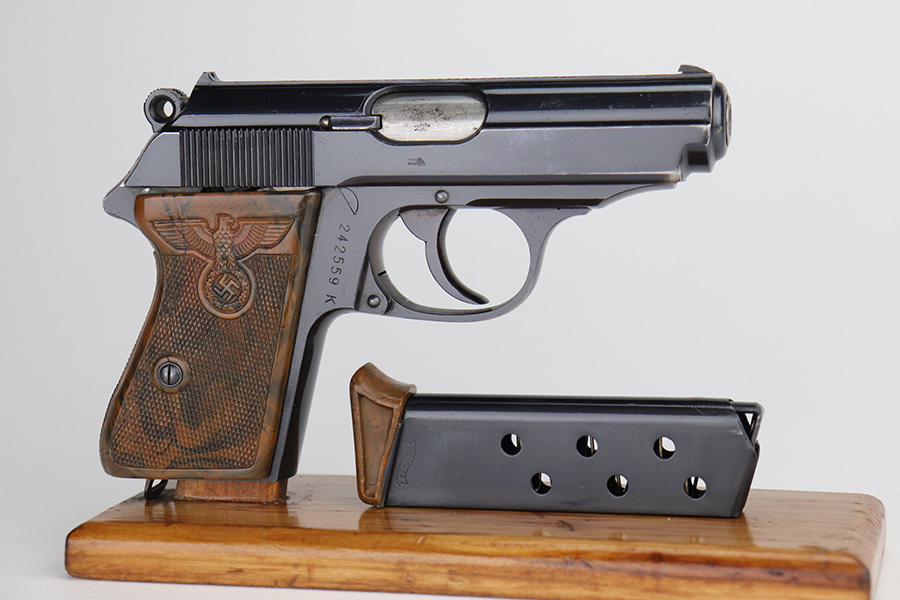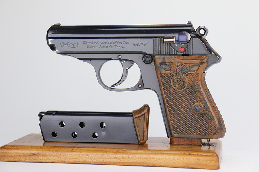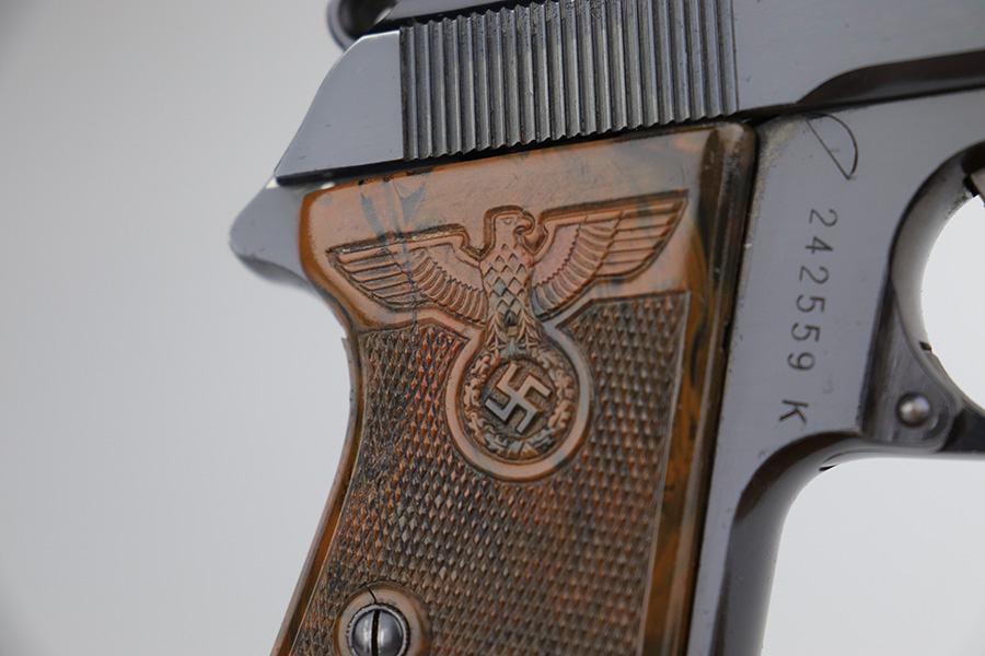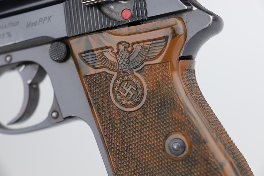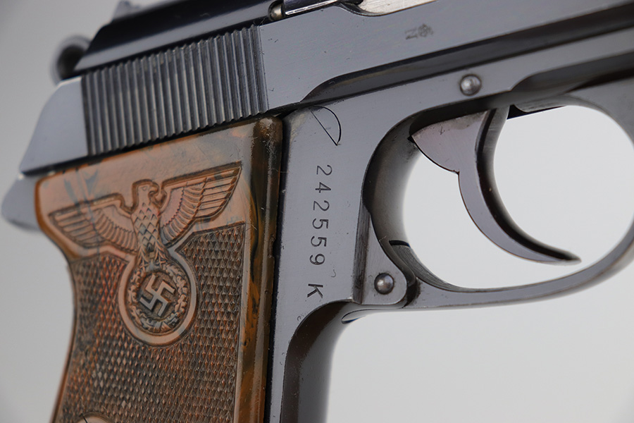 The Walther PPK with Party Leader Grips was the “Honor Weapon of the Political Leaders”. The Hoheitsabzeichen or High Insignia is the Eagle over Swastika found on either side of the grips where the Walther banner is normally located. The person entitled to wear the honor weapons that were awarded them by the Fuhrer were the Political Leaders of the national, regional and district territories, as well as leaders of local and support units. The persons who wore the honor weapon had their authorizations listed in the district personnel offices, and had to have in their possession a weapons permit issued by the police, which was obtained through official channels. These rare pistols were estimated to number around 3,500, and are widely faked, but this one is guaranteed original.