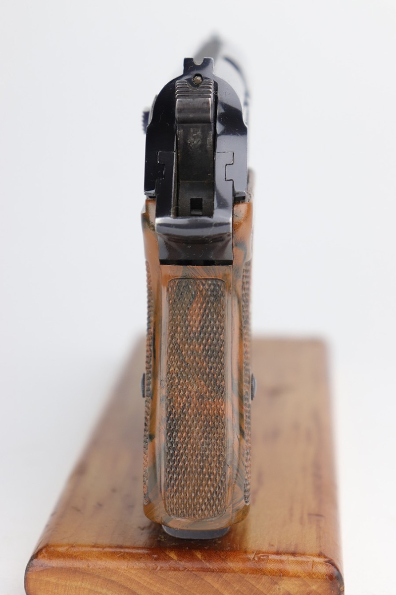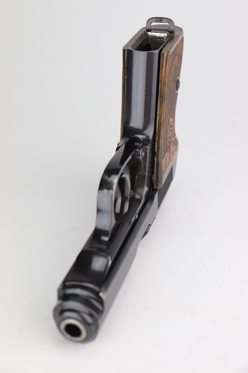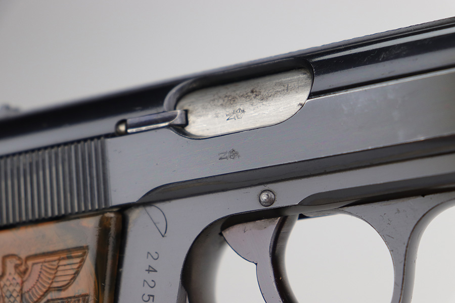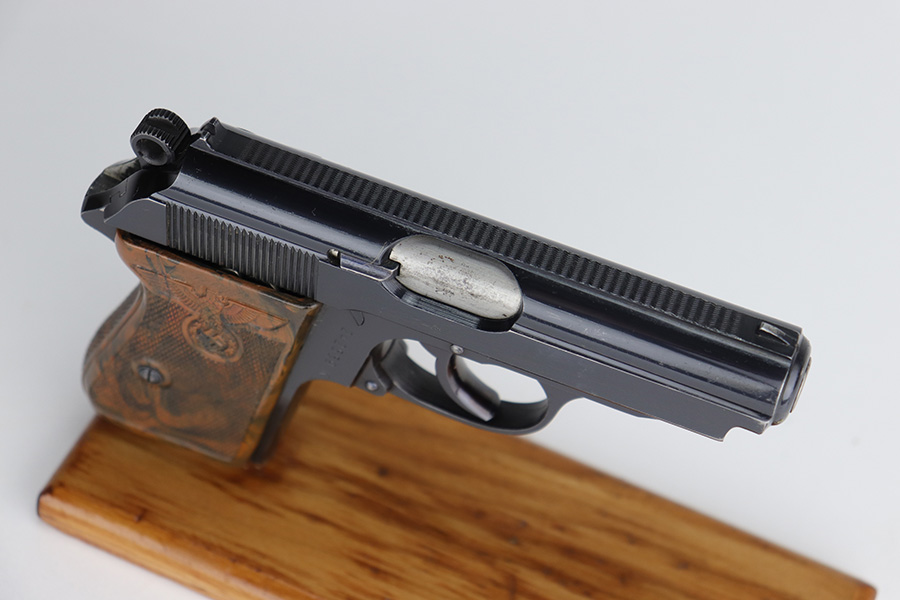 1/6/23 – This is a rare Party Leader Walther PPK from the Nazi era. The original blue rates at about 94-95%, with bluing loss on either side of the muzzle, and a little more on the trigger guard. The serial number on the interior of the slide is matching with the frame. The serial dates it to 1939, and is in the correct range for the issuance of the Party Leader “Honor” Grip. The grip is in excellent condition with a gorgeous color swirl, but there is a professionally repaired crack on the right side. Minty bore. Excellent finger extension magazine, without cracks or chips. Mechanically excellent.