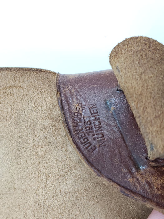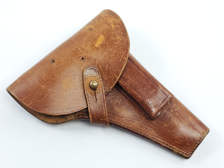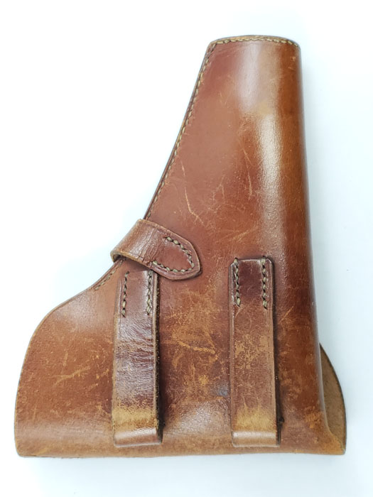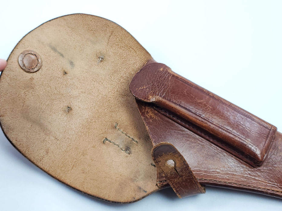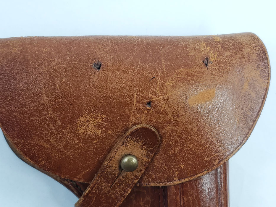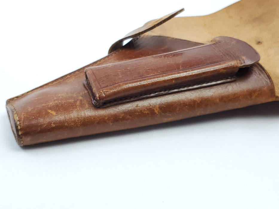 4/14/20 – This is a rare brown leather Walther PP holster made by EUGEN HUBER in 1937 Munich. Eugen Huber was the only known maker of PDM holsters. The holster is an unusual style, which makes sense as the PDM pistols are a rare variation. The maker stamp and date is located under the flap of the magazine pouch. The extra flap of leather going over the magazine pouch also proves the authenticity of this holster, as PDMs were known to be issued with two finger extension holsters (the extra flap being to protect the finger extension). The holster is in great condition with some exterior scuffing and signs of use. The biggest flaw is this was once embellished, as shown by the three holes on the front leather. Stitching is excellent and all original.
