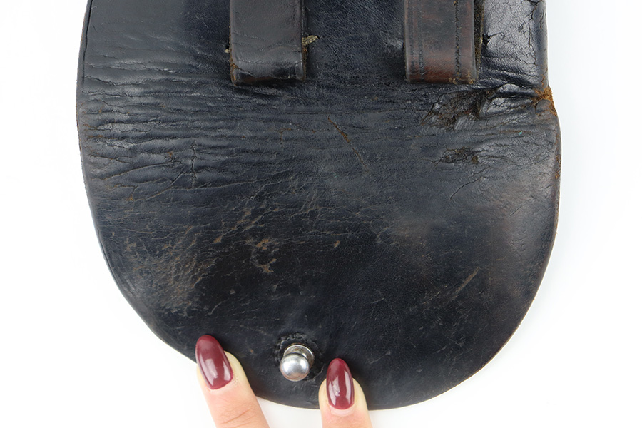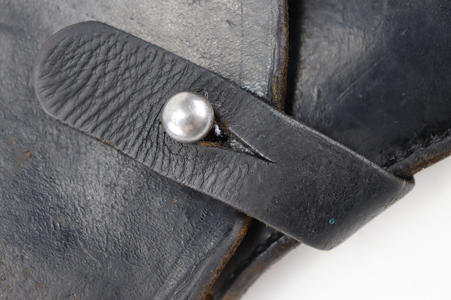 11/30/23 – This is an original, rare variation PDM Walther PP holster. The holster is maker stamped and dated on the front leather near the magazine pouch. The maker is located in Munich, and the style of magazine pouch is unique to the PDM production Police PP pistols. Good overall condition with some wrinkling and roughness on the exterior leather. Mostly surface scuffs and normal use / aging wear. Some small gouges of leather and cracking near the top portion of rounded leather, as shown. The stitching is all original and completely intact throughout. A highly collectible example.