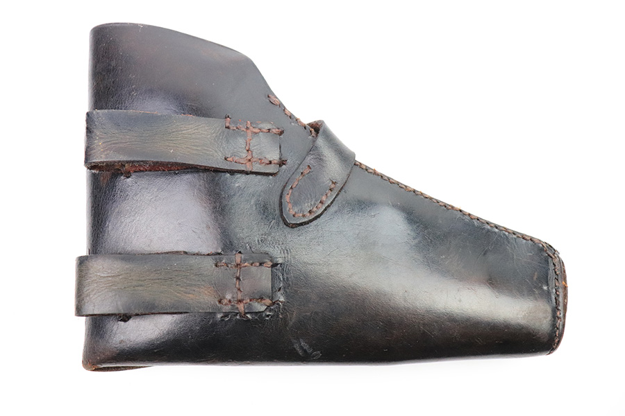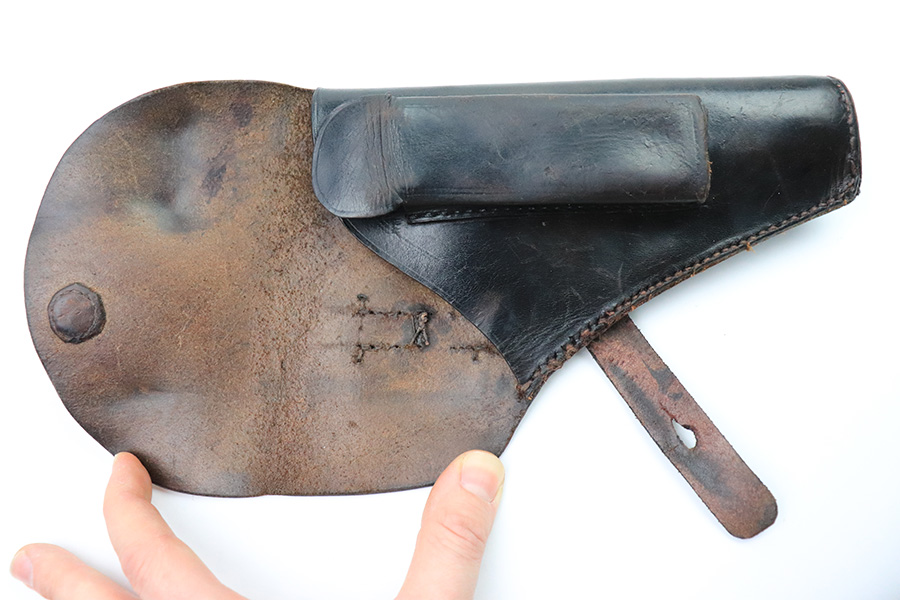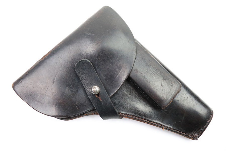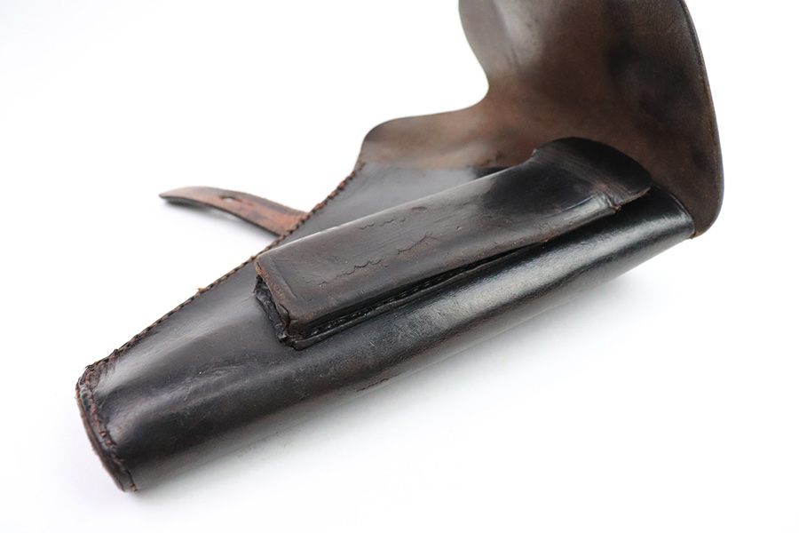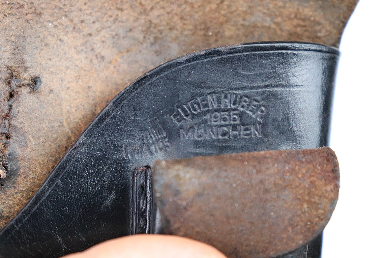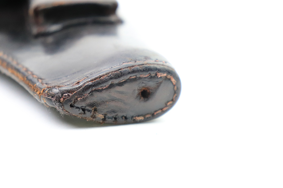12/15/22 – This is a rare variation, early PDM Police Walther PP holster from WW2. These are very rare holsters and have a unique style magazine pouch with an extended flap for a finger extension magazine. There’s not a lot of information out on these, and not many in circulation today. This example is in great overall condition. The leather shows some mild scuffing and surface wear, and the stitching appears original and intact. The holster is maker stamped, dated, and waffen proofed just above the magazine pouch. The maker stamp is clearly “Eugen Huber”, but the waffen code WaA105 is attributed to Carl Heinichen (from our research). This could be an earlier “pre-Heinichen” production, since manufacturing was scattered and a bit unorthodox in Germany during 1935. However, we did want to point this out as it certainly raises questions that we don’t have answers for. Regardless, this is a unique and rare variation holster.