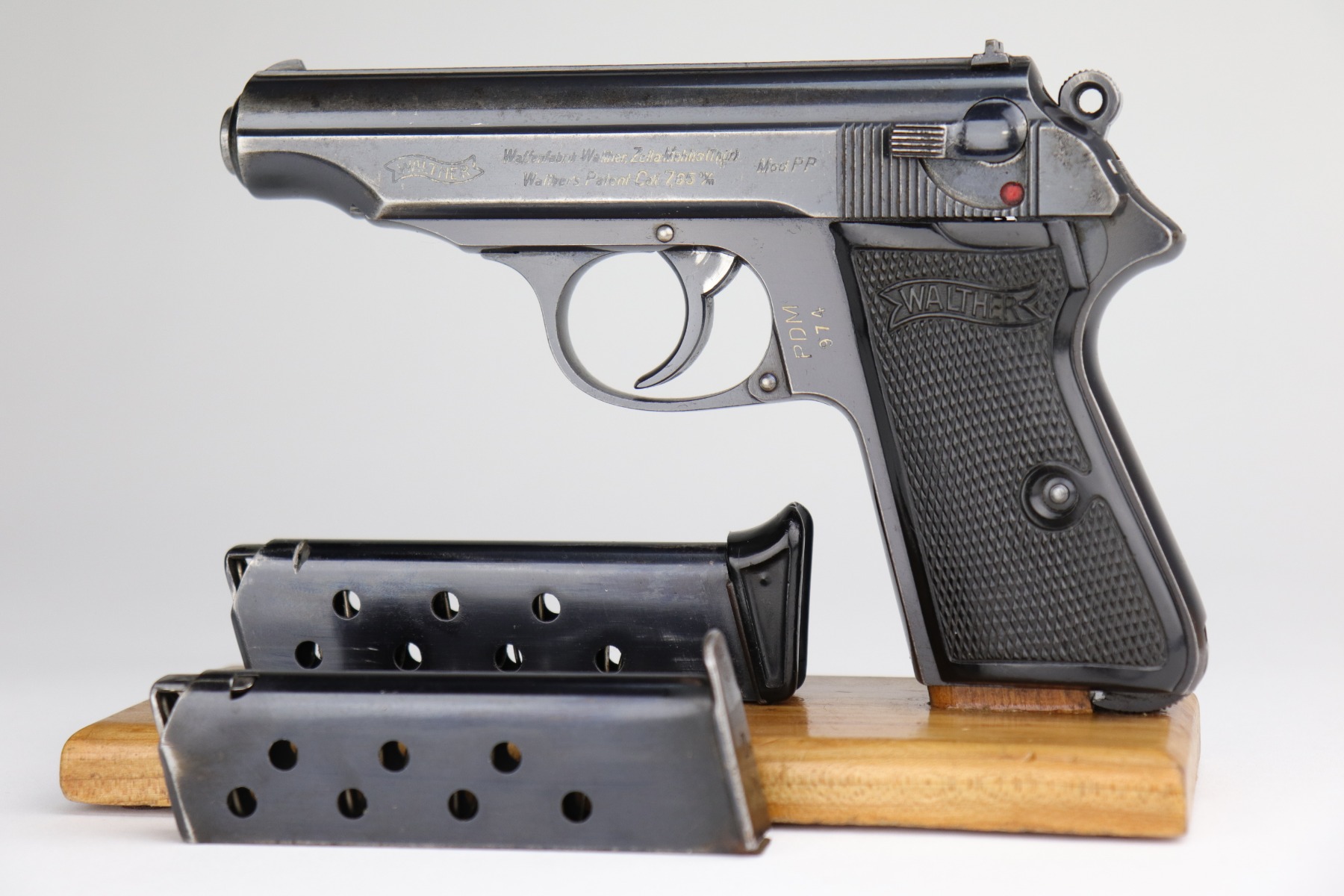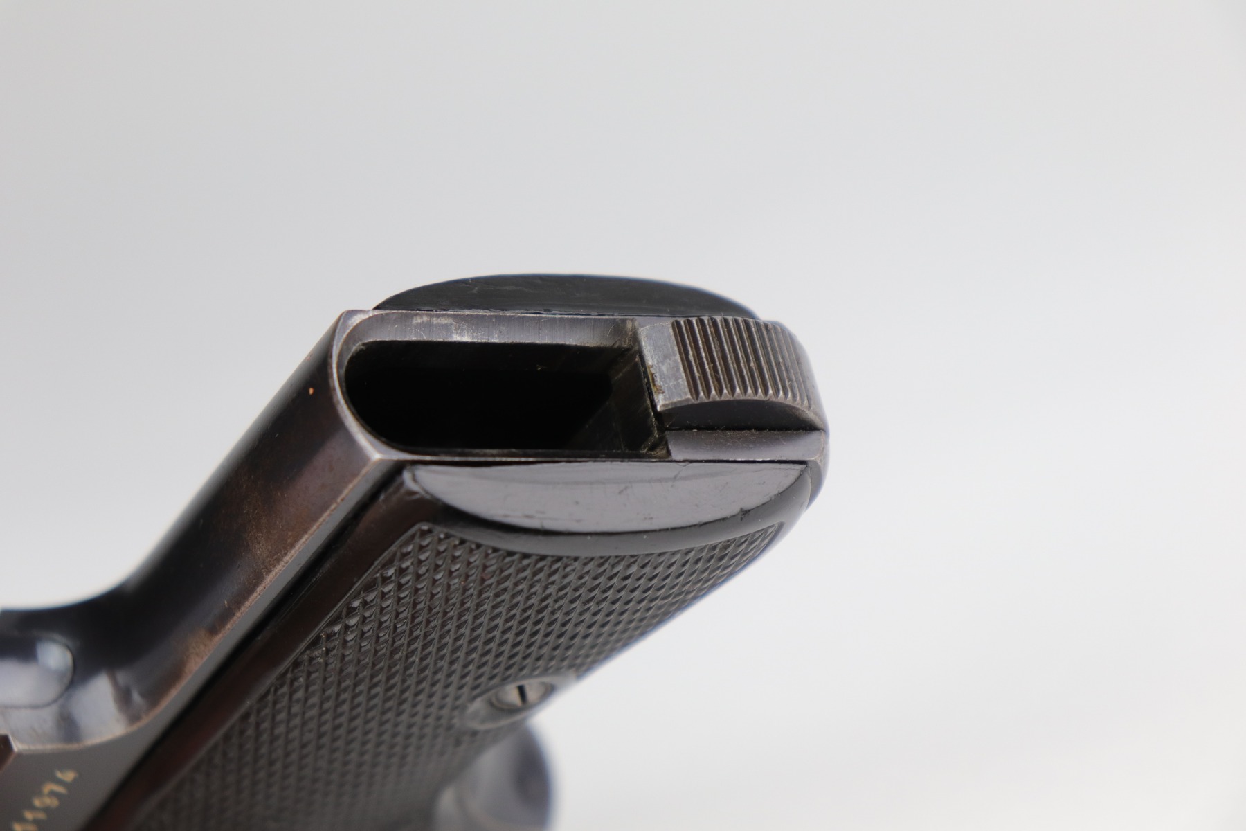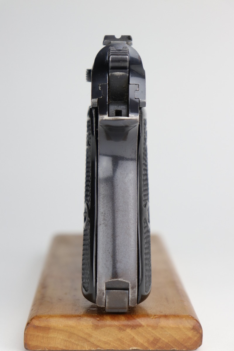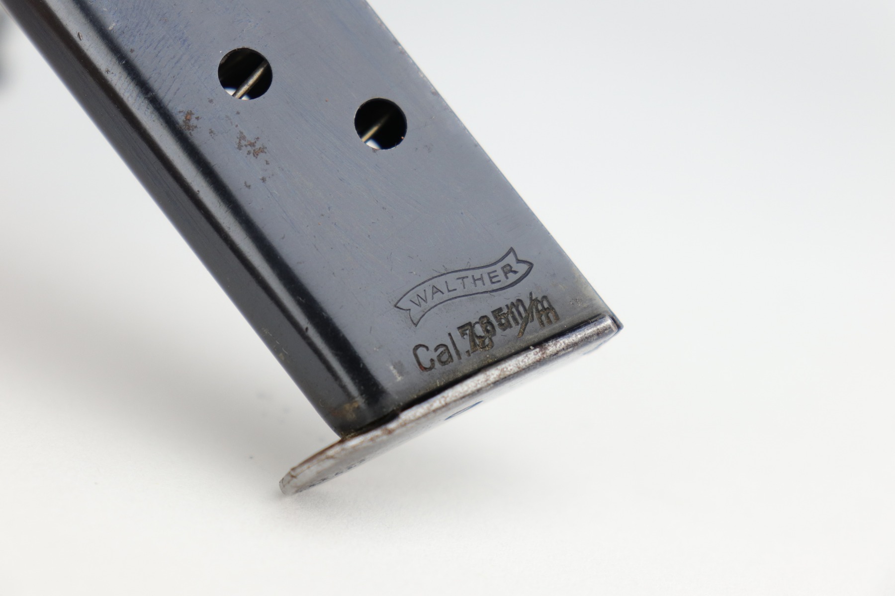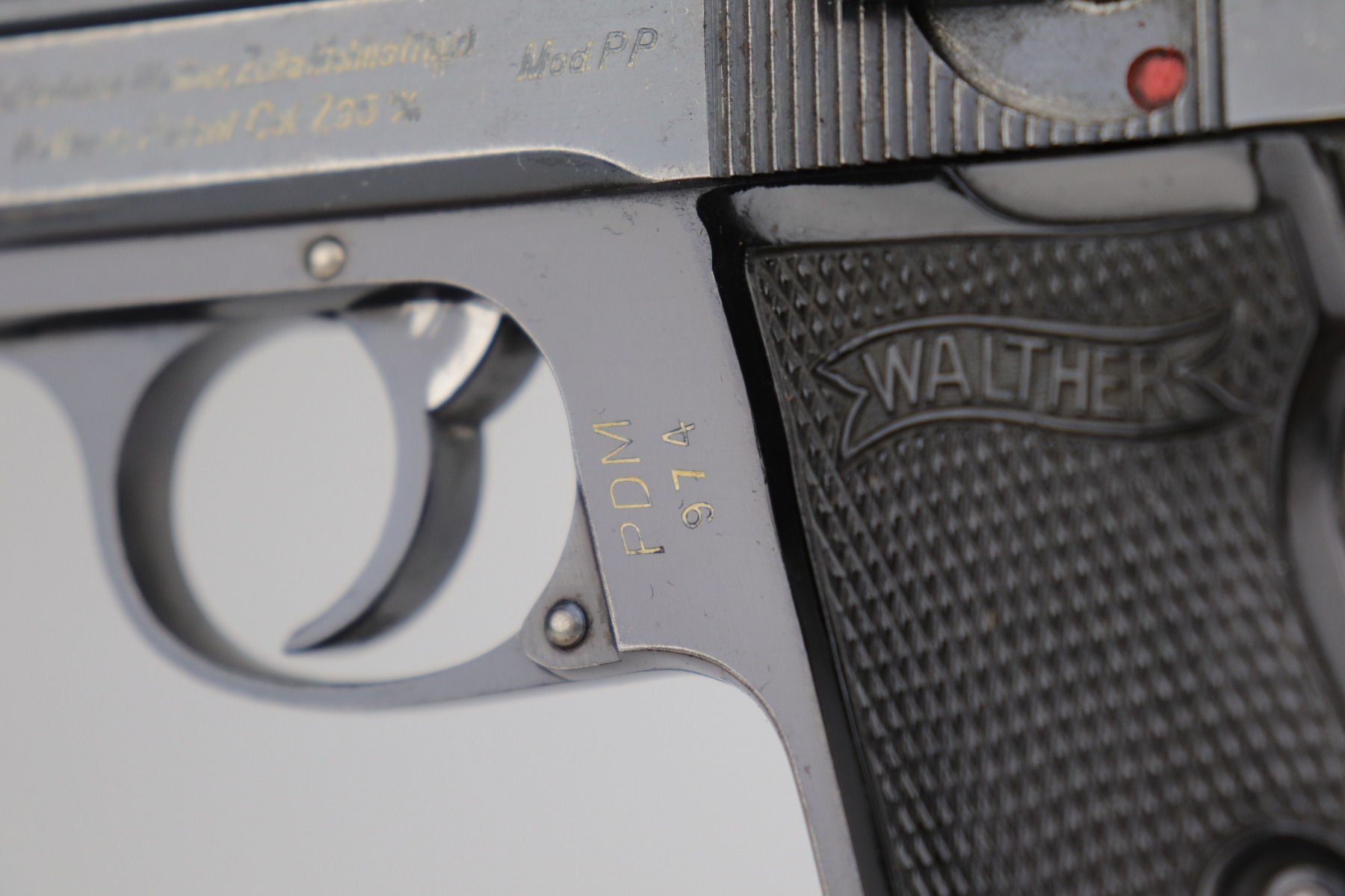 10/15/20 – This is a rare PDM Walther PP Rig, manufactured around 1935. In 1935, Himmler ordered about 1,800 PDM marked PP’s as head of all German Internal Security. PDM stands for Police Department of Munich, and the order was unique for the following reasons. These pistols came with a bottom release magazine, while all other 7.65mm PP’s had a push button mag release. The proper PDM magazine will have no notch for the push button release. These pistols also have a strengthened ‘fluted’ barrel, visible on the muzzle end of the barrel, which a standard PP slide would not fit. This pistol falls in the correct serial range. This gun has retained about 85% of its original bluing. There is muzzle wear, high edge wear on the slide, and spotty wear along the top of the slide, and an area of wear on the right side of the slide. There is also some spotty oxidation on the slide. Minor pin-pricking on both straps. The bore is shiny and minty. The rig comes with a Berlin-marked, 1937-dated black leather holster. It also comes with one finger extension and one flat bottom magazine. The flat bottom mag is notched. The finger extension mag originally did not have a notch (proper) but a crude notch was added.