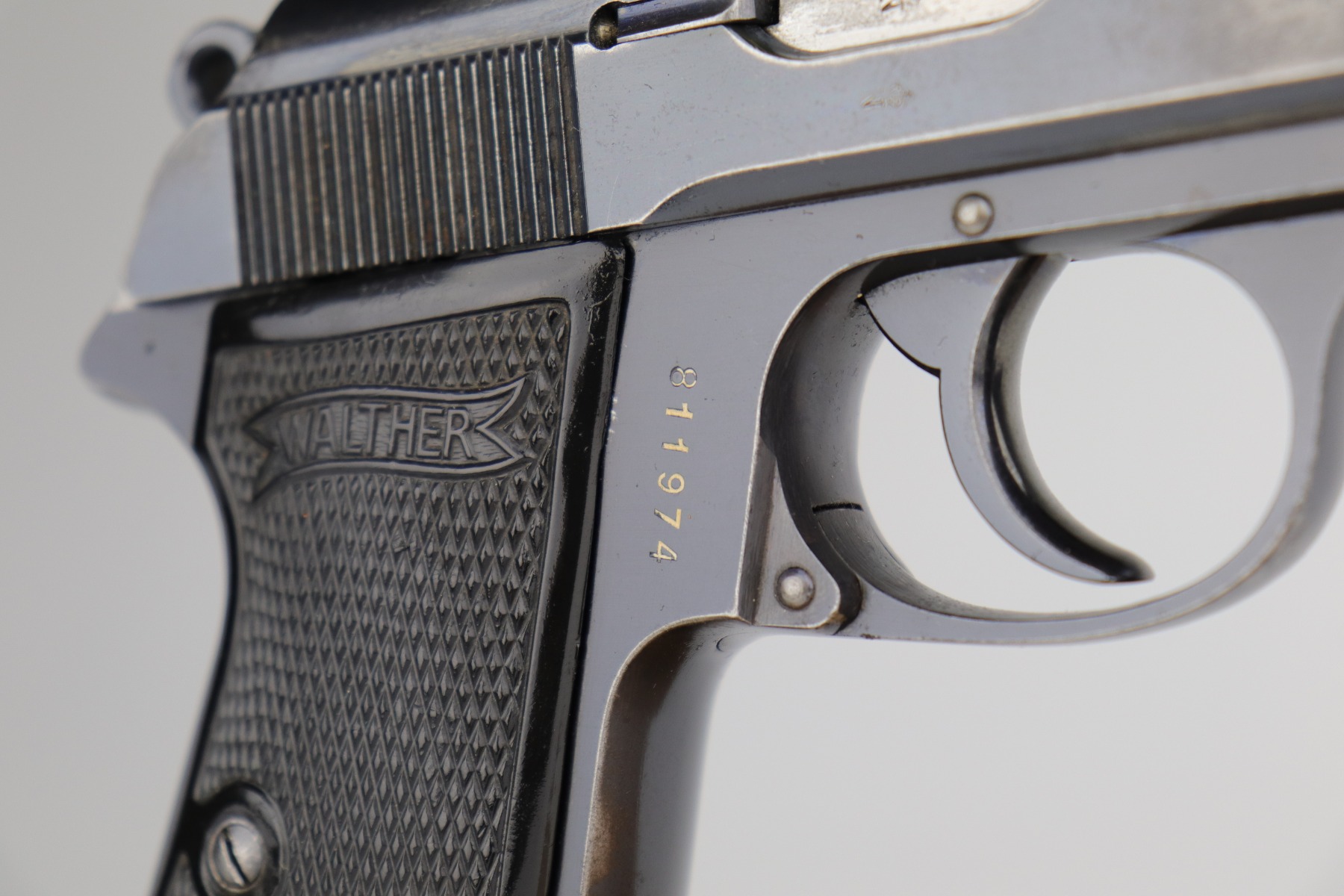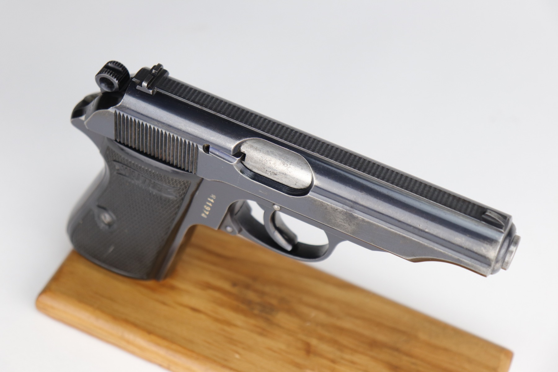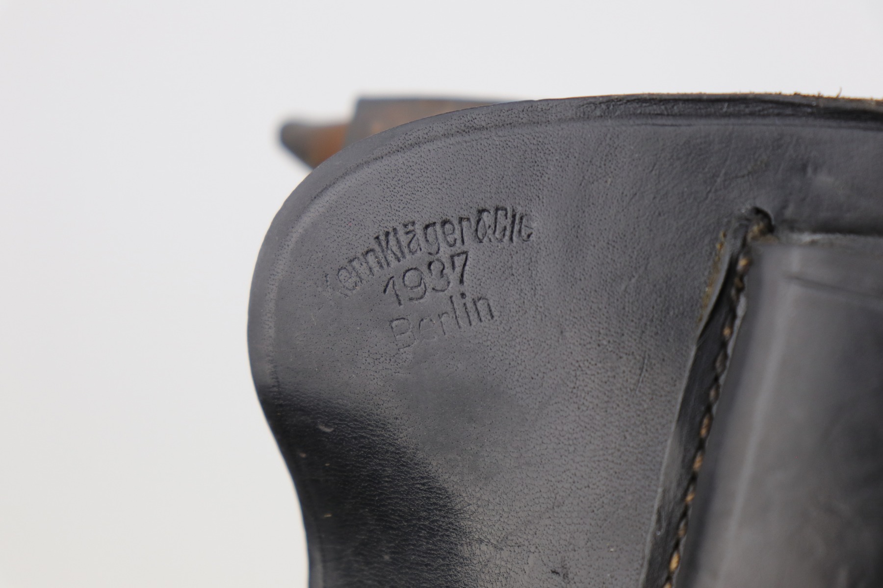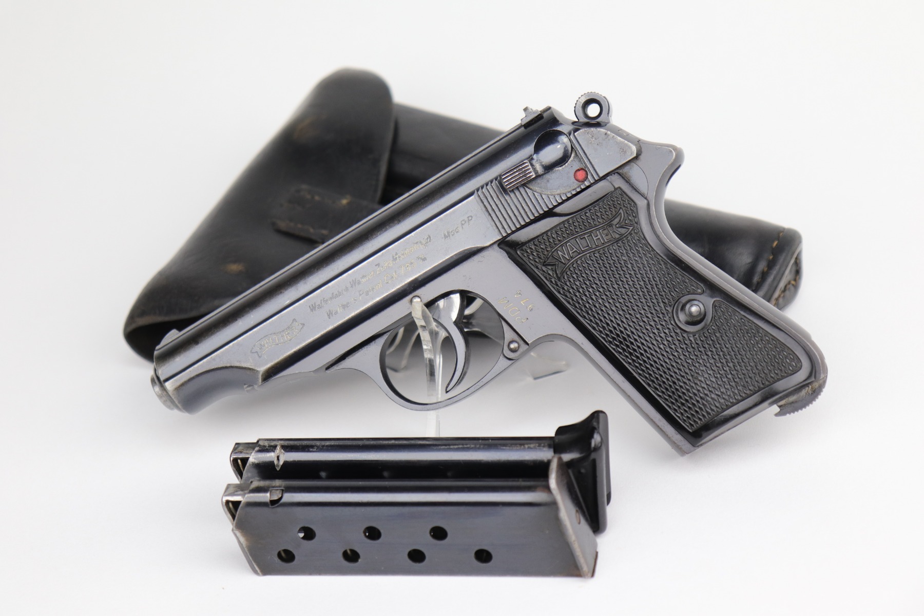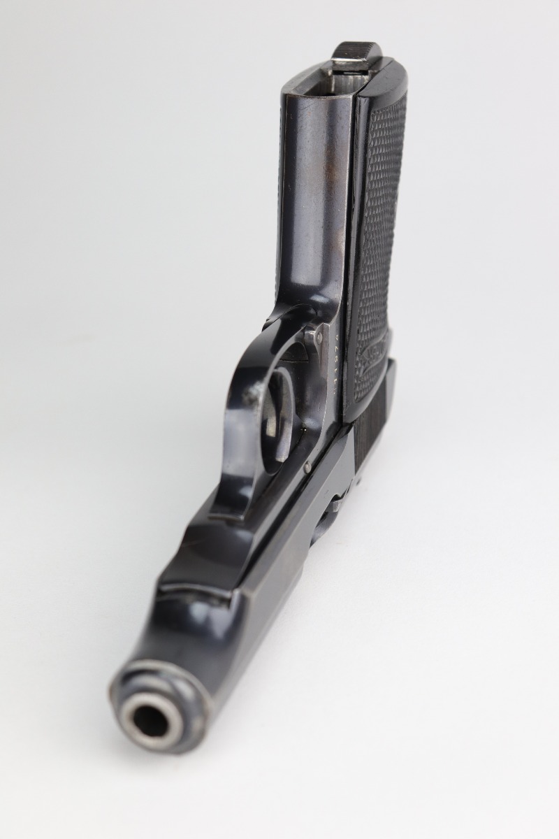 10/15/20 – This is a rare PDM Walther PP Rig, manufactured around 1935. In 1935, Himmler ordered about 1,800 PDM marked PP’s as head of all German Internal Security. PDM stands for Police Department of Munich, and the order was unique for the following reasons. These pistols came with a bottom release magazine, while all other 7.65mm PP’s had a push button mag release. The proper PDM magazine will have no notch for the push button release. These pistols also have a strengthened ‘fluted’ barrel, visible on the muzzle end of the barrel, which a standard PP slide would not fit. This pistol falls in the correct serial range. This gun has retained about 85% of its original bluing. There is muzzle wear, high edge wear on the slide, and spotty wear along the top of the slide, and an area of wear on the right side of the slide. There is also some spotty oxidation on the slide. Minor pin-pricking on both straps. The bore is shiny and minty. The rig comes with a Berlin-marked, 1937-dated black leather holster. It also comes with one finger extension and one flat bottom magazine. The flat bottom mag is notched. The finger extension mag originally did not have a notch (proper) but a crude notch was added.