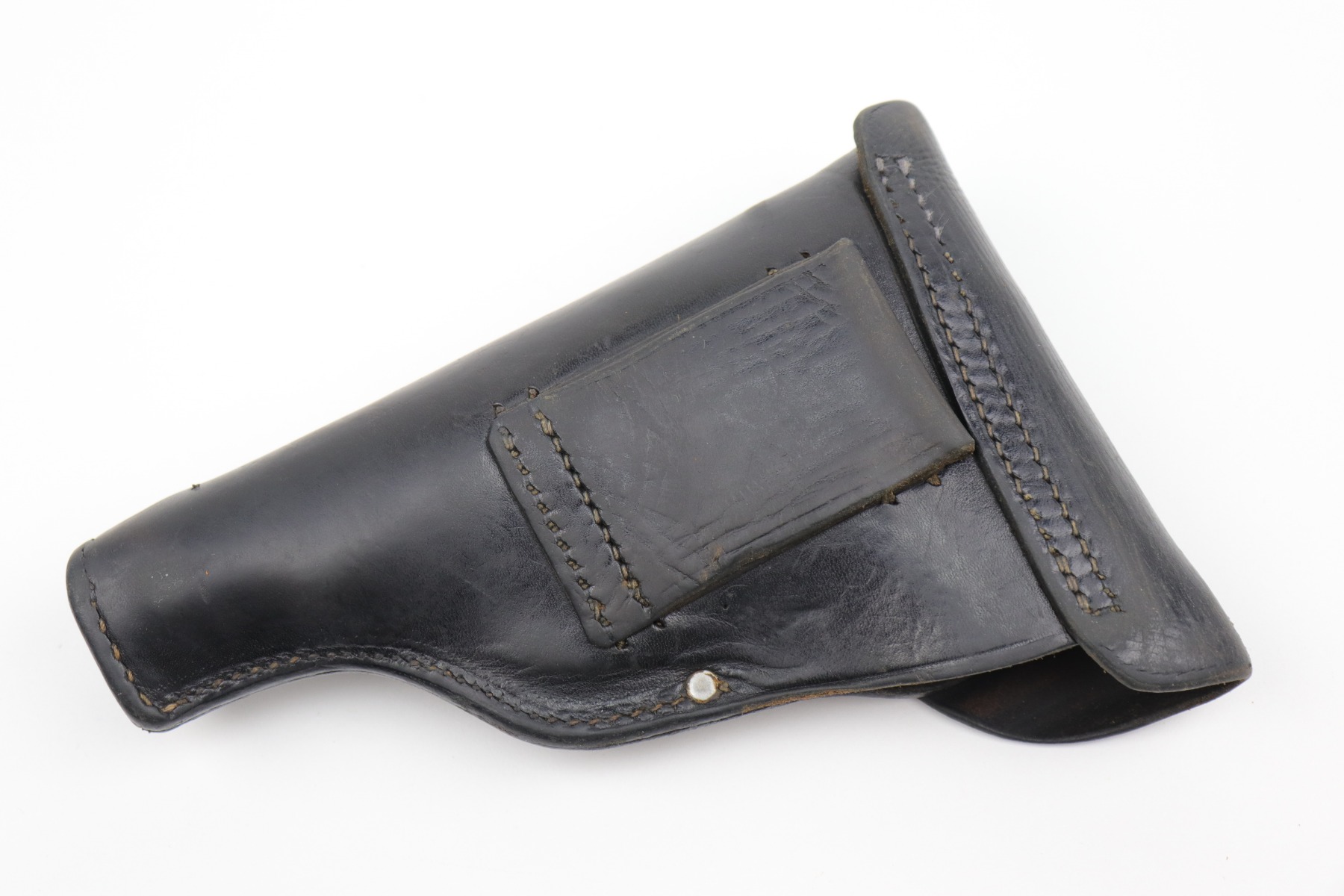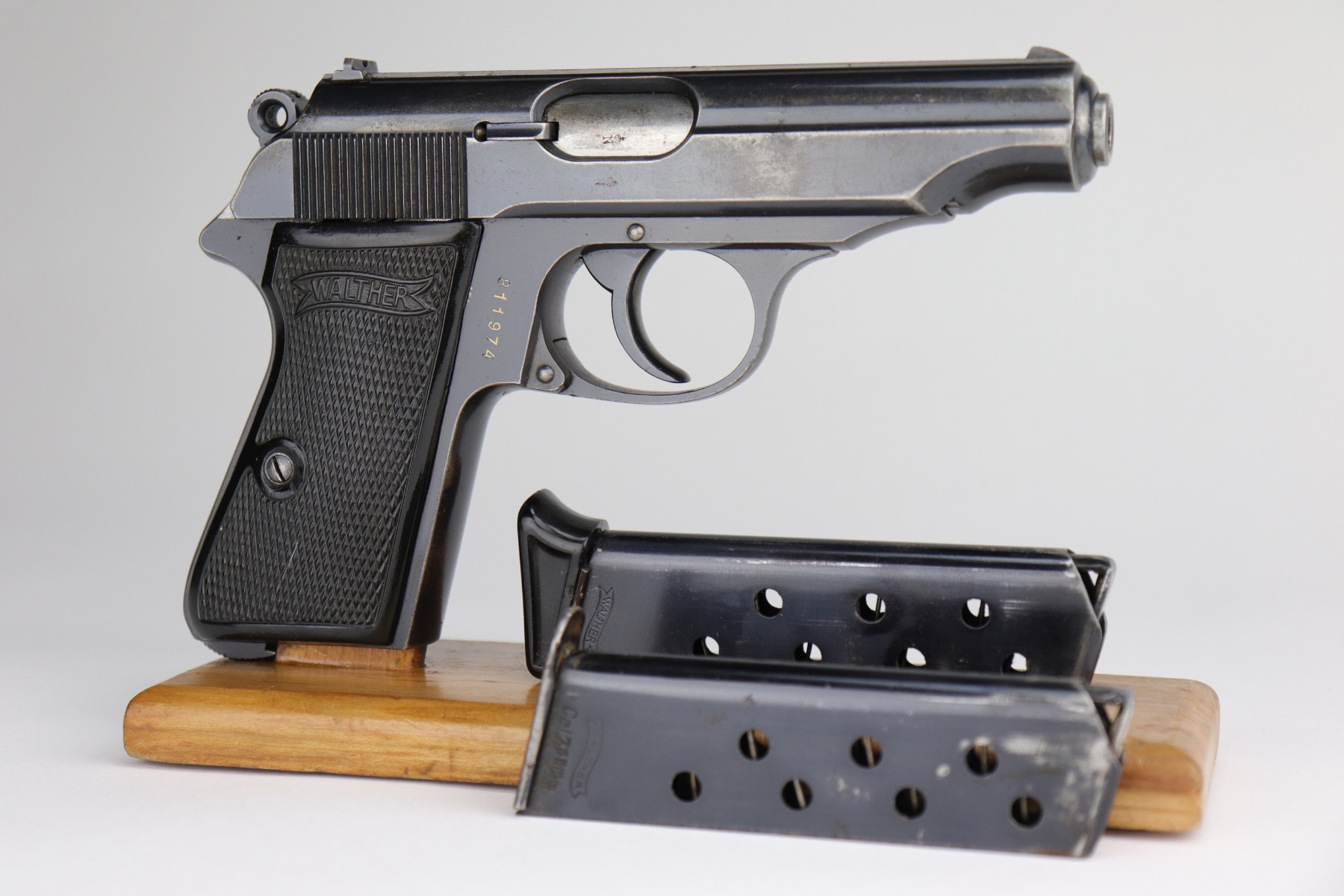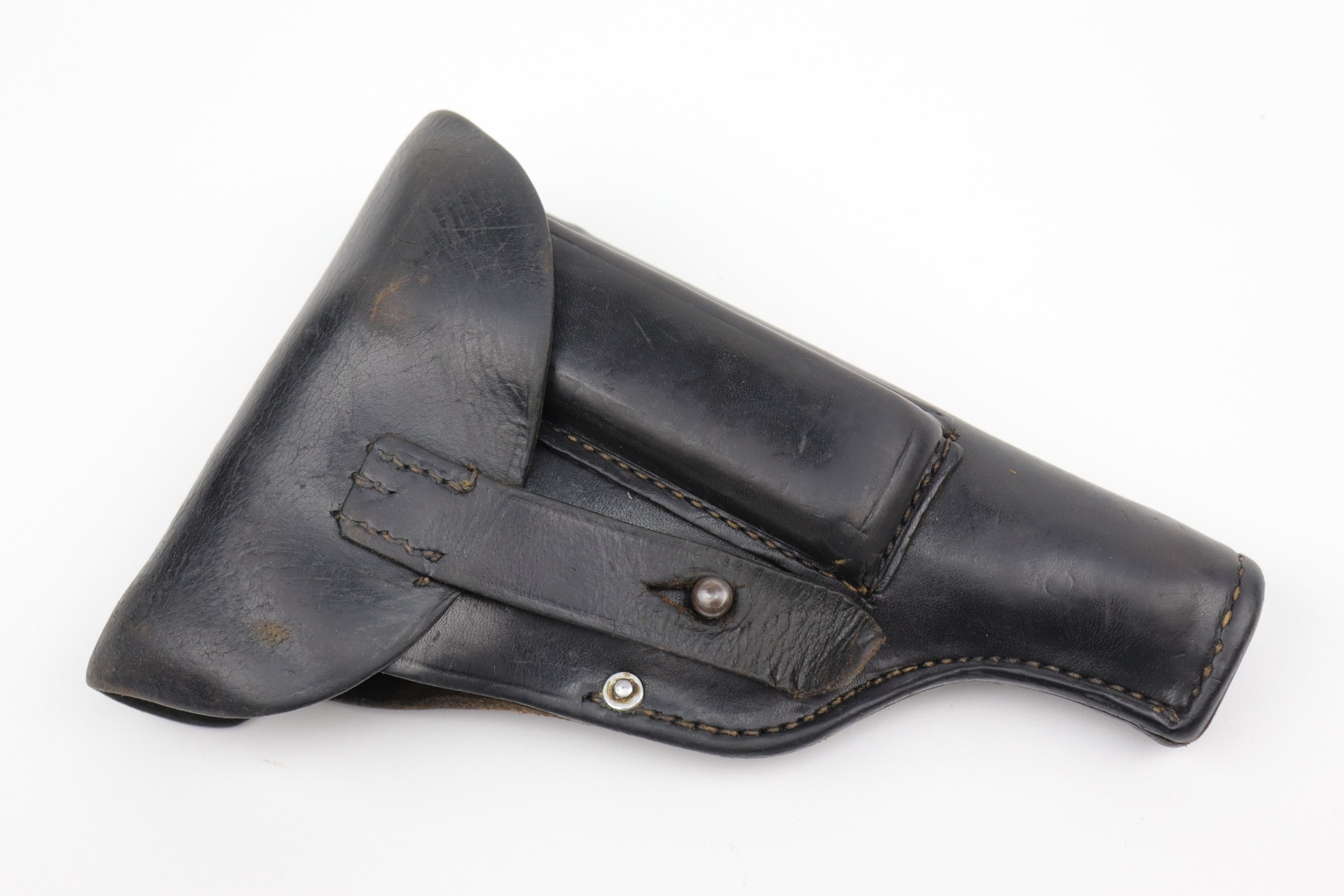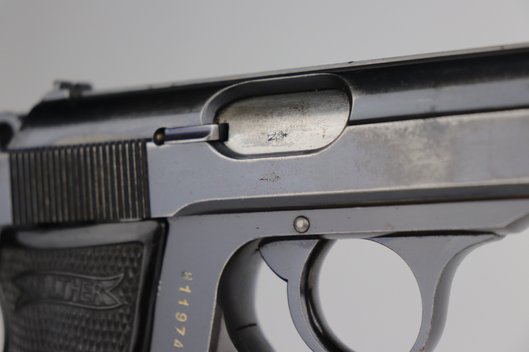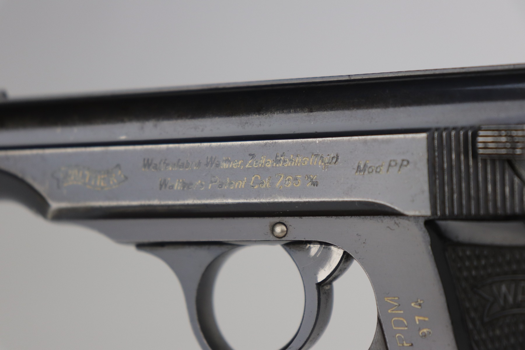 10/15/20 – This is a rare PDM Walther PP Rig, manufactured around 1935. In 1935, Himmler ordered about 1,800 PDM marked PP’s as head of all German Internal Security. PDM stands for Police Department of Munich, and the order was unique for the following reasons. These pistols came with a bottom release magazine, while all other 7.65mm PP’s had a push button mag release. The proper PDM magazine will have no notch for the push button release. These pistols also have a strengthened ‘fluted’ barrel, visible on the muzzle end of the barrel, which a standard PP slide would not fit. This pistol falls in the correct serial range. This gun has retained about 85% of its original bluing. There is muzzle wear, high edge wear on the slide, and spotty wear along the top of the slide, and an area of wear on the right side of the slide. There is also some spotty oxidation on the slide. Minor pin-pricking on both straps. The bore is shiny and minty. The rig comes with a Berlin-marked, 1937-dated black leather holster. It also comes with one finger extension and one flat bottom magazine. The flat bottom mag is notched. The finger extension mag originally did not have a notch (proper) but a crude notch was added.