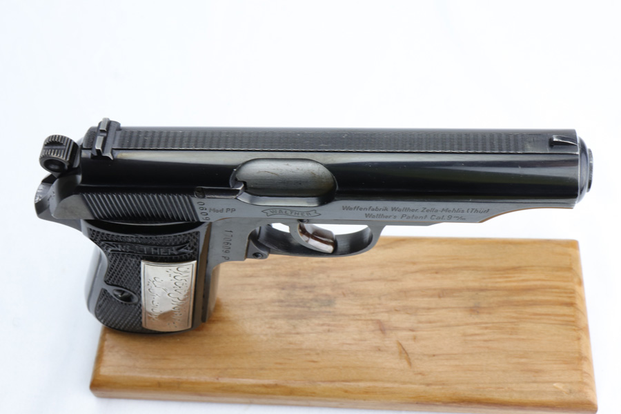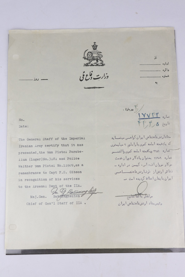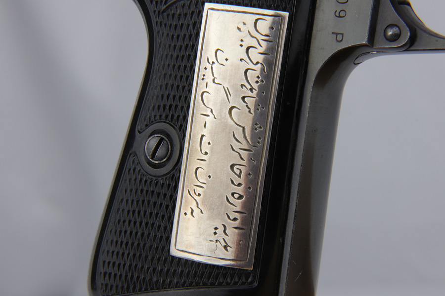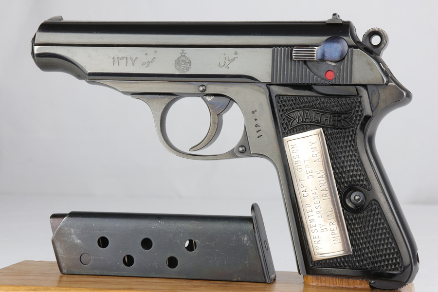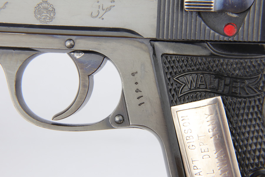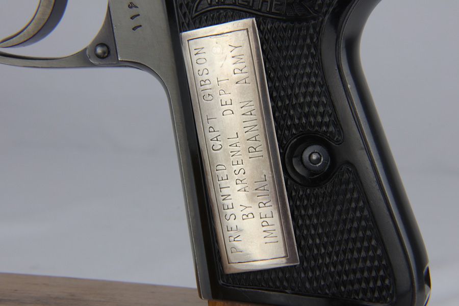 12/6/18 – This is an extremely rare Persian presentation Walther PP, made in 1940 with matching numbered magazine. It is chambered for 9mm with proper bottom release style frame and magazine. After the war, with the US pulling the Iranian government into the US sphere of influence, this gun with grip plaques was presented to Captain FS Gibson. He was heading up a clandestine team of US advisors who were helping to modernize the Iranian Army. The gun is pictured in Jim Rankin’s Walther Book on page 45 of volume II. A copy of the write-up is included, as is the original document declaring the issue of this pistol to Captain Gibson. The original high-polish blue is gorgeous and rates at 97-98% with minor edge and handling wear. Terrific bore.