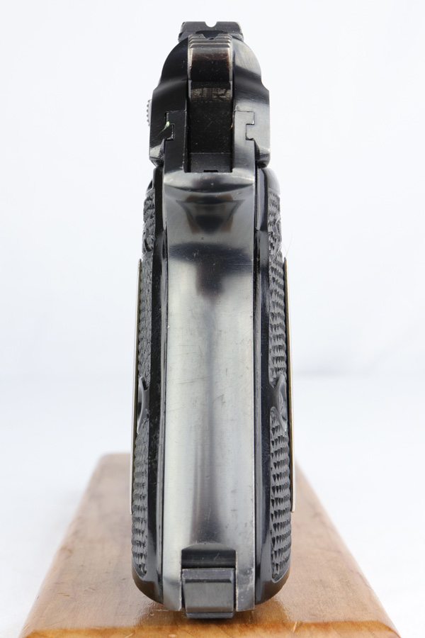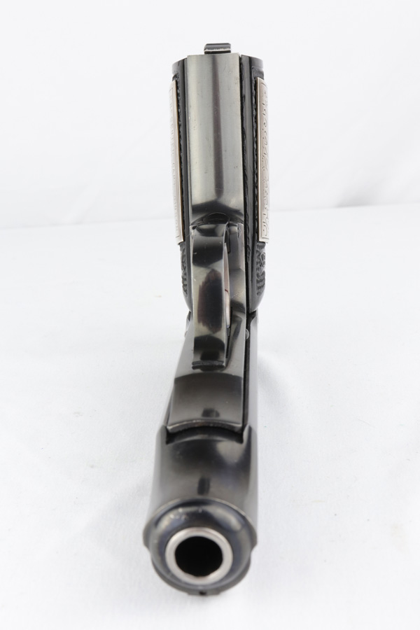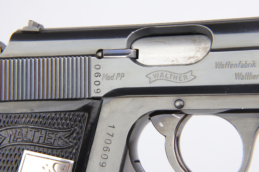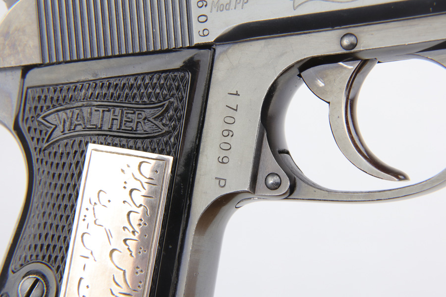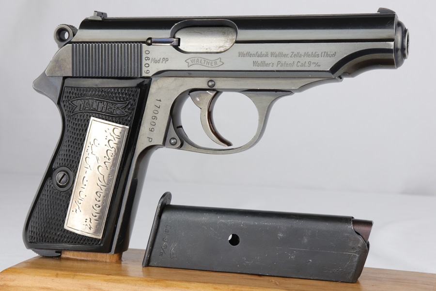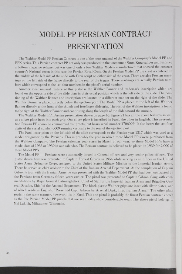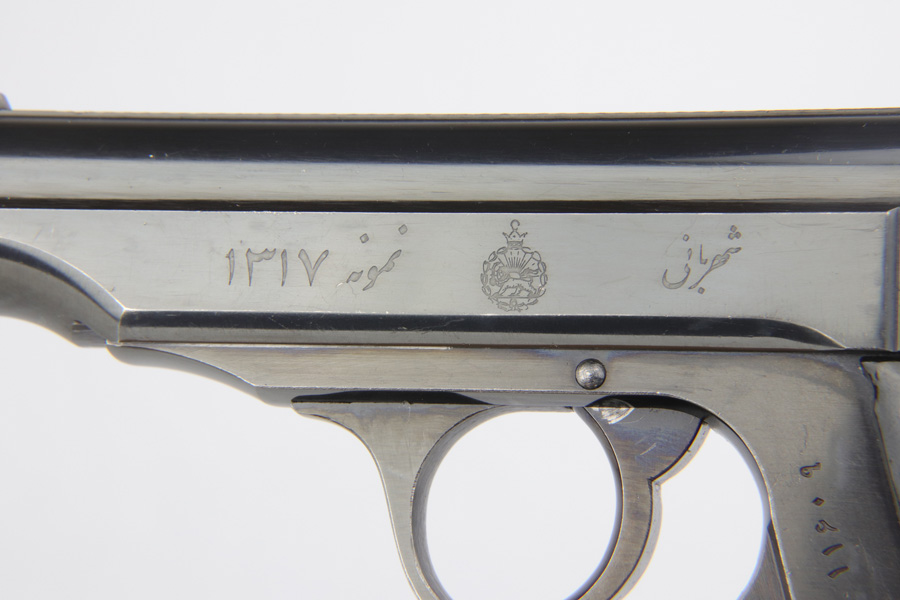 12/6/18 – This is an extremely rare Persian presentation Walther PP, made in 1940 with matching numbered magazine. It is chambered for 9mm with proper bottom release style frame and magazine. After the war, with the US pulling the Iranian government into the US sphere of influence, this gun with grip plaques was presented to Captain FS Gibson. He was heading up a clandestine team of US advisors who were helping to modernize the Iranian Army. The gun is pictured in Jim Rankin’s Walther Book on page 45 of volume II. A copy of the write-up is included, as is the original document declaring the issue of this pistol to Captain Gibson. The original high-polish blue is gorgeous and rates at 97-98% with minor edge and handling wear. Terrific bore.