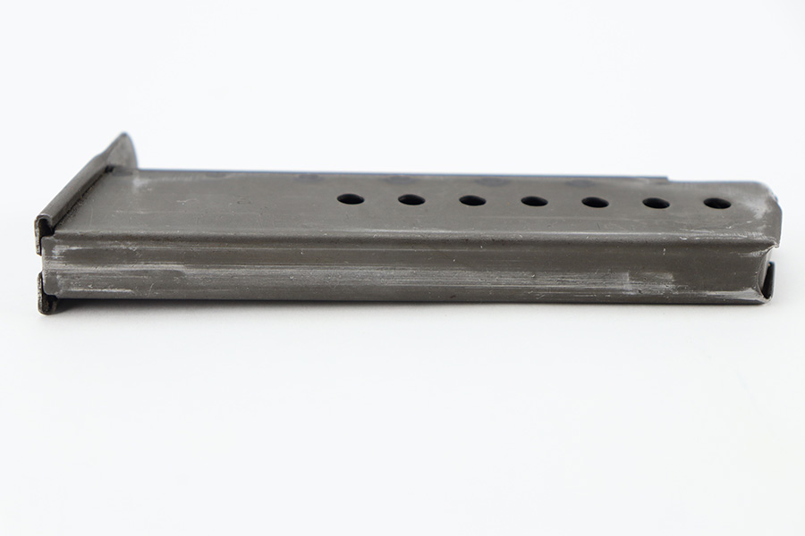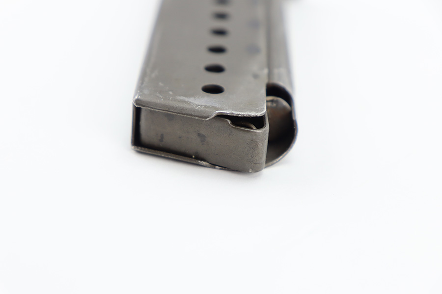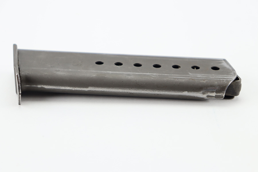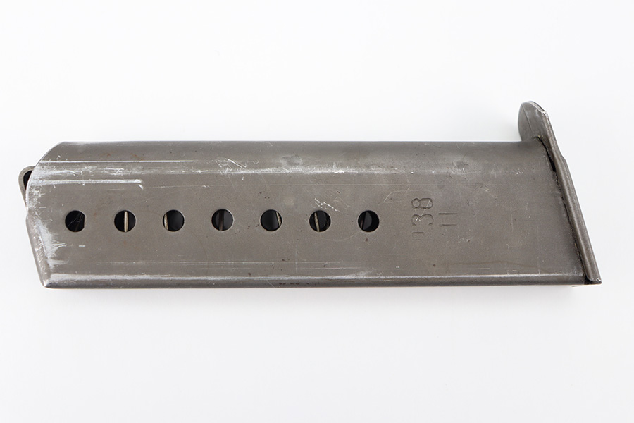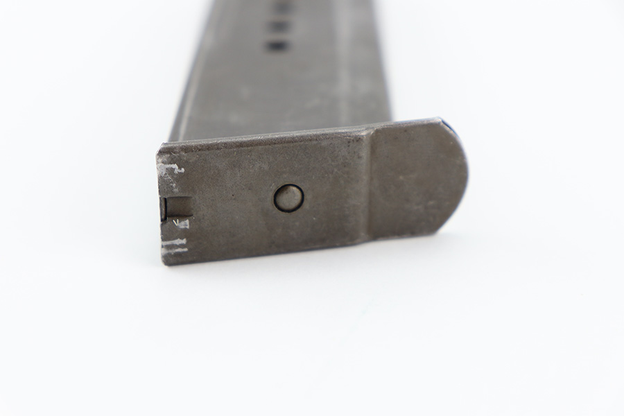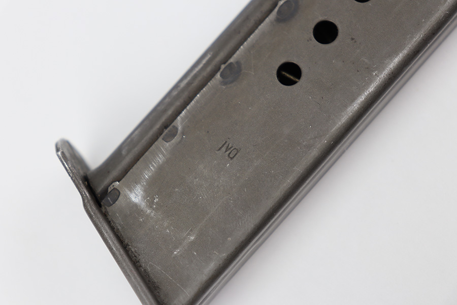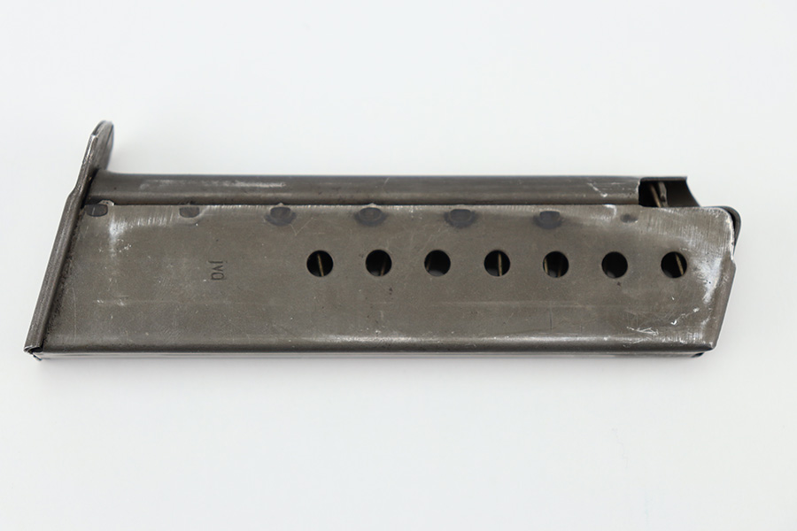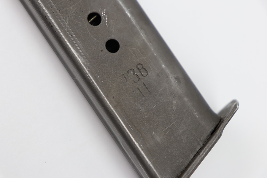 11/16/23 – This is a rare, late WW2 production P.38 magazine with a phosphate finish. The magazine has light surface wear and finish loss but no rust or pitting and is in near-excellent overall condition. The right side of the tube is P.38 U stamped, for unhardened metal. The left side of the tube is maker stamped by jvd. Strong, fully functional spring.