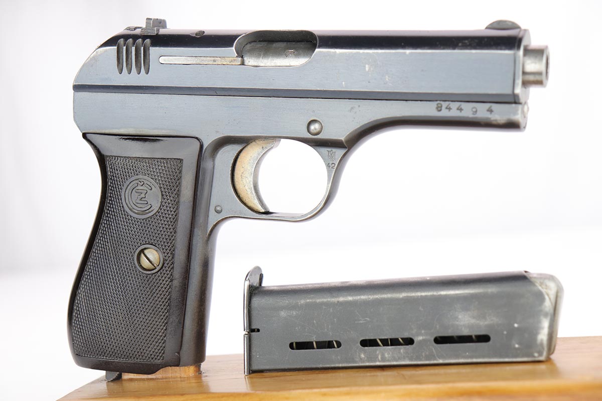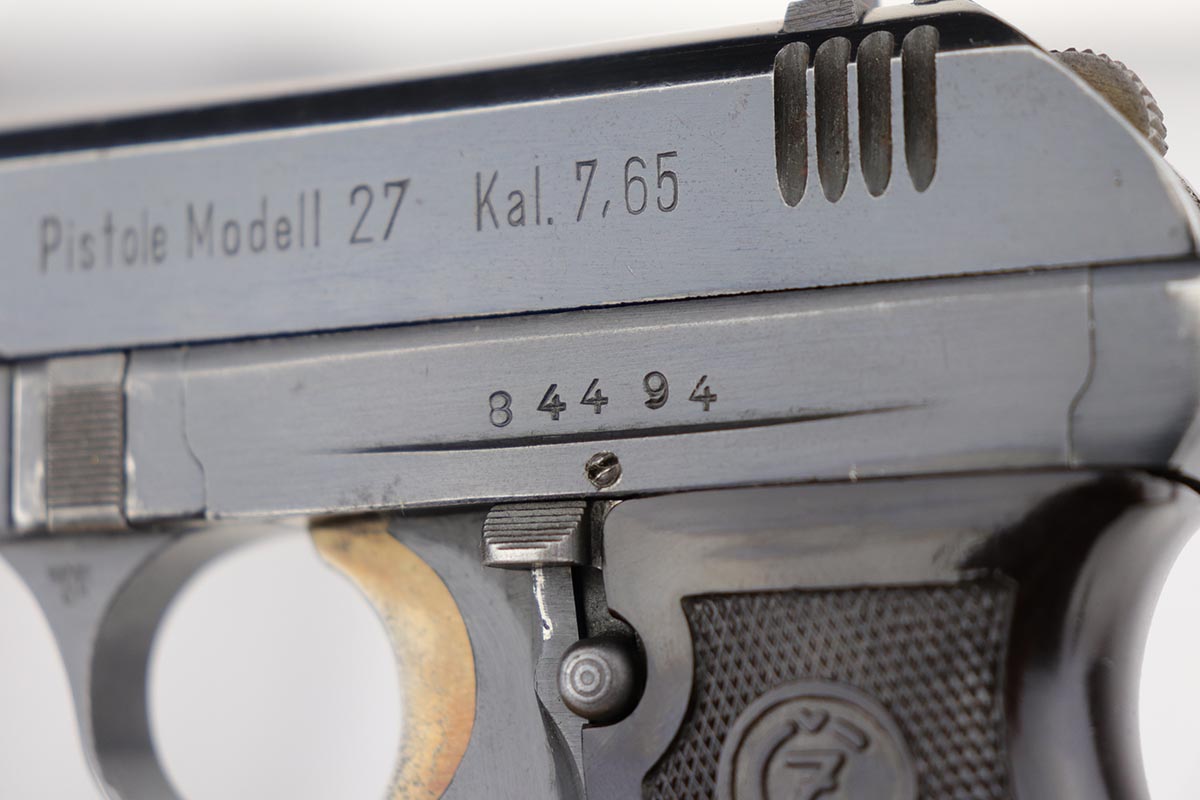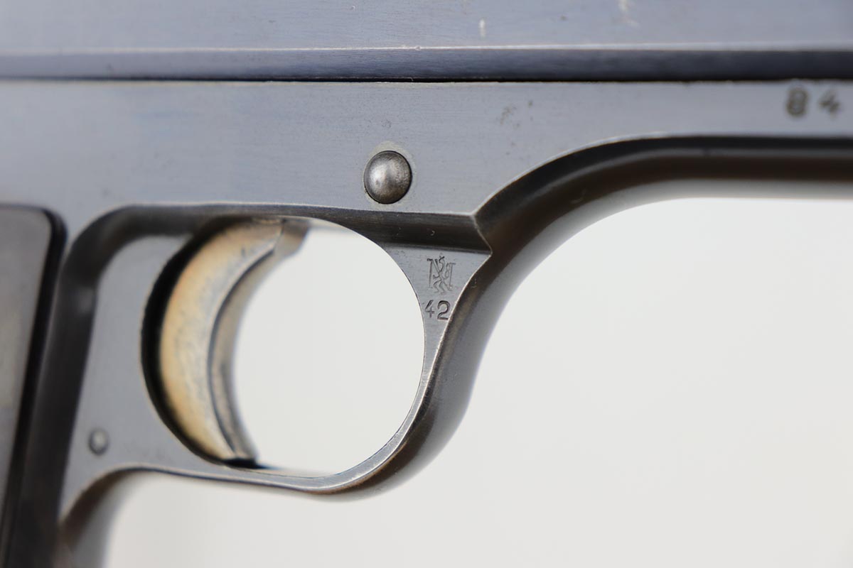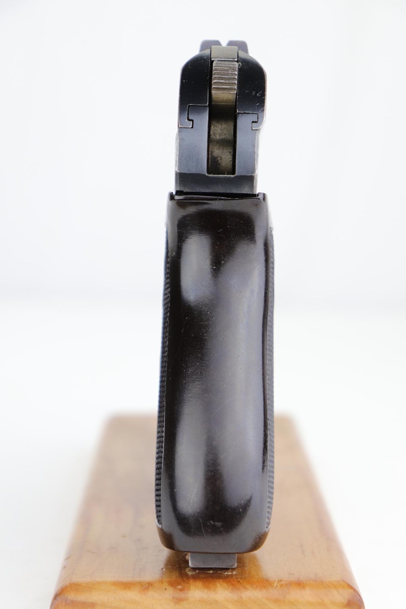 2/20/20 – This is a rare CZ model 27 that was made in 1942 and issued to the German Police. It’s one of only ~5,500 produced with high-polish blue and police marking on left side of frame. This pistol also has a matching numbered magazine, which is done so in the police style. The pistol has a very nice profile but most of the thinning is on the front strap. Mint bore. Grip has the common chips in the bottom, front corners.