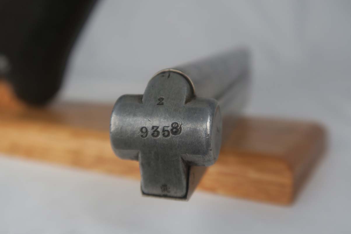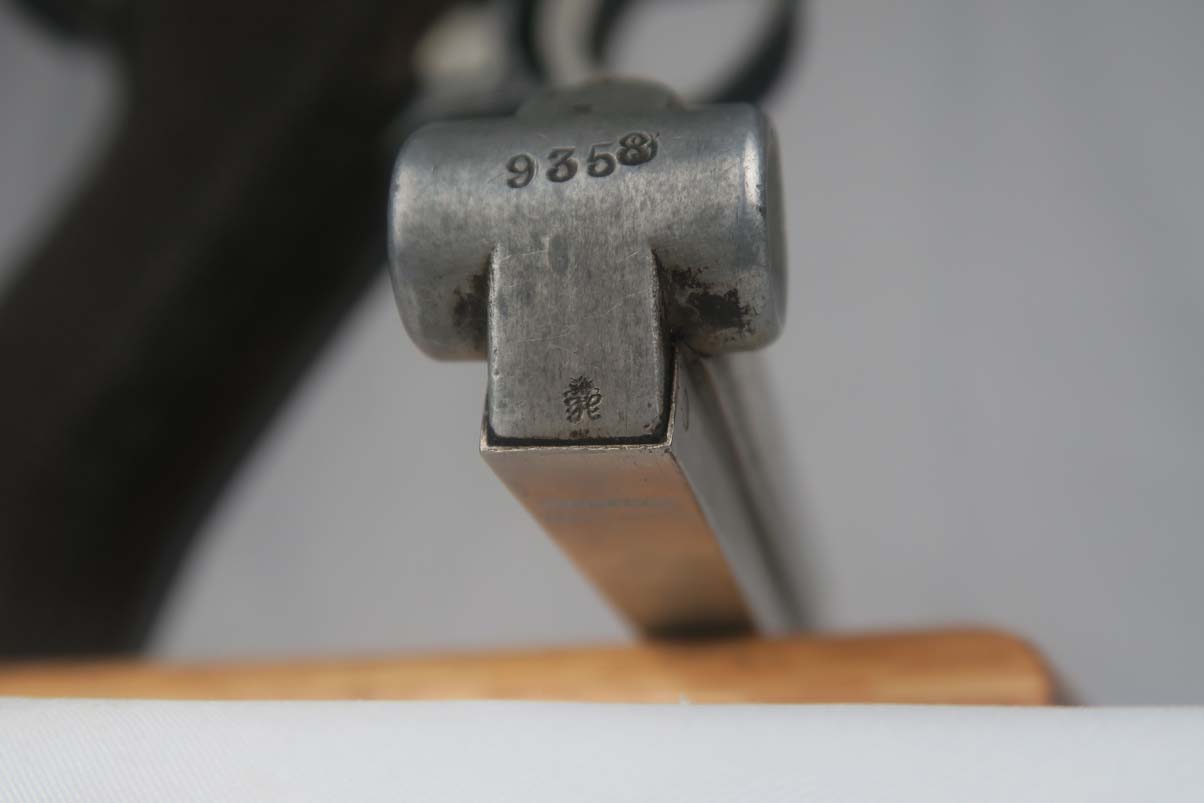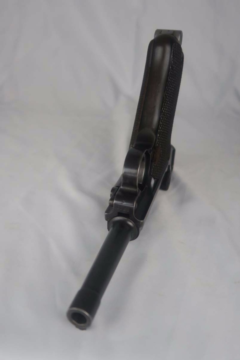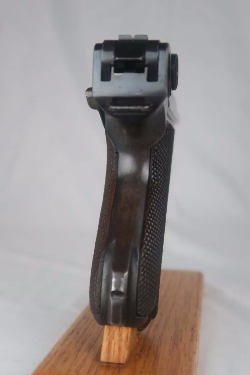 1/18/18 – This is a very rare gun as it is a G Date (1935) Luger that was issued to the German Police during the Nazi era.  Only 600 were issued.   While it has the Eagle 63 military proofs, the sear safety over the sideplate indicates that it was diverted to the police.  The style of the magazine numbering also indicates police issue.  These magazines were numbered in the police arsenal which is why it has the #2 over the serial and the police proof under it.  The finish is original and rates about 90%.   The straw color on the small parts is almost completely discolored.   The bore is a bit frosted but still pretty strong.  I would rate it about a 6 out of 10.   All parts are matching including the hold open and firing pin.  The grips are not numbered but seem original to the gun due to the fit and wear pattern. The gun functions well.