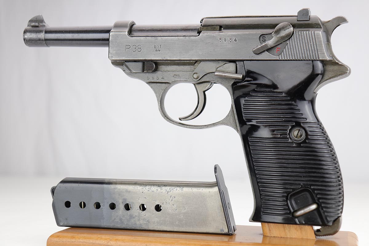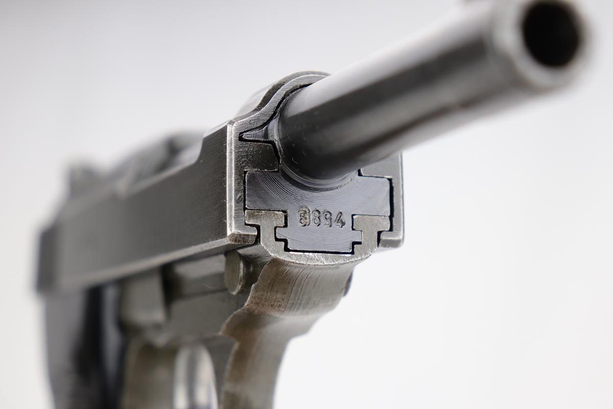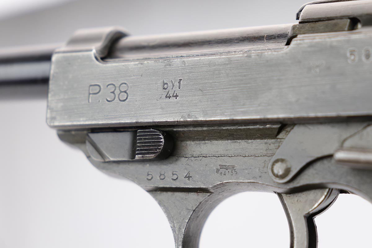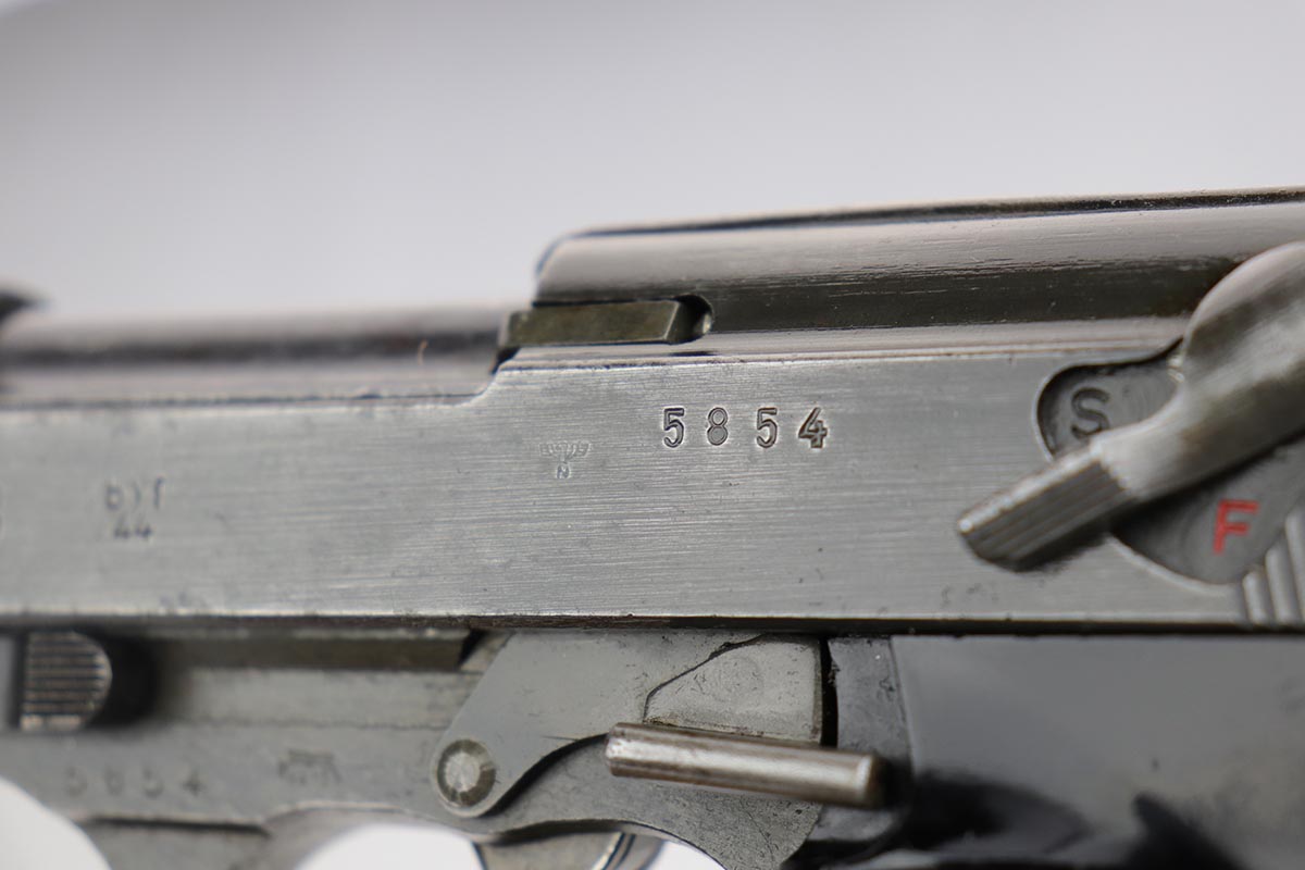 12/19/19 – This is a rare police-issued Mauser P.38 from November of 1944. It’s one of only 1,500 produced with Eagle over F proof on right side of slide. Pistol is all matching and original, but there is a fair amount of thinning to the finish, most notably on the front strap. The left side of slide and firing pin cover also have some finish loss. Excellent grips. Mauser magazine. Bore has decent rifling but some frost and freckling throughout.