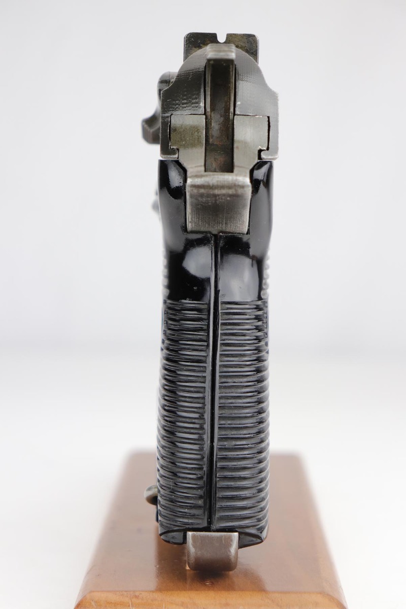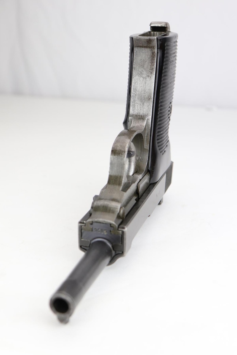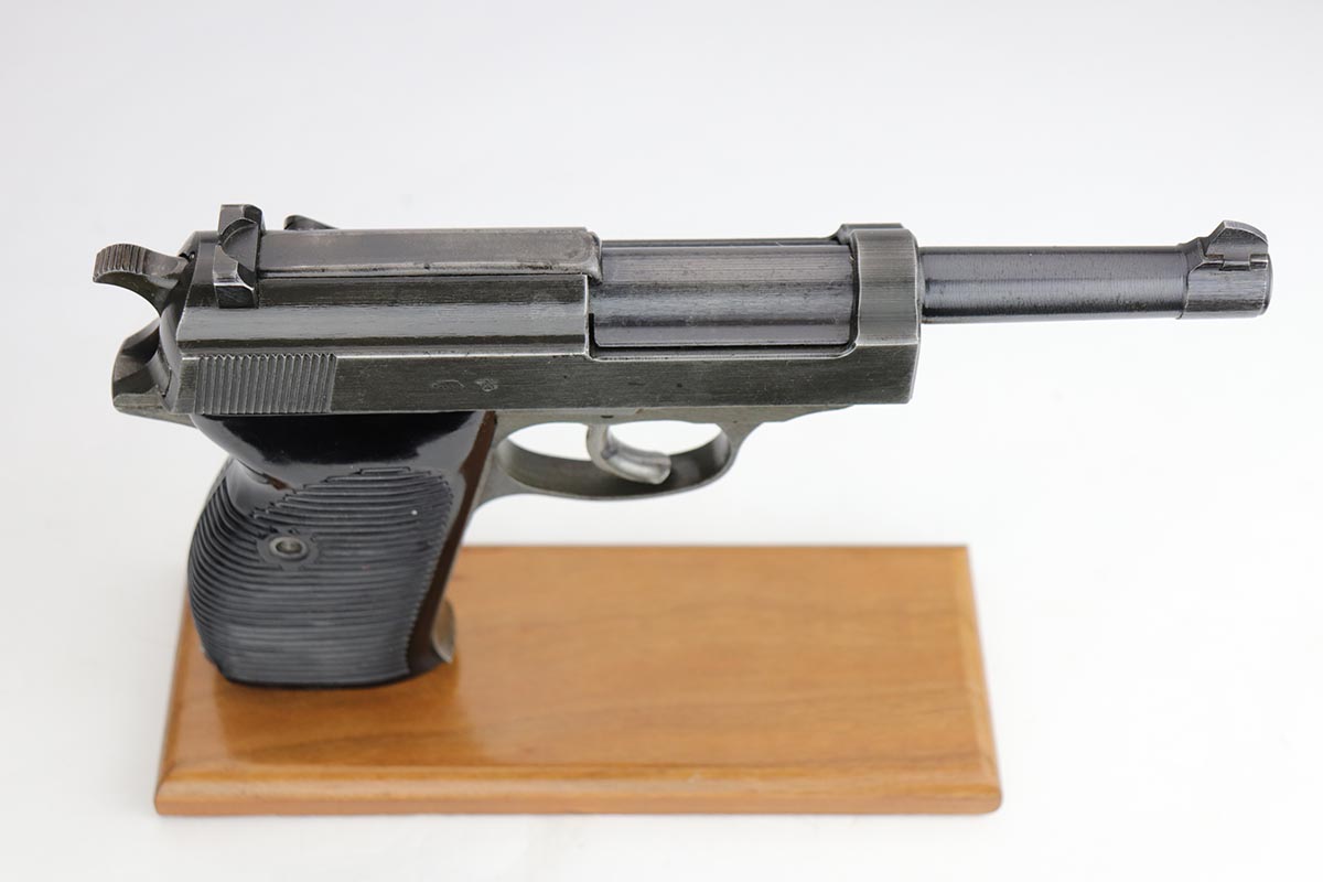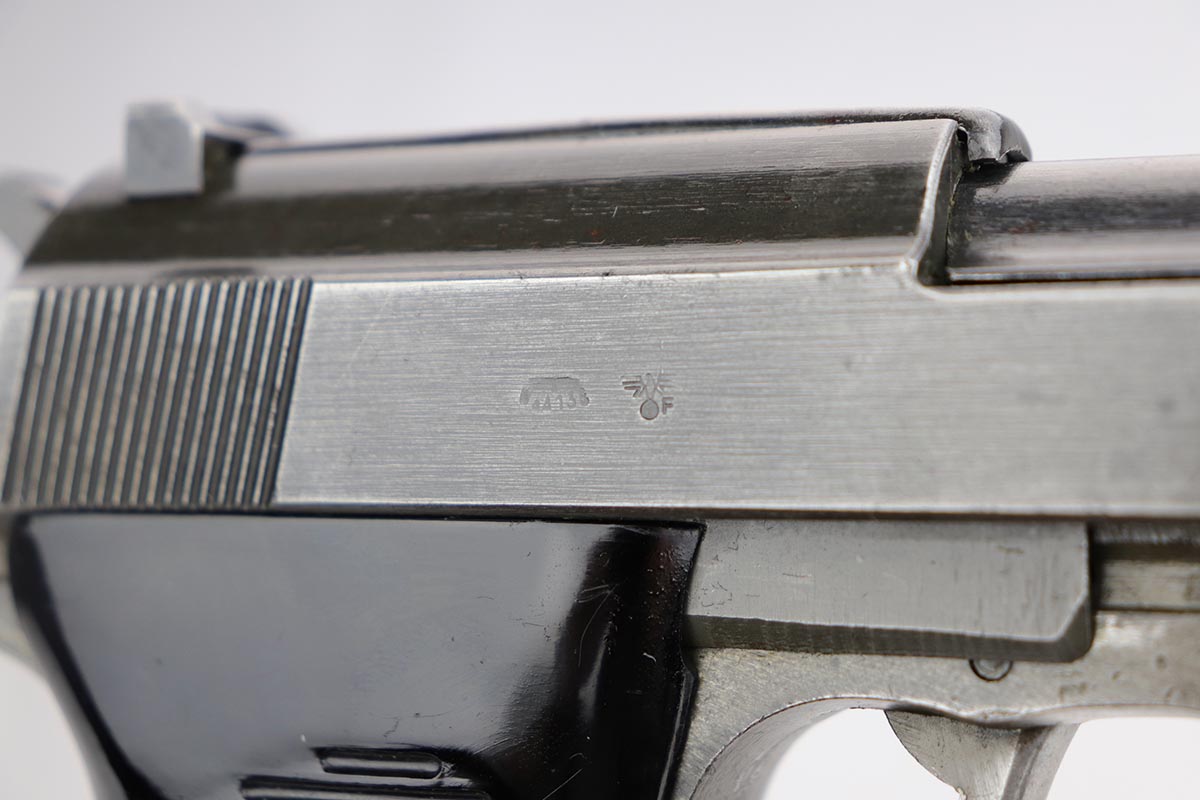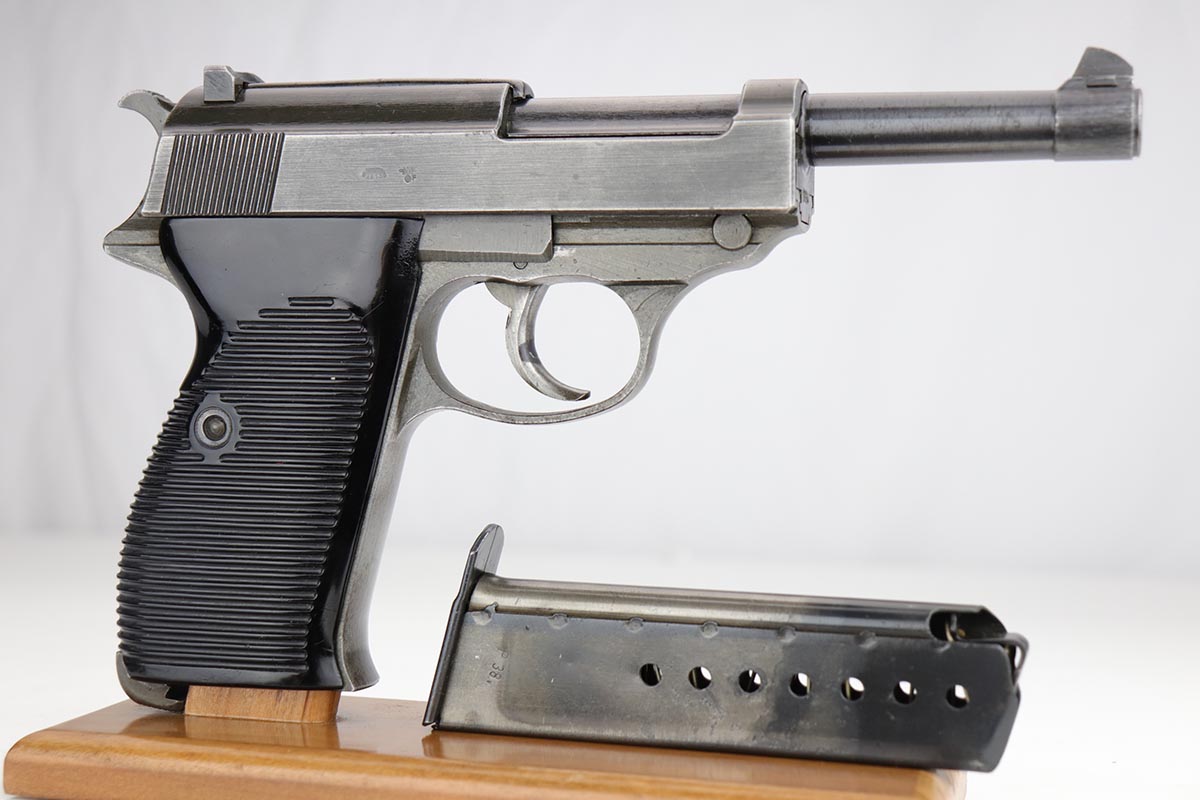 12/19/19 – This is a rare police-issued Mauser P.38 from November of 1944. It’s one of only 1,500 produced with Eagle over F proof on right side of slide. Pistol is all matching and original, but there is a fair amount of thinning to the finish, most notably on the front strap. The left side of slide and firing pin cover also have some finish loss. Excellent grips. Mauser magazine. Bore has decent rifling but some frost and freckling throughout.