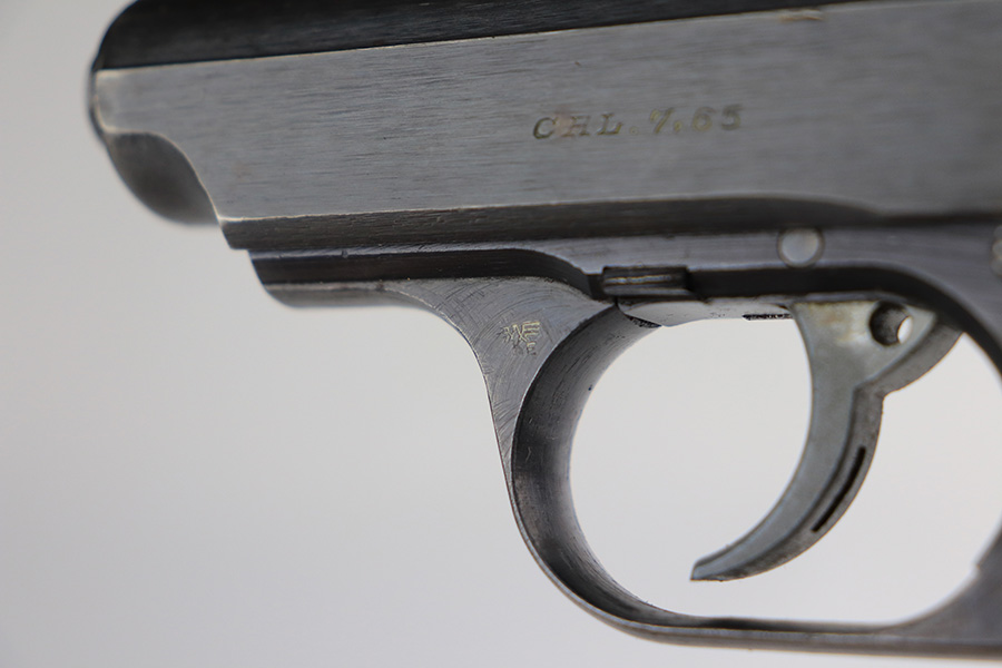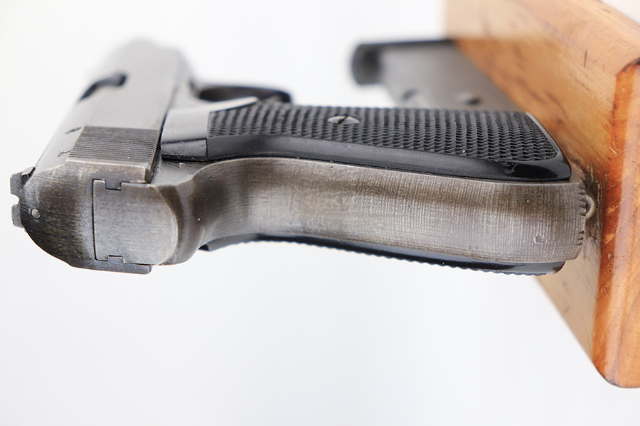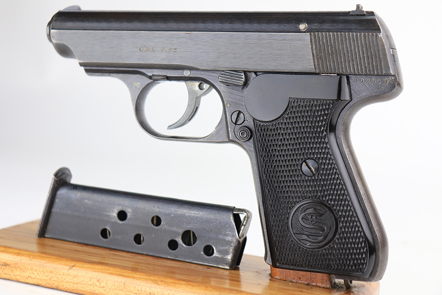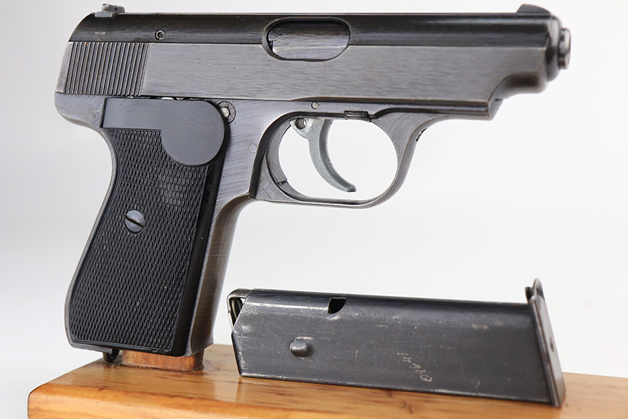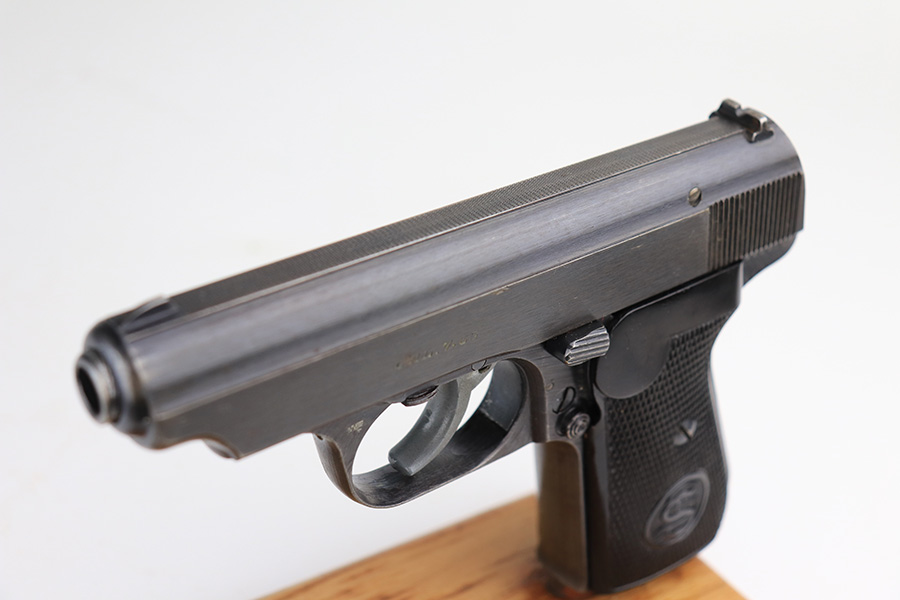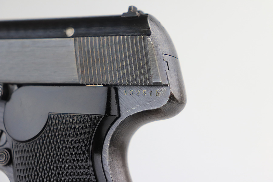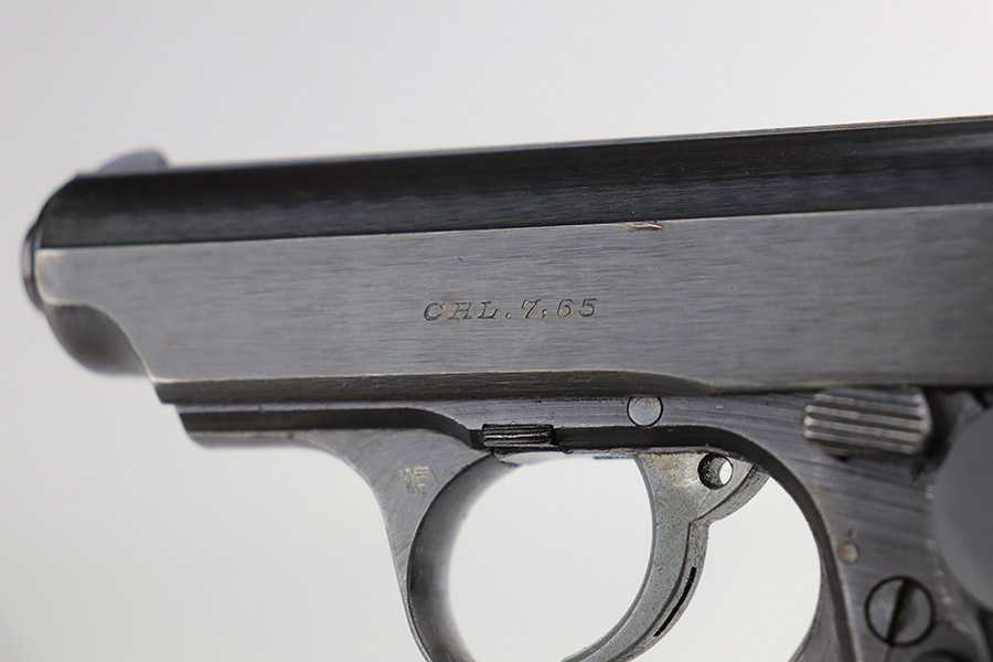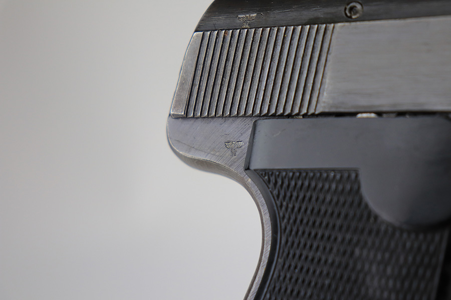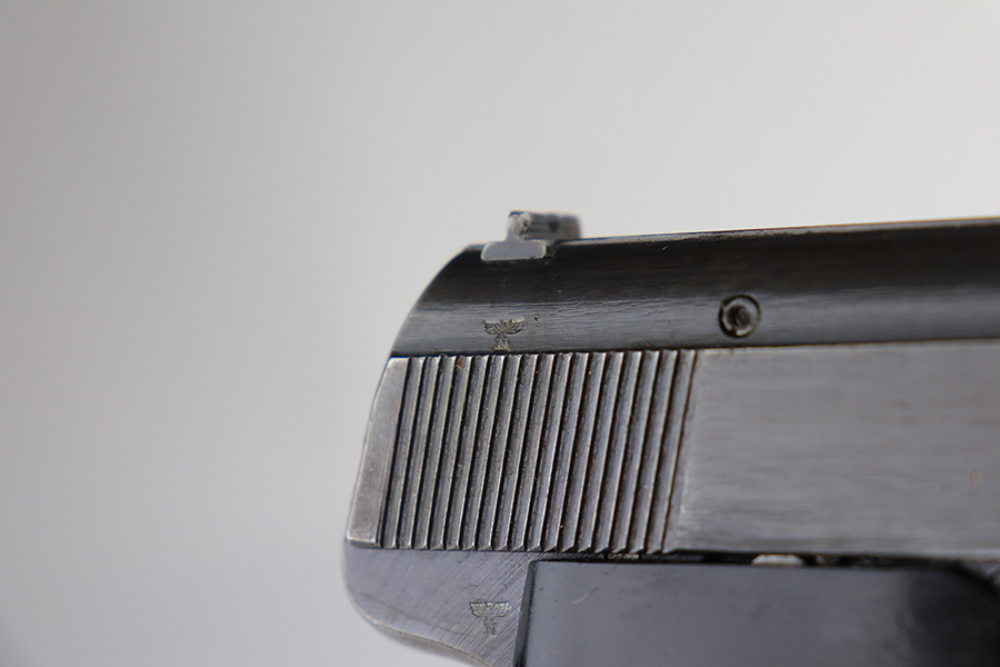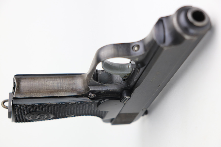 1/14/22 – This is a rare, original Sauer 38h pistol with Eagle/F on frame. One of only 7,500 produced, it has a very nice profile but some patina and thinning to the grip frame. Mint bore, hardly looks used. Nice, original grips with only minor handling wear on the right panel. Police added a lanyard ring on the base of the frame. Half-moon magazine.