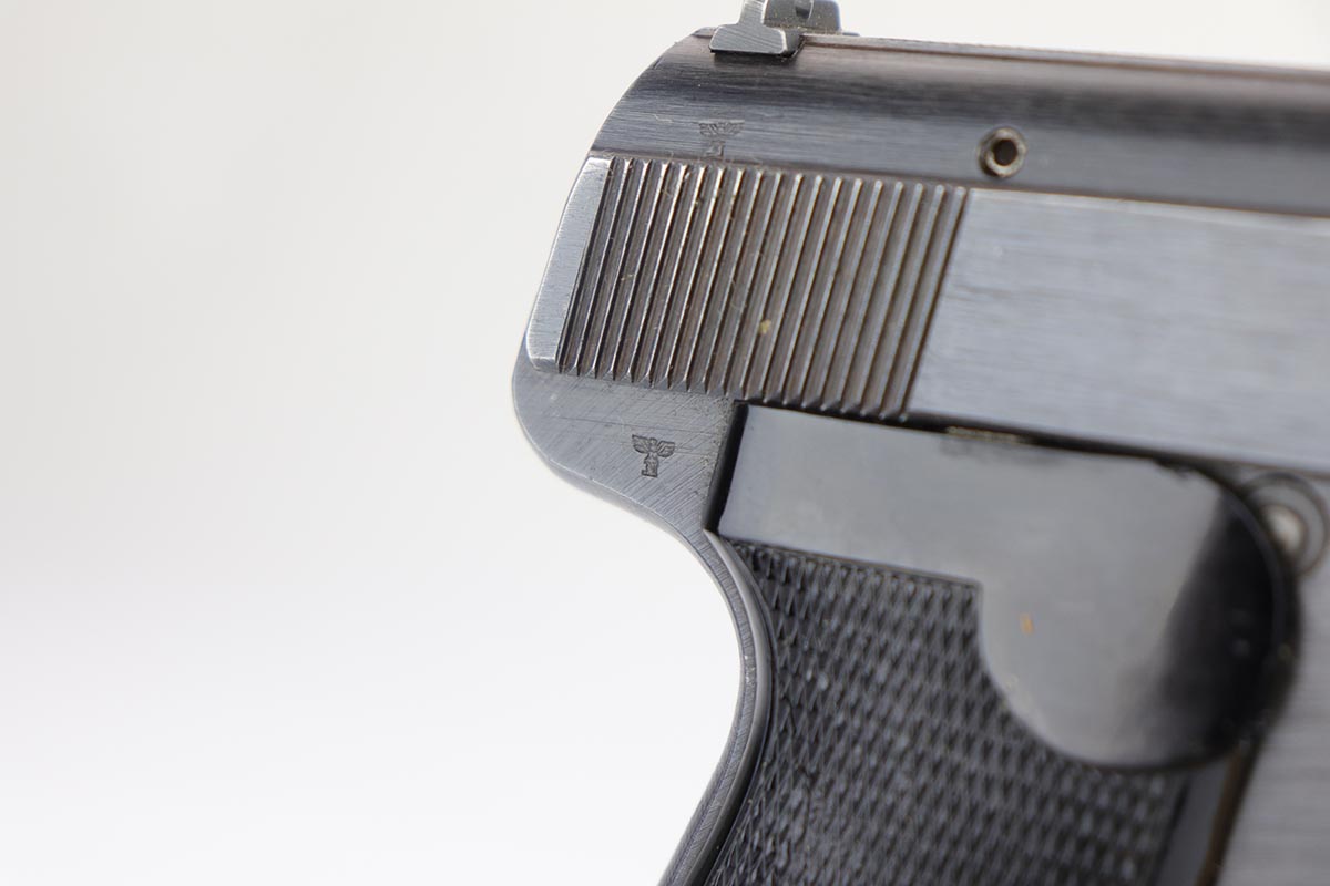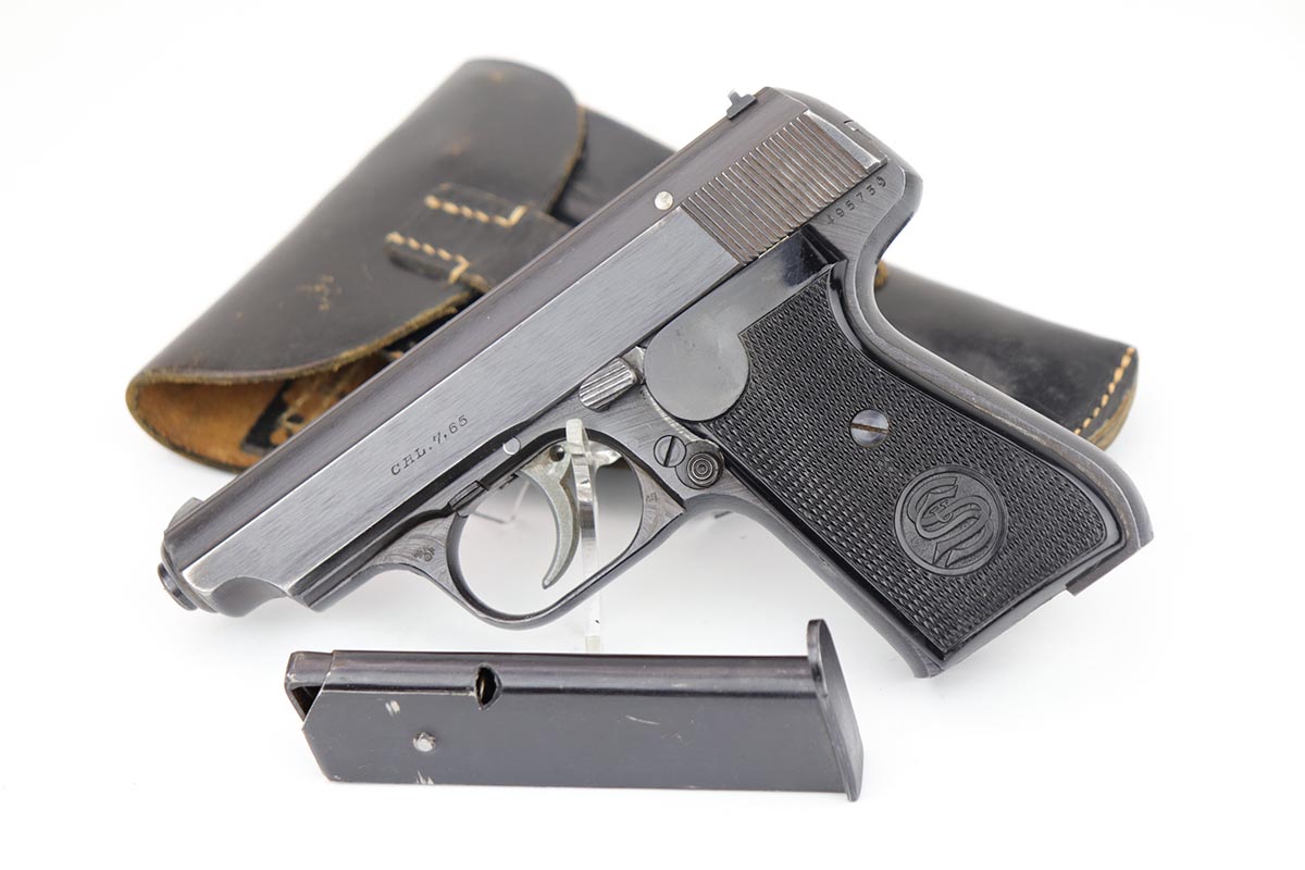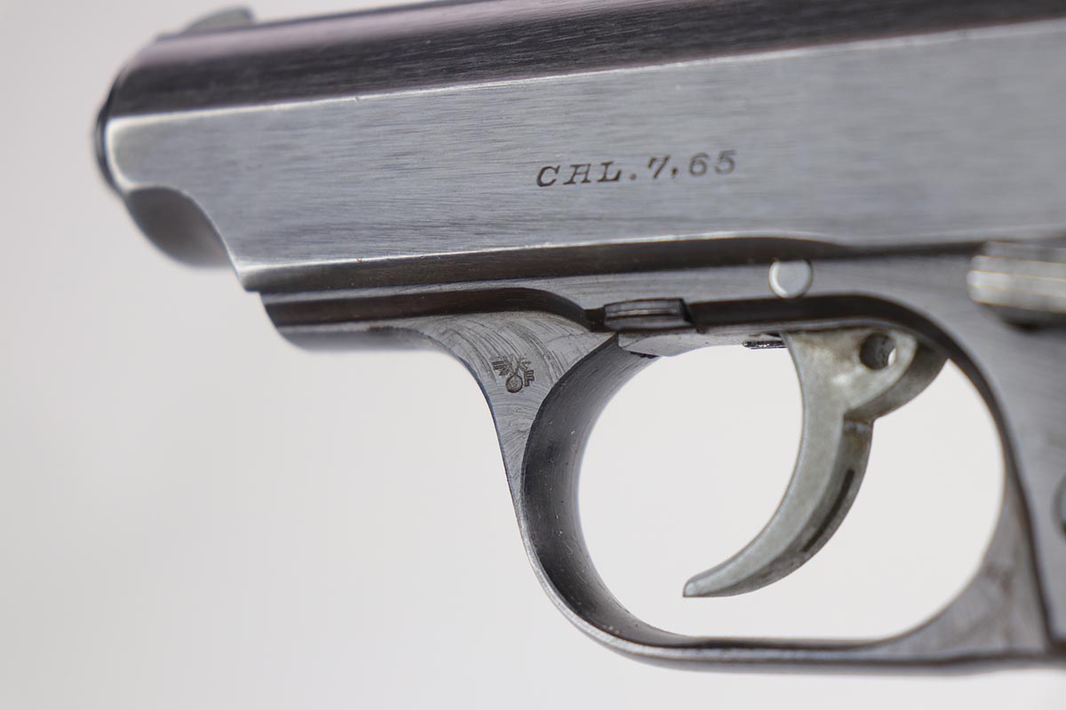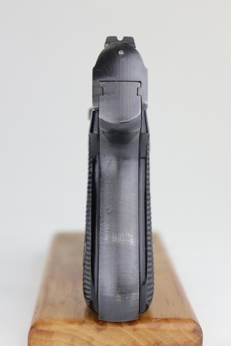 3/5/20 – This is a very nice example of a rare Police Sauer 38h. It’s one of only 7,500 produced with Eagle over F marking on frame, which makes it the most rare Police Sauer 38h variation. It has 96-97% military blue left, with standard muzzle wear on each side, and a bit of thinning on the trigger guard and back strap. Mint bore and nice grips, though they do show some handling wear, mostly on the right panel. Comes with a police style holster.