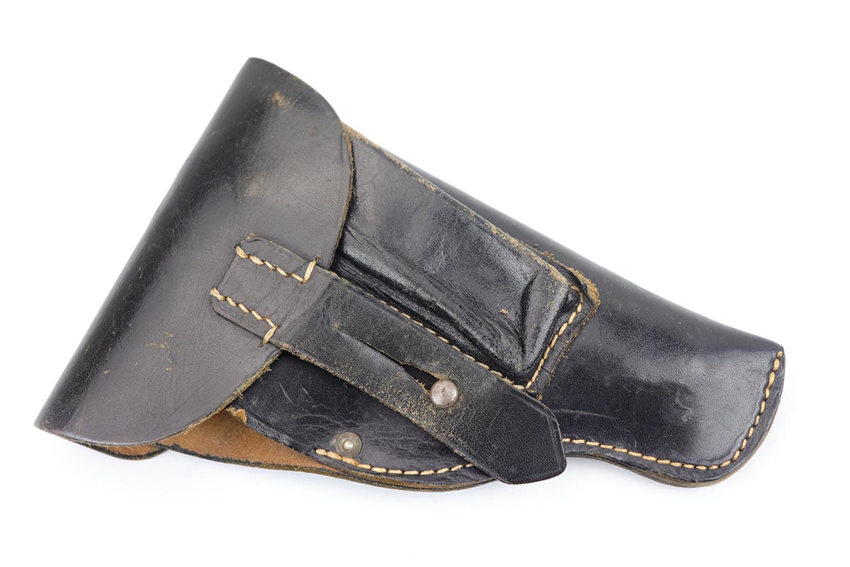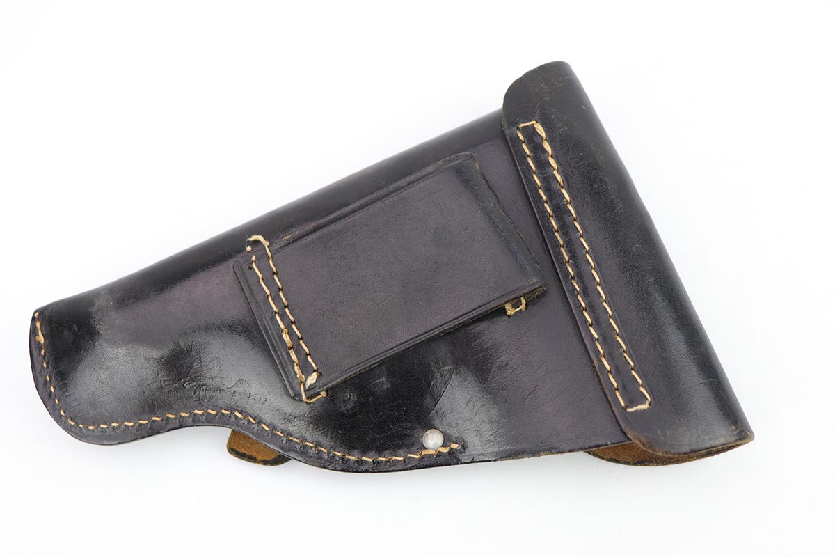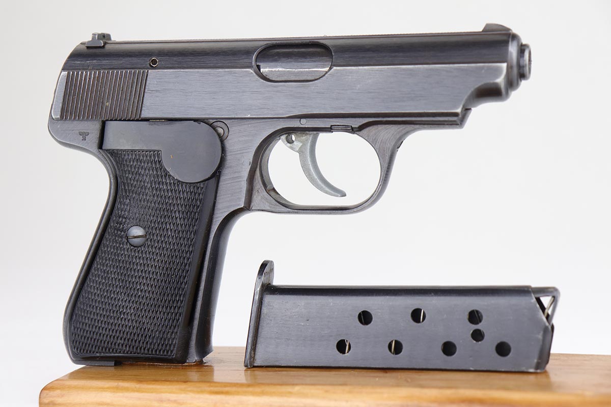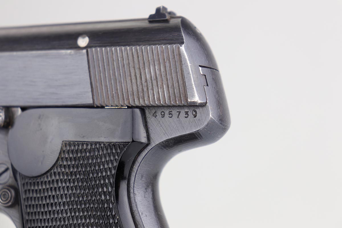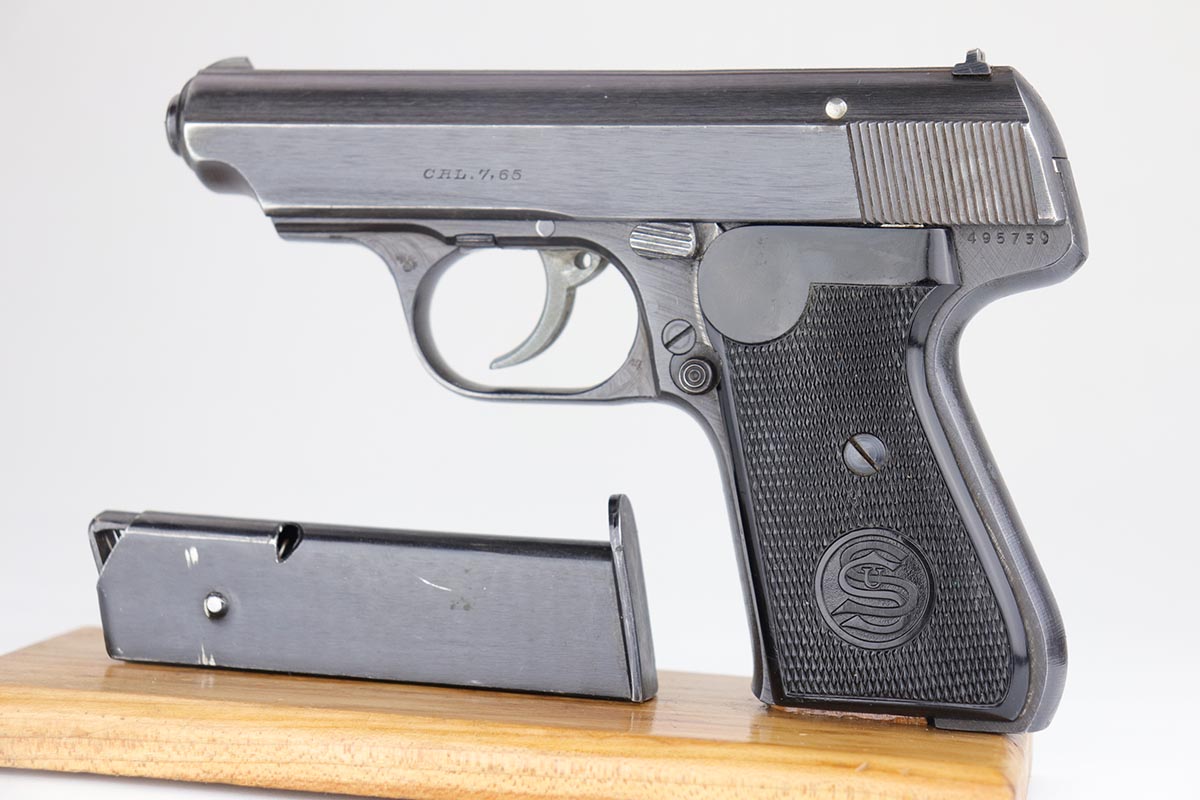 3/5/20 – This is a very nice example of a rare Police Sauer 38h. It’s one of only 7,500 produced with Eagle over F marking on frame, which makes it the most rare Police Sauer 38h variation. It has 96-97% military blue left, with standard muzzle wear on each side, and a bit of thinning on the trigger guard and back strap. Mint bore and nice grips, though they do show some handling wear, mostly on the right panel. Comes with a police style holster.